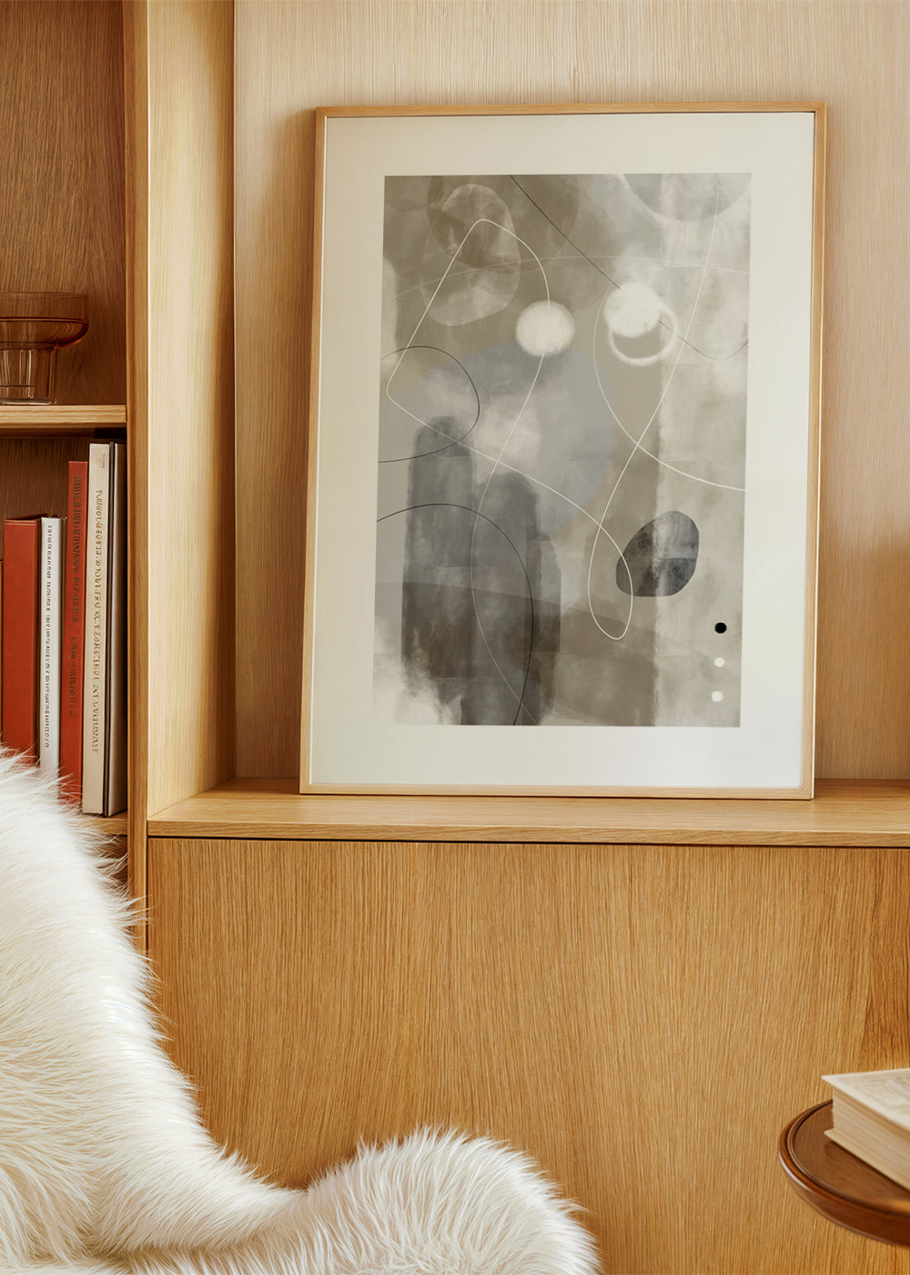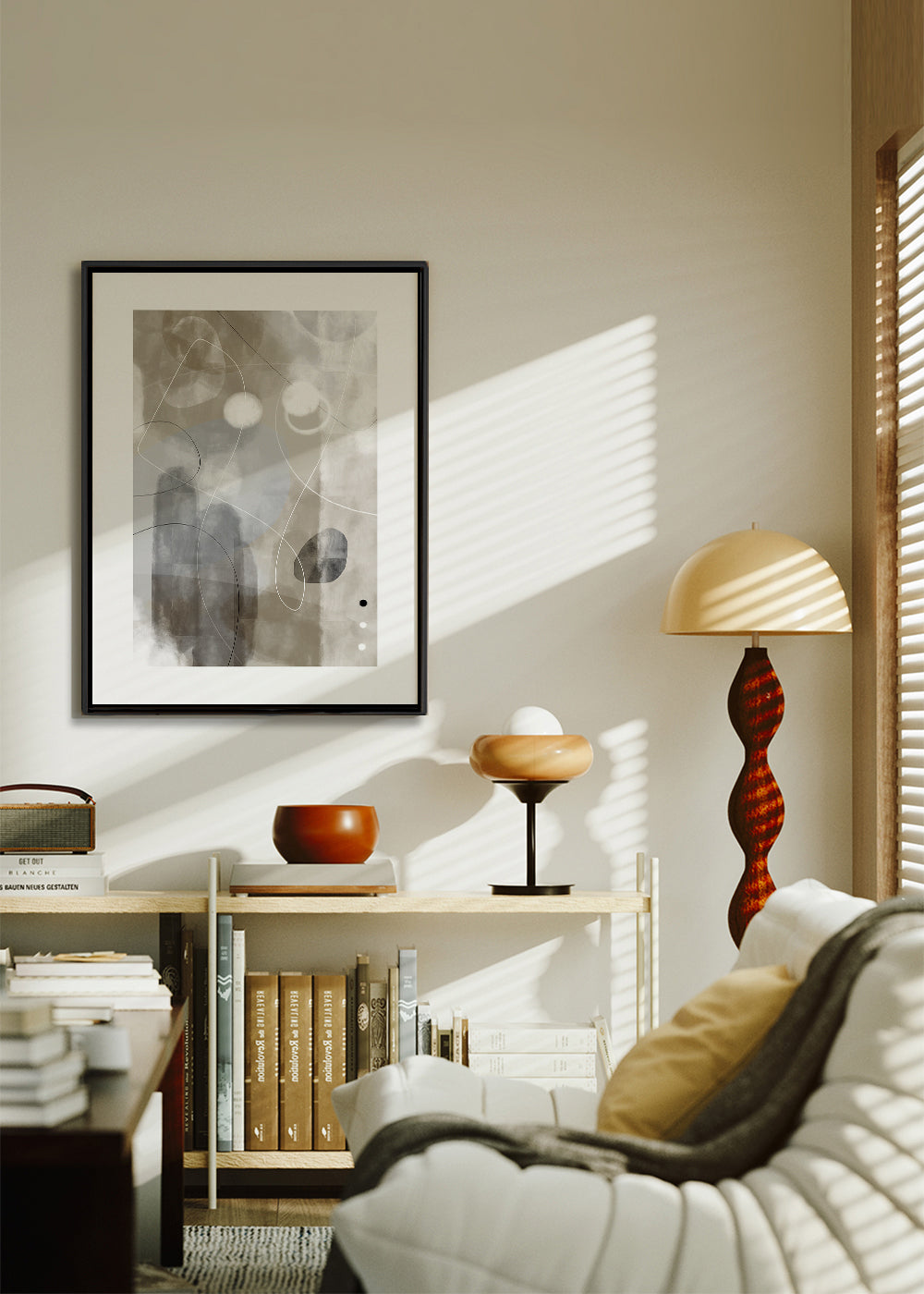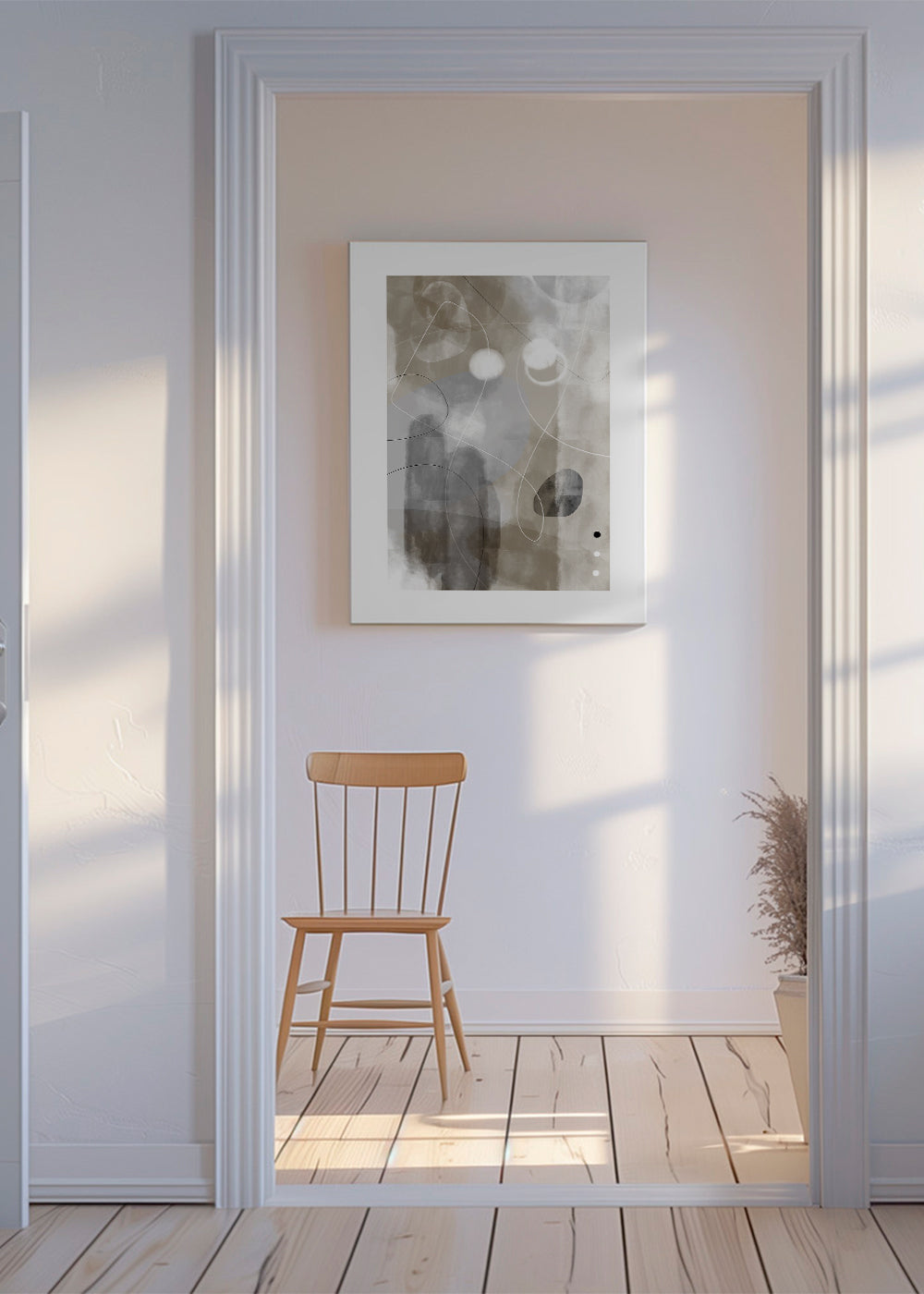 Esta obra de nuestro repertorio de cuadros abstractos, con matices de colores grises, y ideal para poner en posición vertical. Los cuadros abstractos son ideales para crear espacios singulares y creativos. Crea el ambiente perfecto. Esta obra incluye un margen blanco que enmarca el diseño para potenciar su estilo.