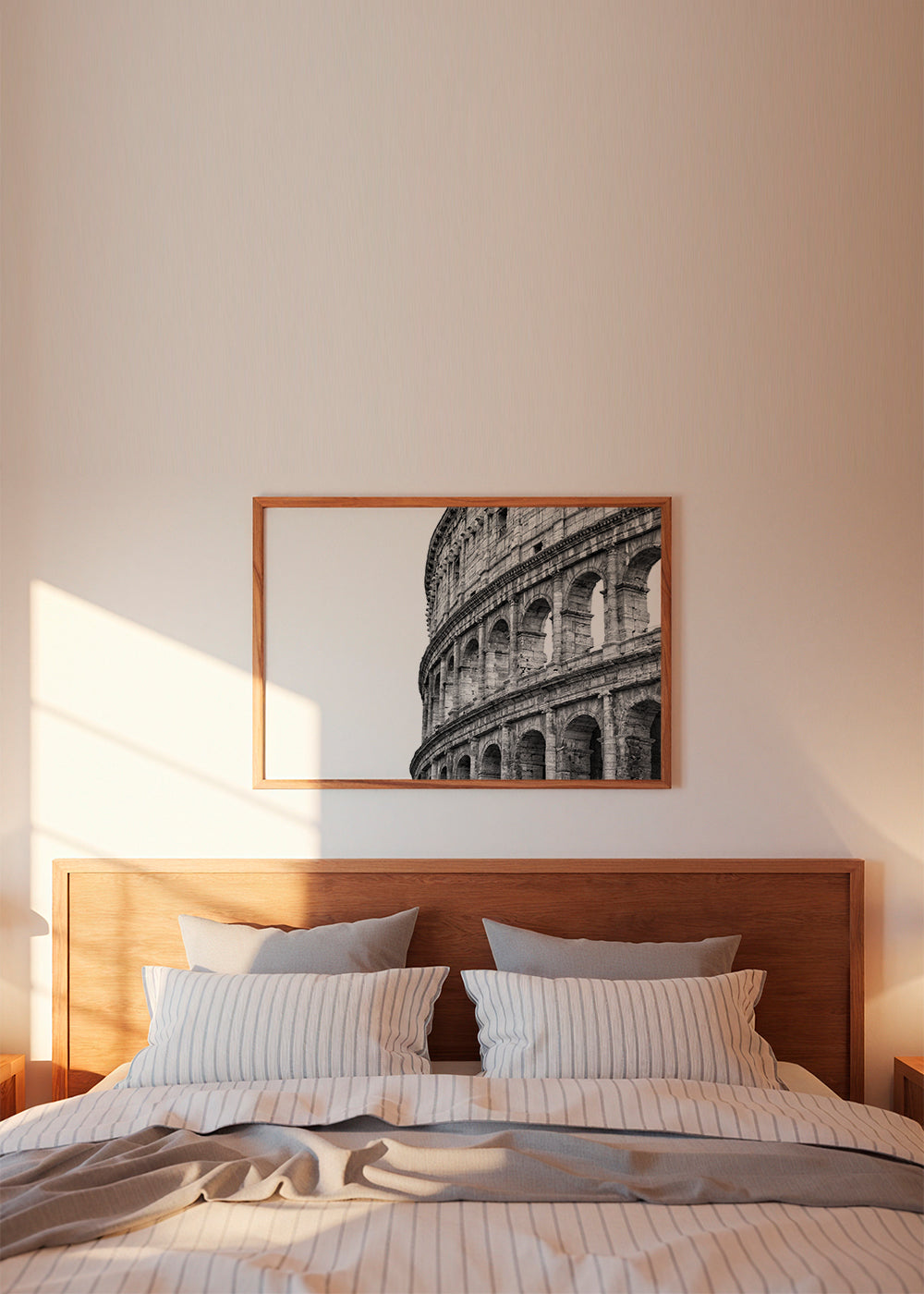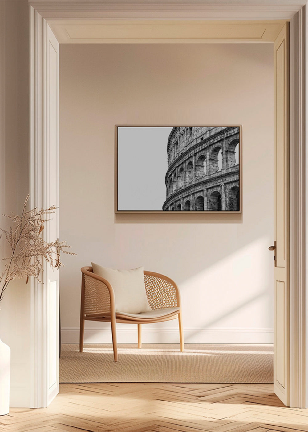 Lámina decorativa de una fotografía en blanco y negro en la que aparece el Coliseo romano de Roma, italia.
