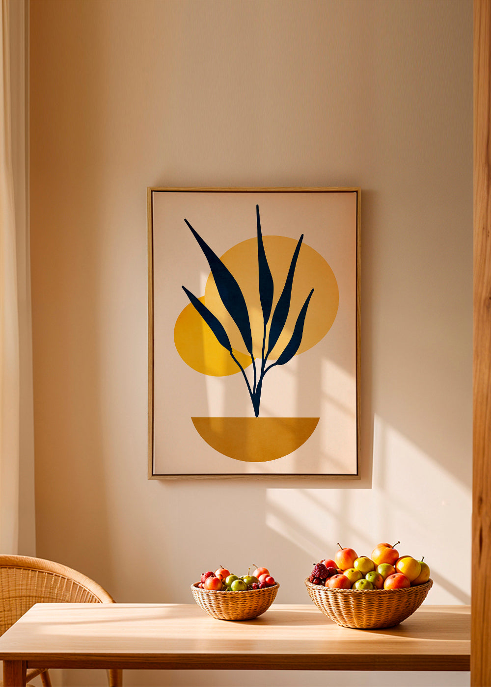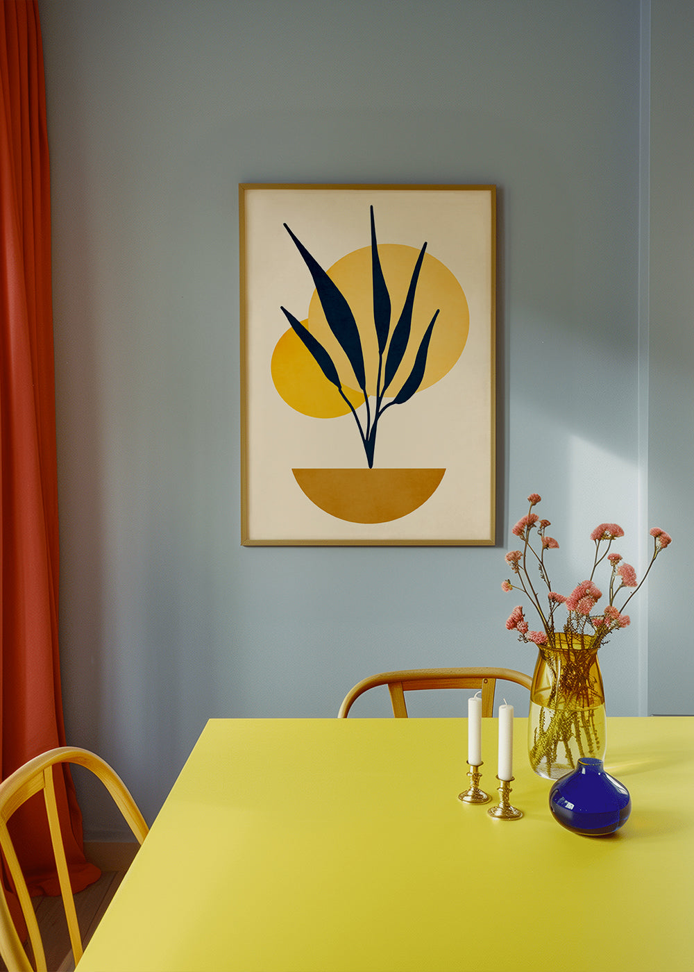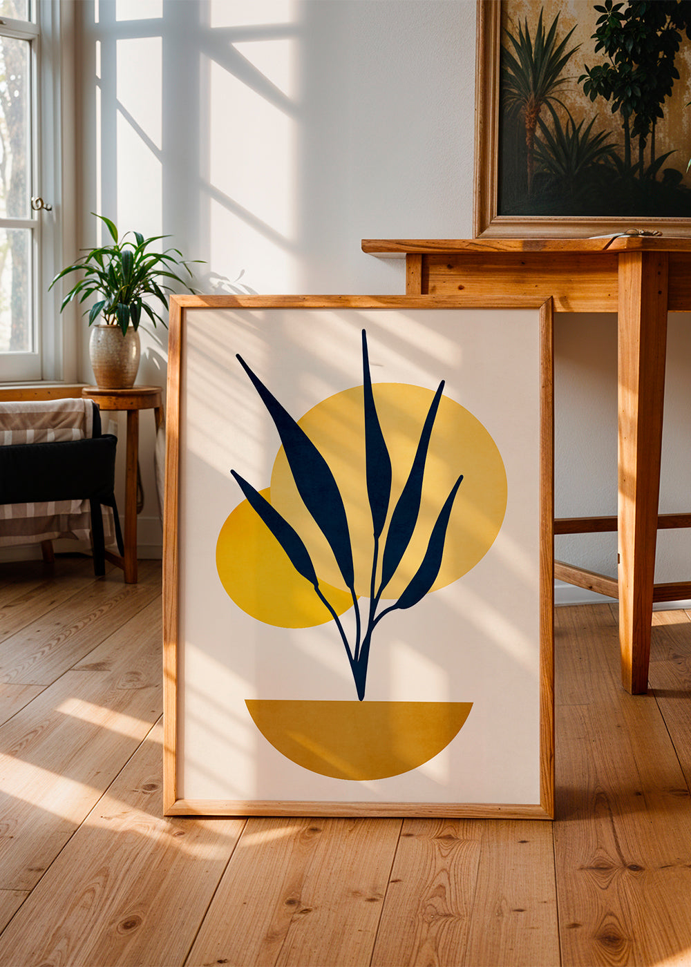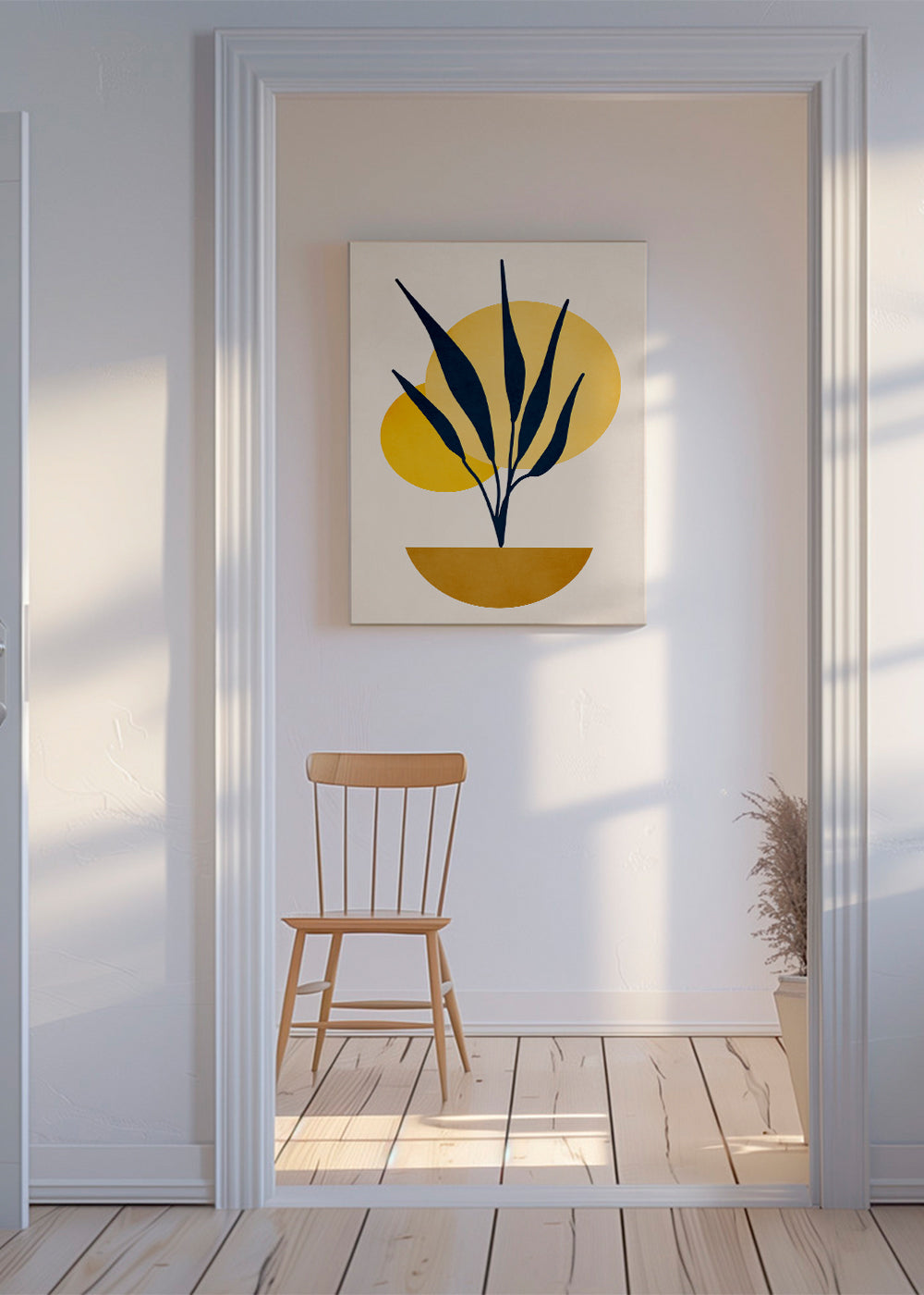Una lámina de nuestro repertorio de cuadros de flores y plantas, de la colección de Kubistika, con colores amarillos, y con orientación vertical. Se trata de una ilustración de estilo sencillo y limpio, combínala con otras ilustraciones para obtener una composición artística. Paredes llenas de creatividad.