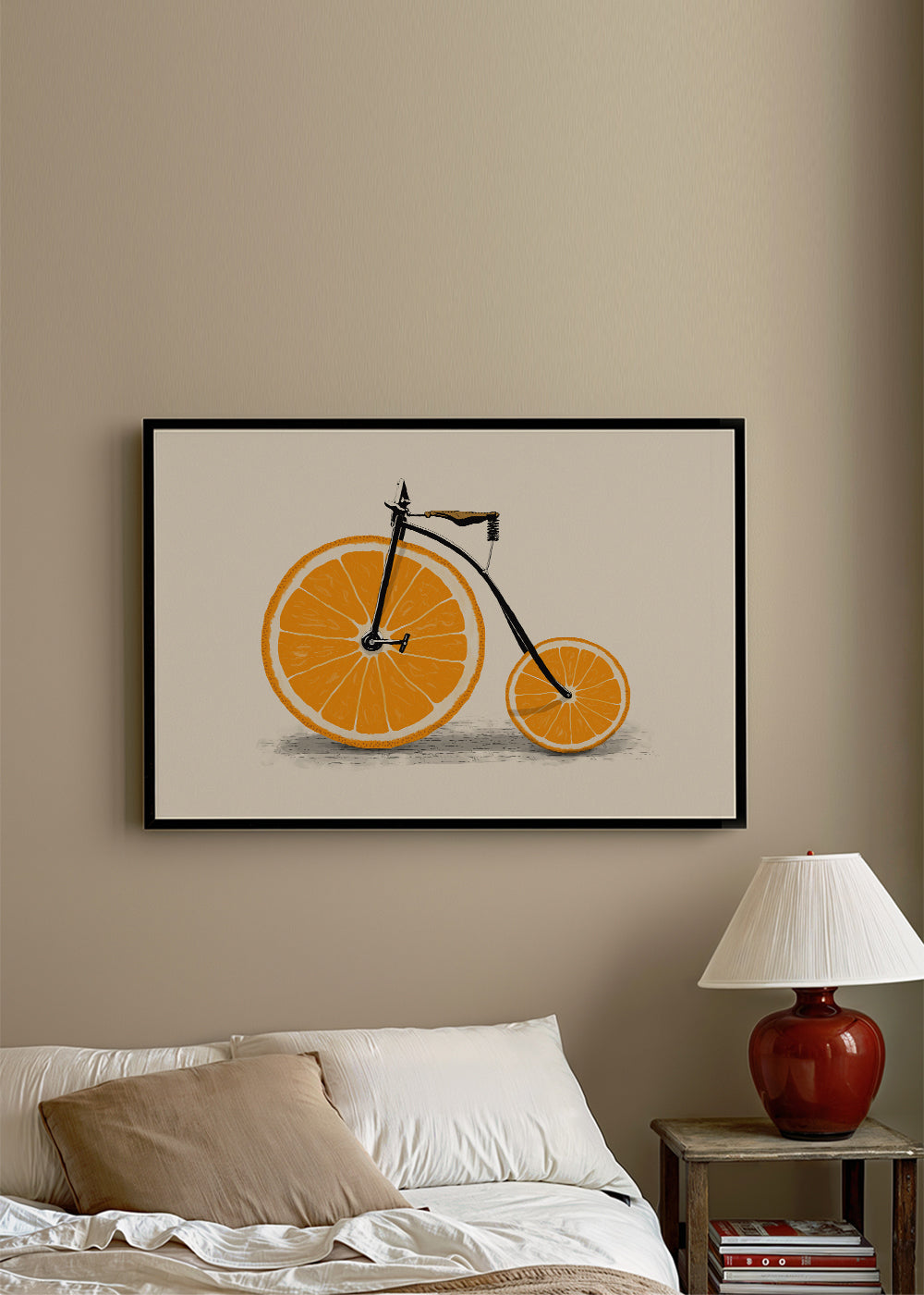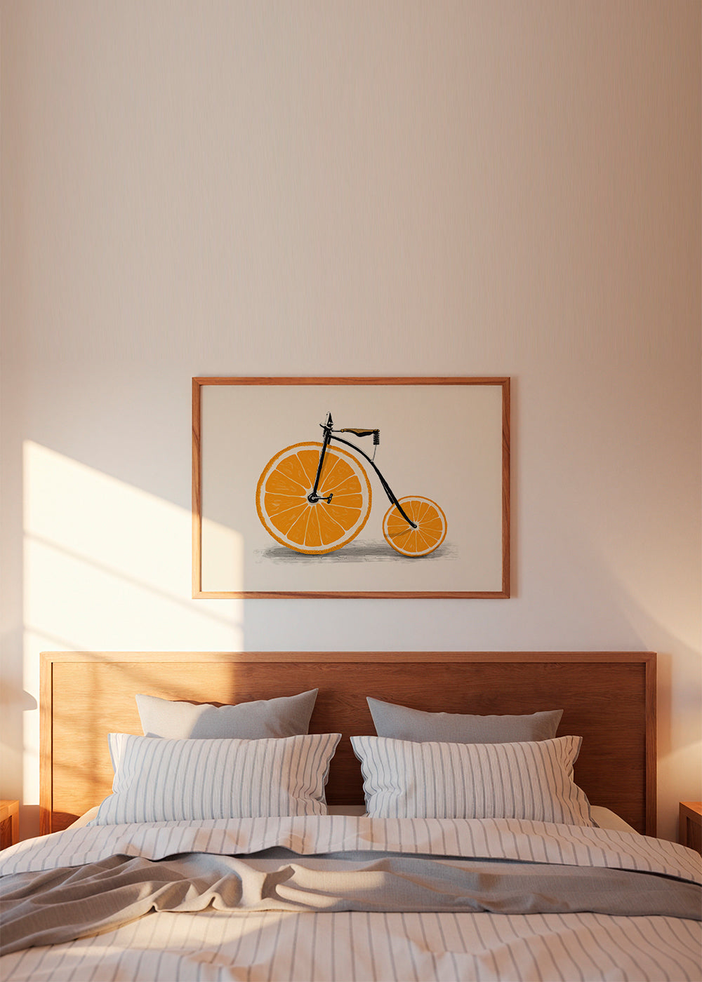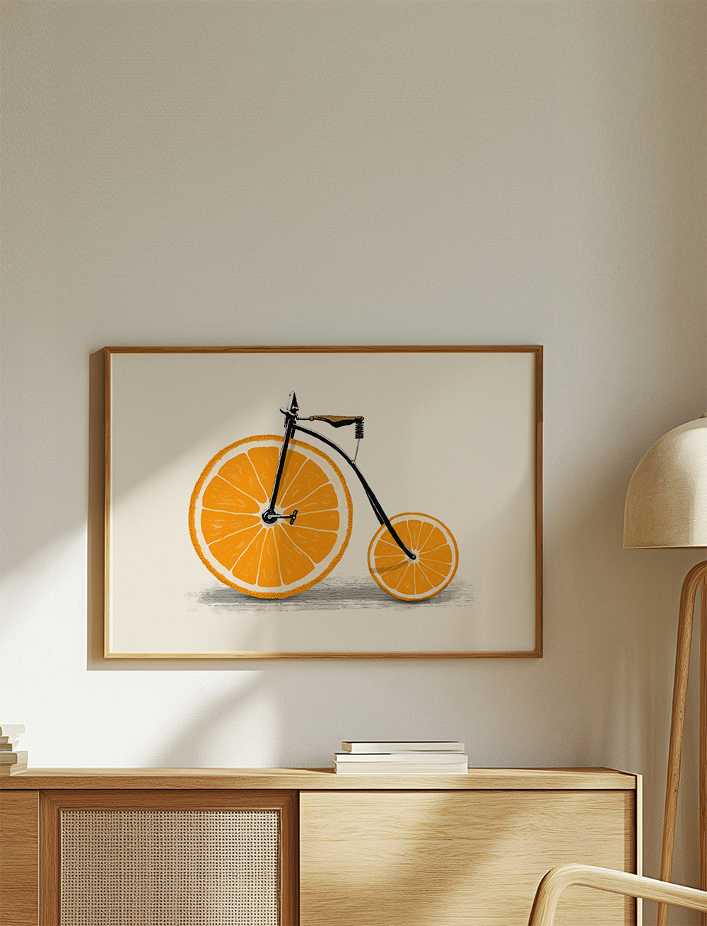 Este diseño de nuestra colección de cuadros de bicicletas, original de Florent Bodart, con matices de colores naranjas, y para colocar en posición horizontal. Un póster retro que puedes combinar con otros posters de estilo vintage para dar un toque original al hogar. Paredes elegantes para hogares chic.