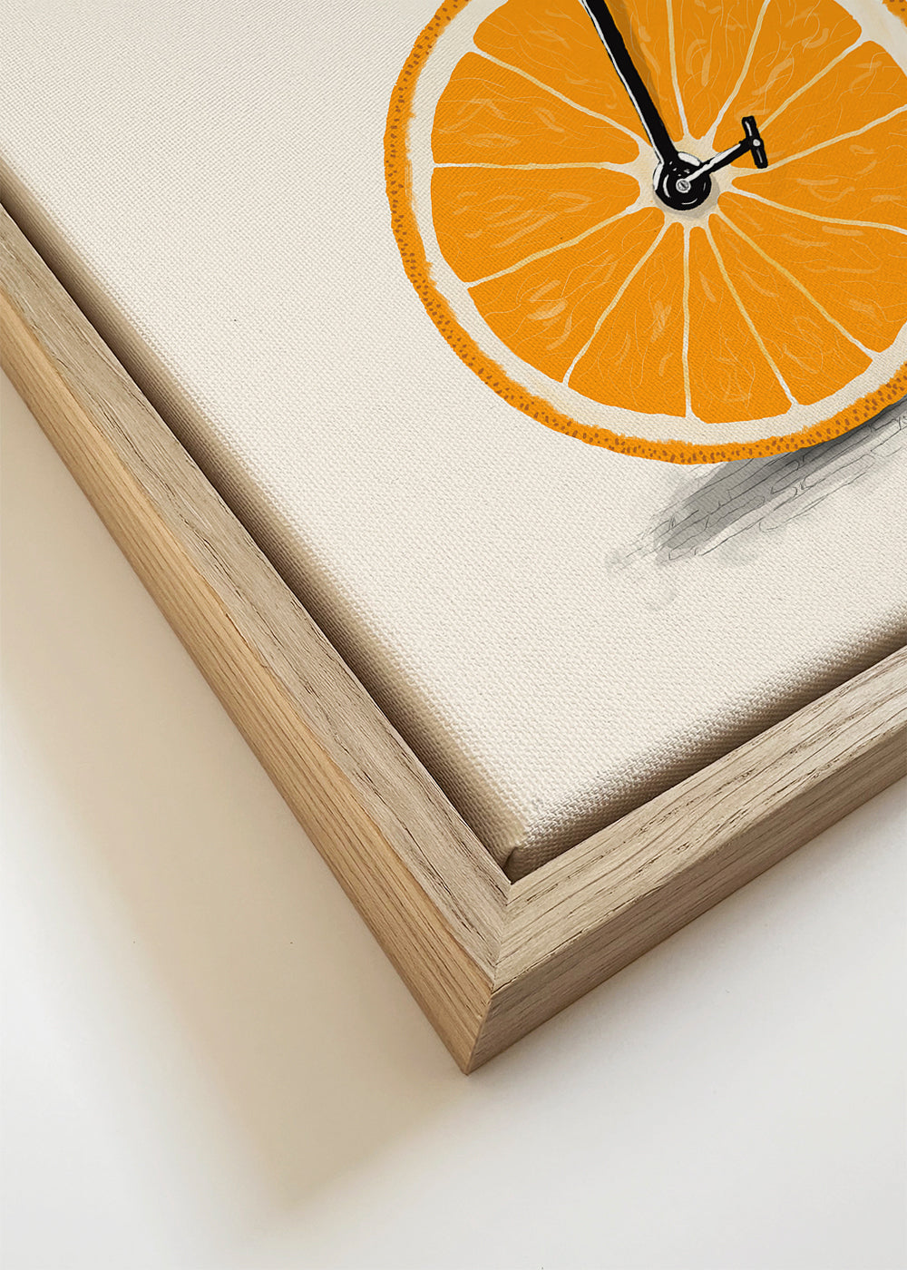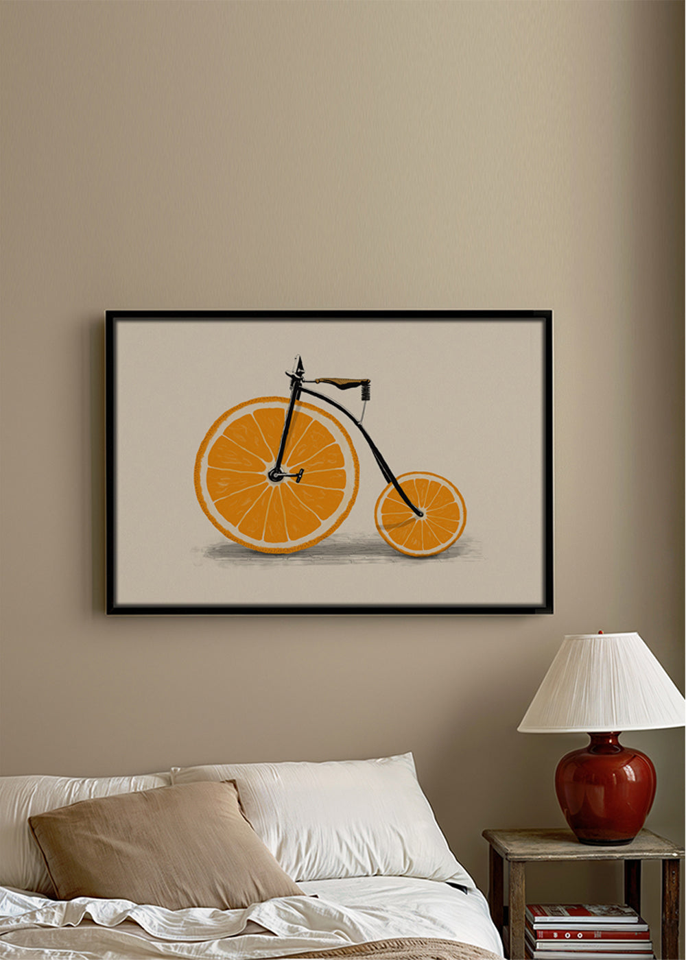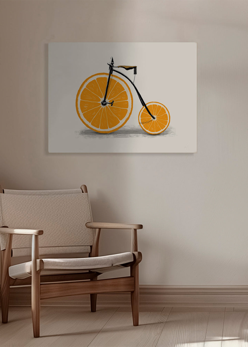 Este diseño de nuestra colección de cuadros de bicicletas, original de Florent Bodart, con matices de colores naranjas, y para colocar en posición horizontal. Un póster retro que puedes combinar con otros posters de estilo vintage para dar un toque original al hogar. Paredes elegantes para hogares chic.