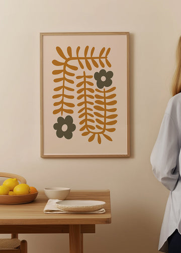 Un diseño de la colección cuadros de flores y plantas, original de Essentially Nomadic, con toques rojos, y de formato vertical. Una pared con decoración botánica transmite mucha vida y energía. Crea tu jardín botánico combinando nuestros cuadros de flores y plantas. El diseño de tu hogar está en tus manos.