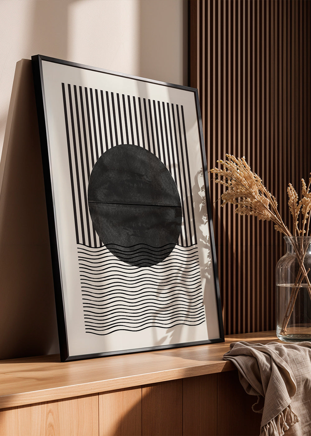 Una obra perteneciente a la categoría de cuadros geométricos, de matices monocromáticos, y en formato vertical. El arte geométrico es un estilo elegante para decorar las paredes del hogar. Un diseño precioso a la altura de tu decoración.