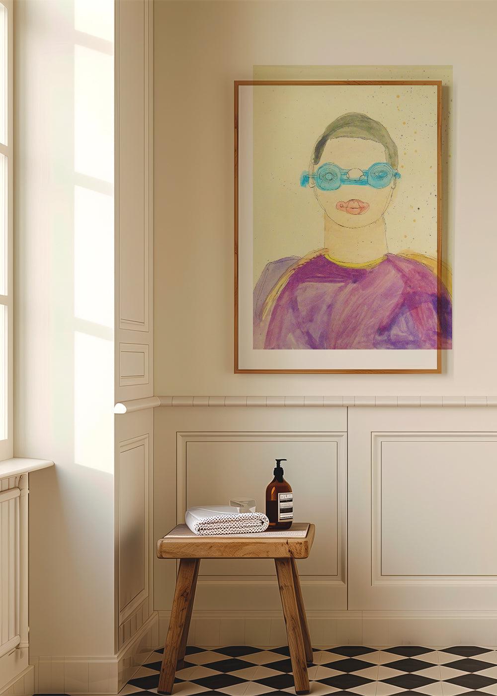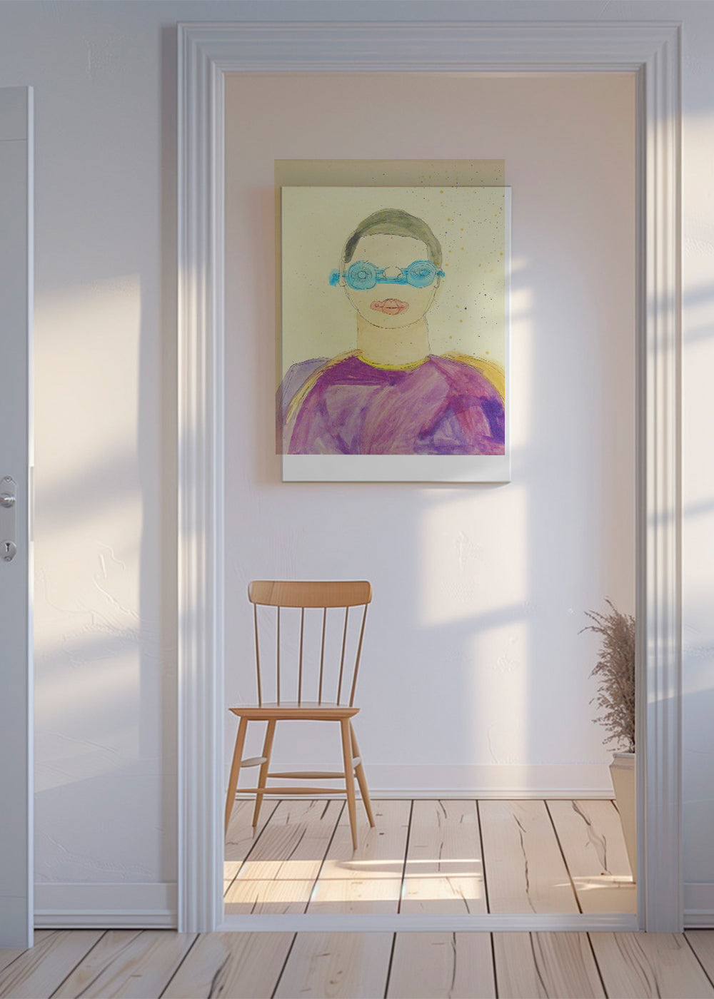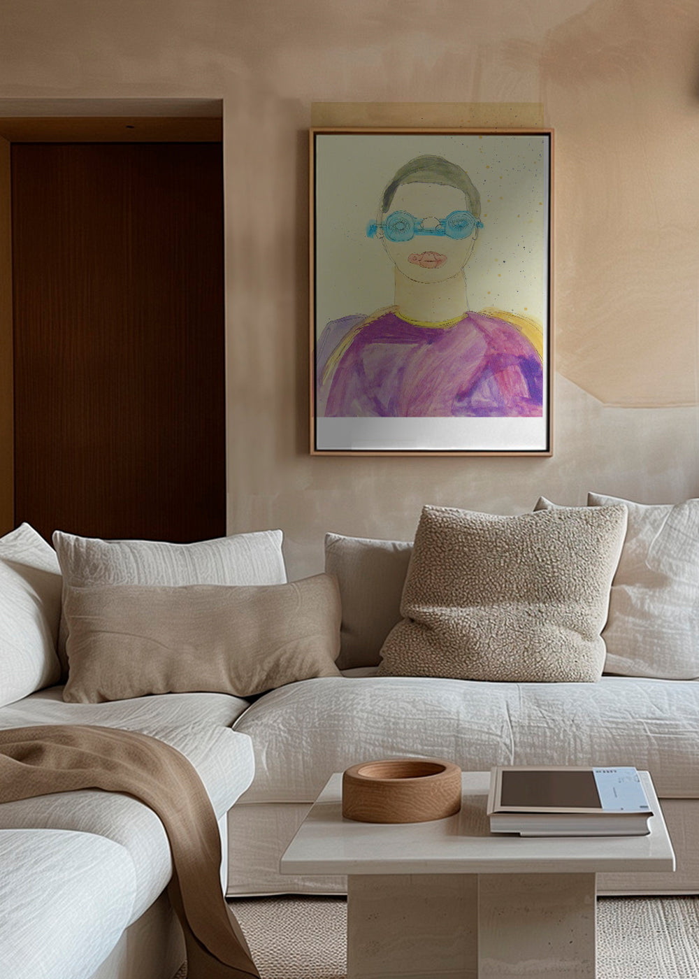 Un cuadro de la colección cuadros de caras, original de José Maria Escobar, con matices de tonos violetas, y de disposición vertical. Las láminas con ilustraciones son perfectas para llenar las paredes de creatividad. Una pared con cuadros puede cambiar todo el look de una estancia.