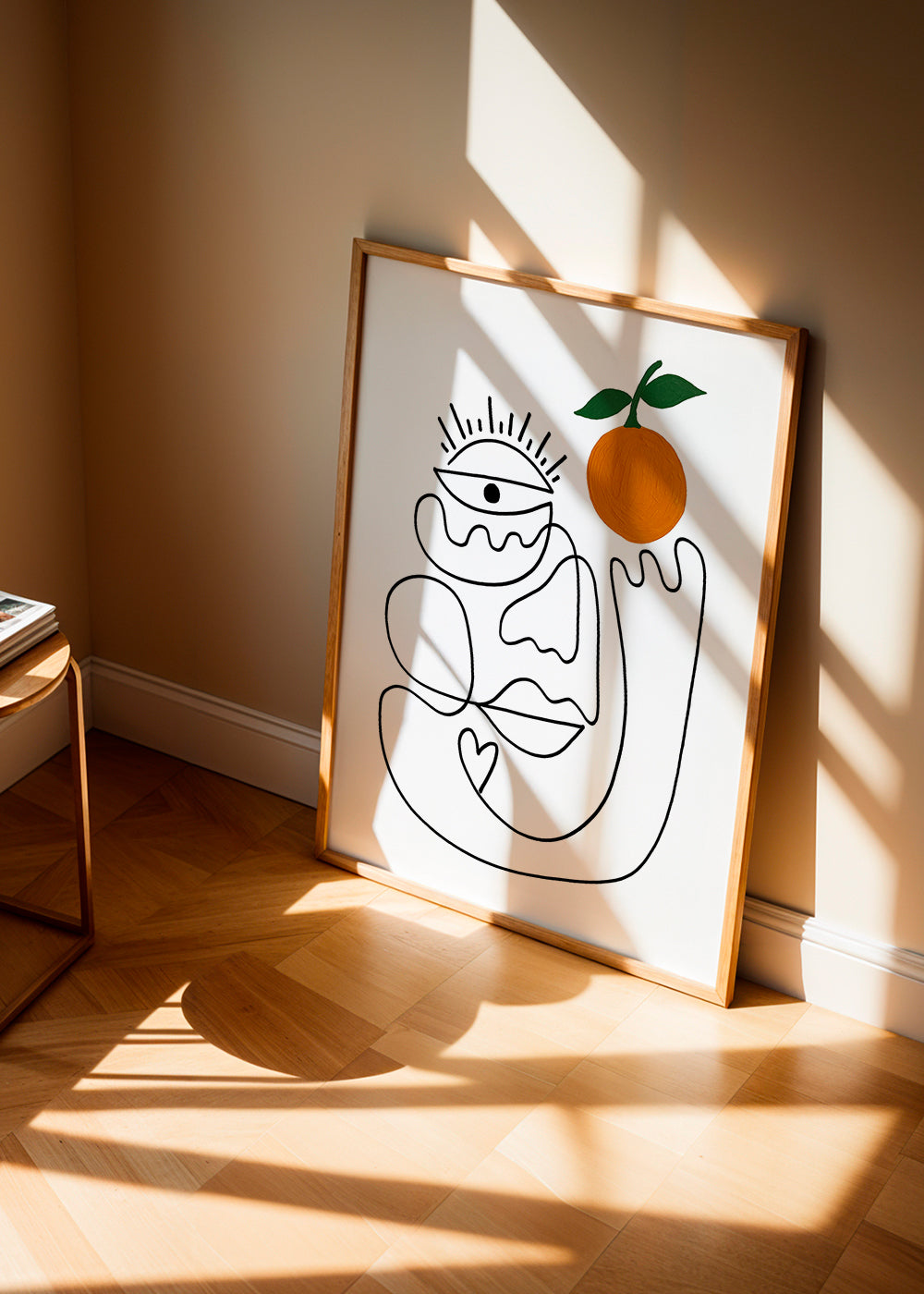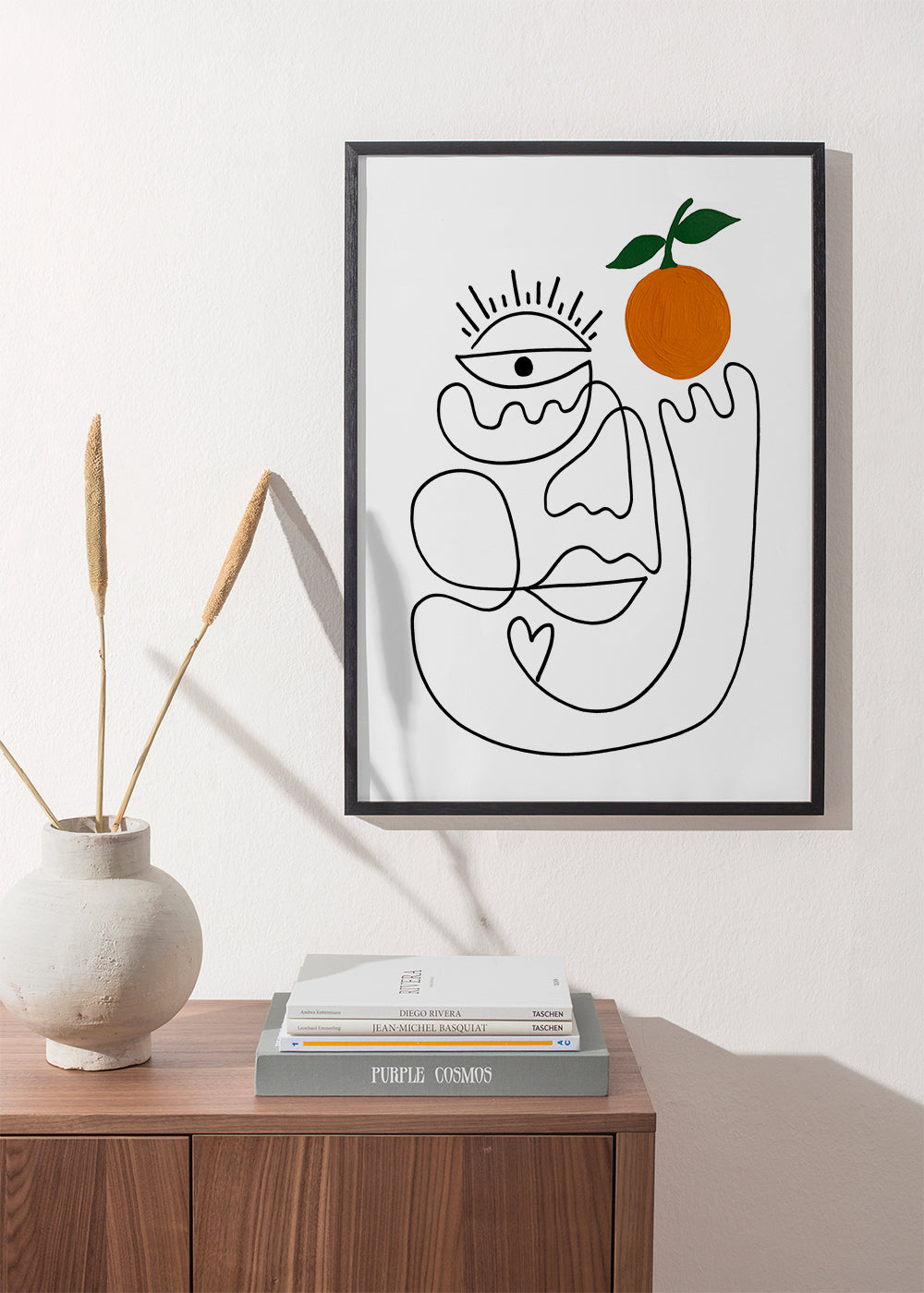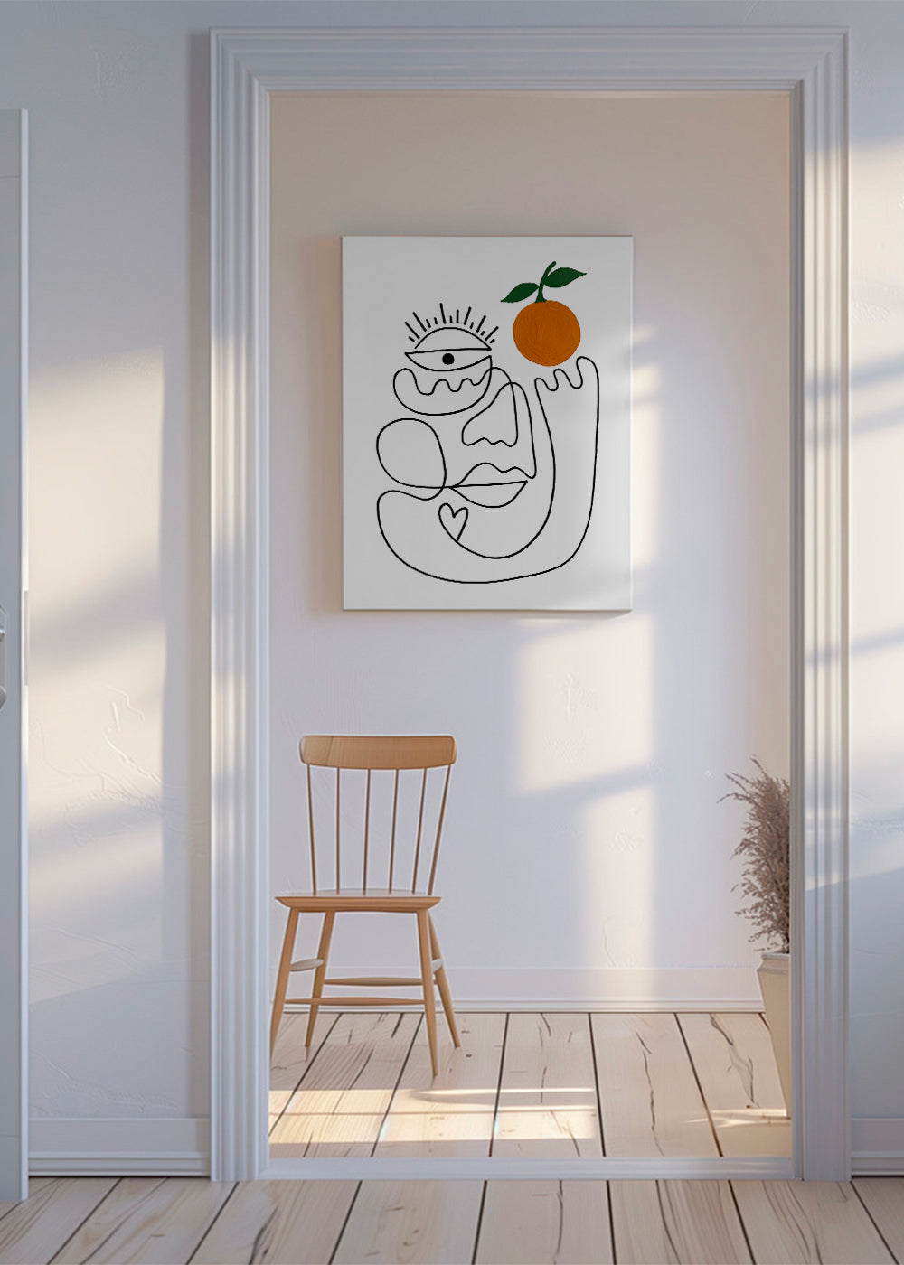 Un cuadro del estilo de nuestros cuadros de caras, creada por Shatha Dafai, con toques naranjas, y en formato vertical. Este diseño es ideal para decorar espacios actuales. Combínalo con otros cuadros abstractos para conseguir una decoración vanguardista. Añade un poco de arte a la decoración de tu hogar.