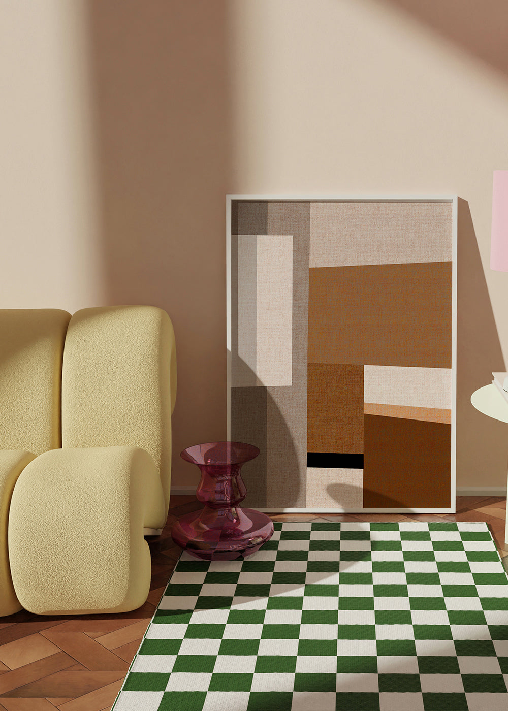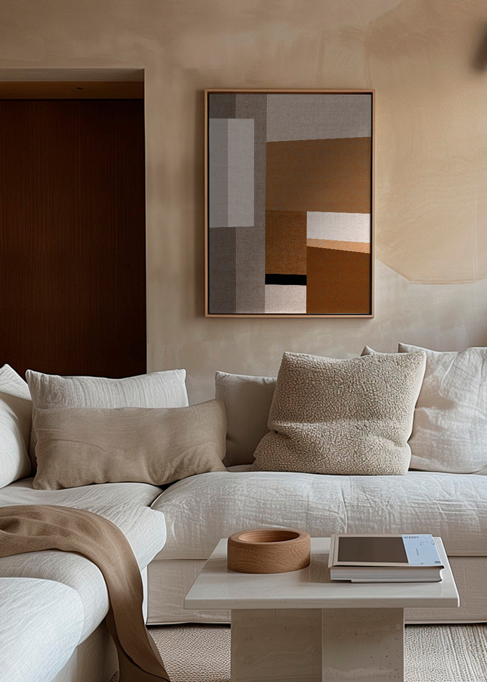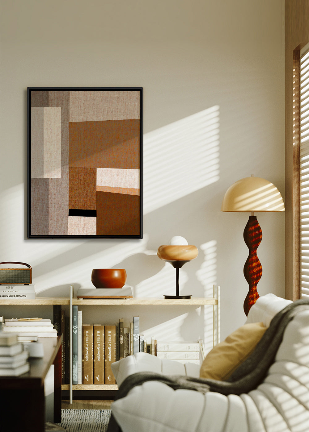Un póster con inspiración en nuestra colección de cuadros geométricos, perteneciente a la colección de 1x, con toques marrones, y ideal para poner en posición vertical. El arte geométrico es un estilo elegante para decorar las paredes del hogar. Frescura y originalidad.
