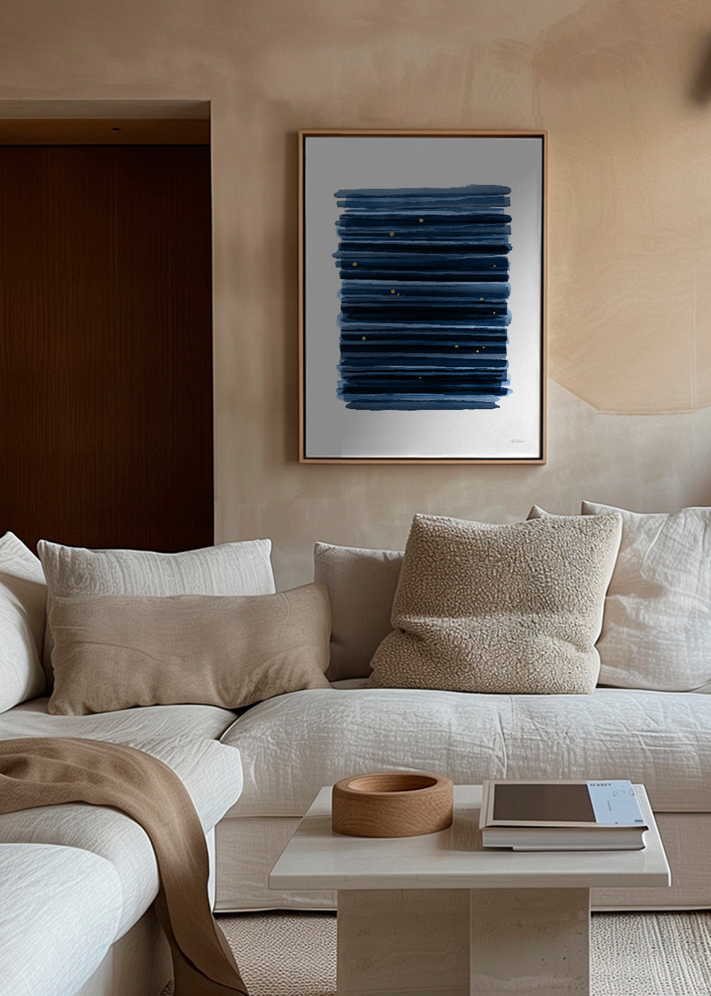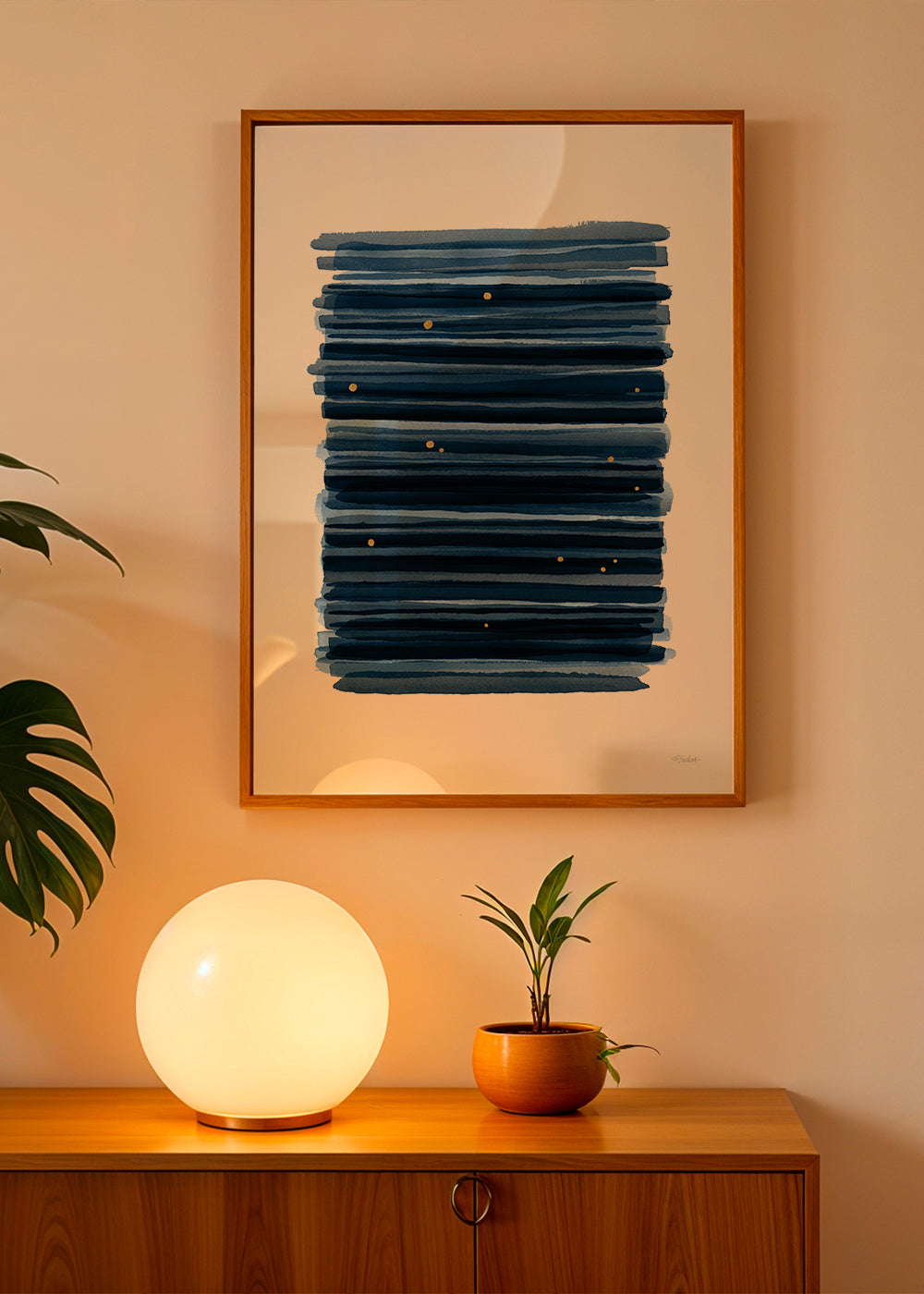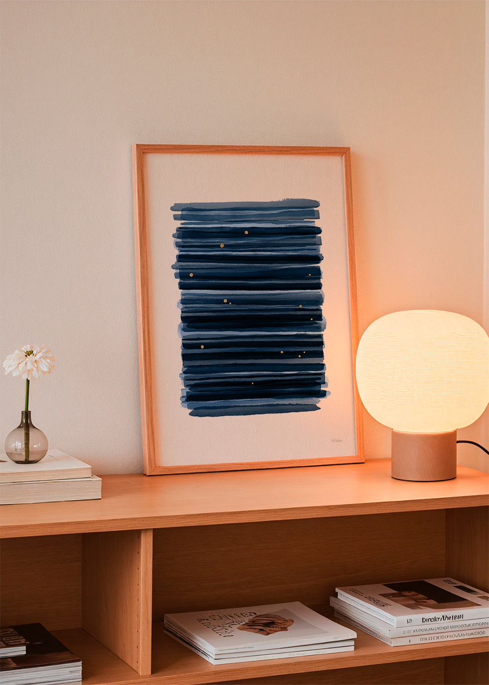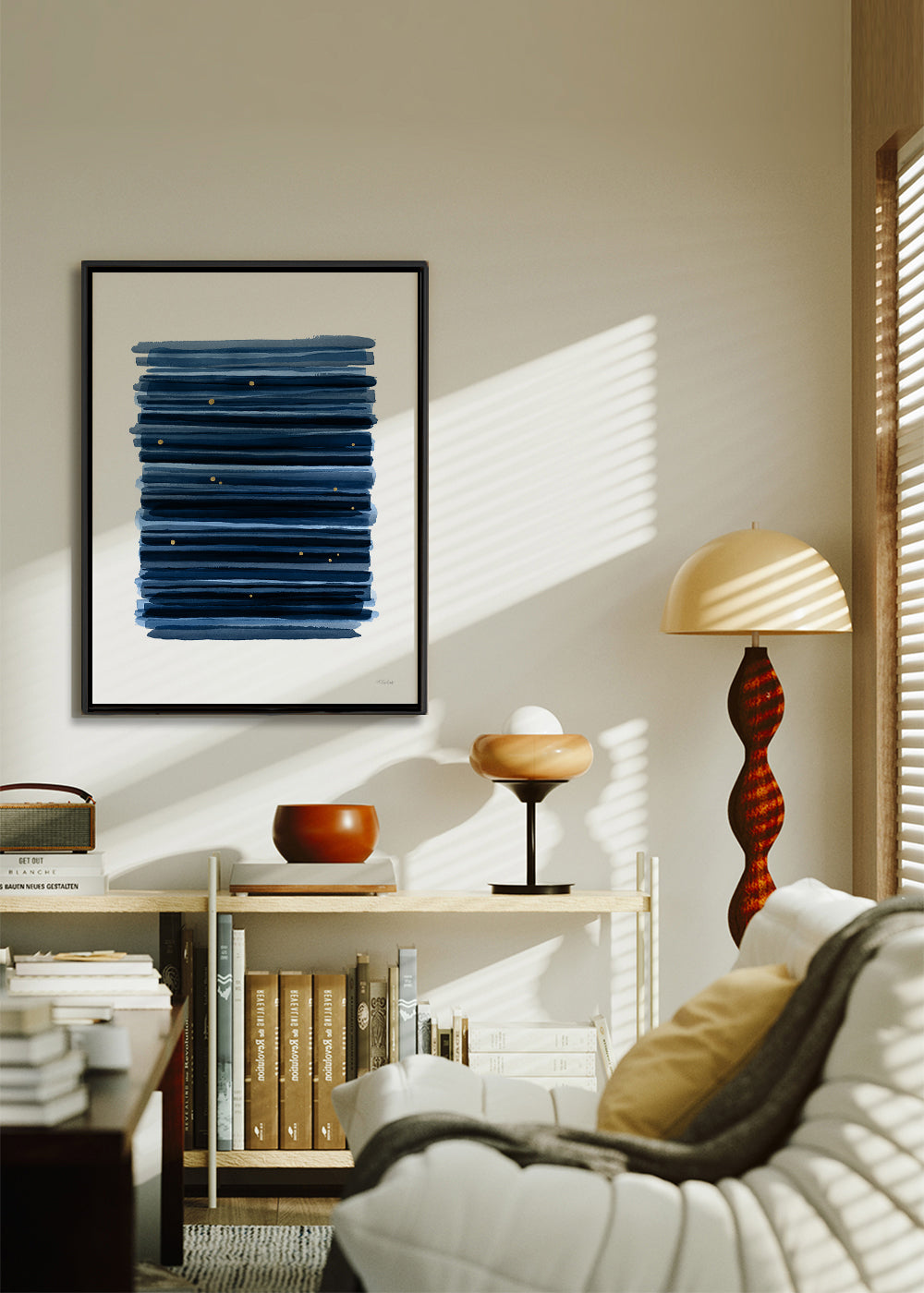 Esta pieza con inspiración en nuestra colección de cuadros geométricos, de Fabiana Silveira, en tonos azules, y para colocar en posición vertical. Las formas geométricas y abstractas ayudan a crear un ambiente desenfadado y creativo. Los detalles marcan la diferencia.