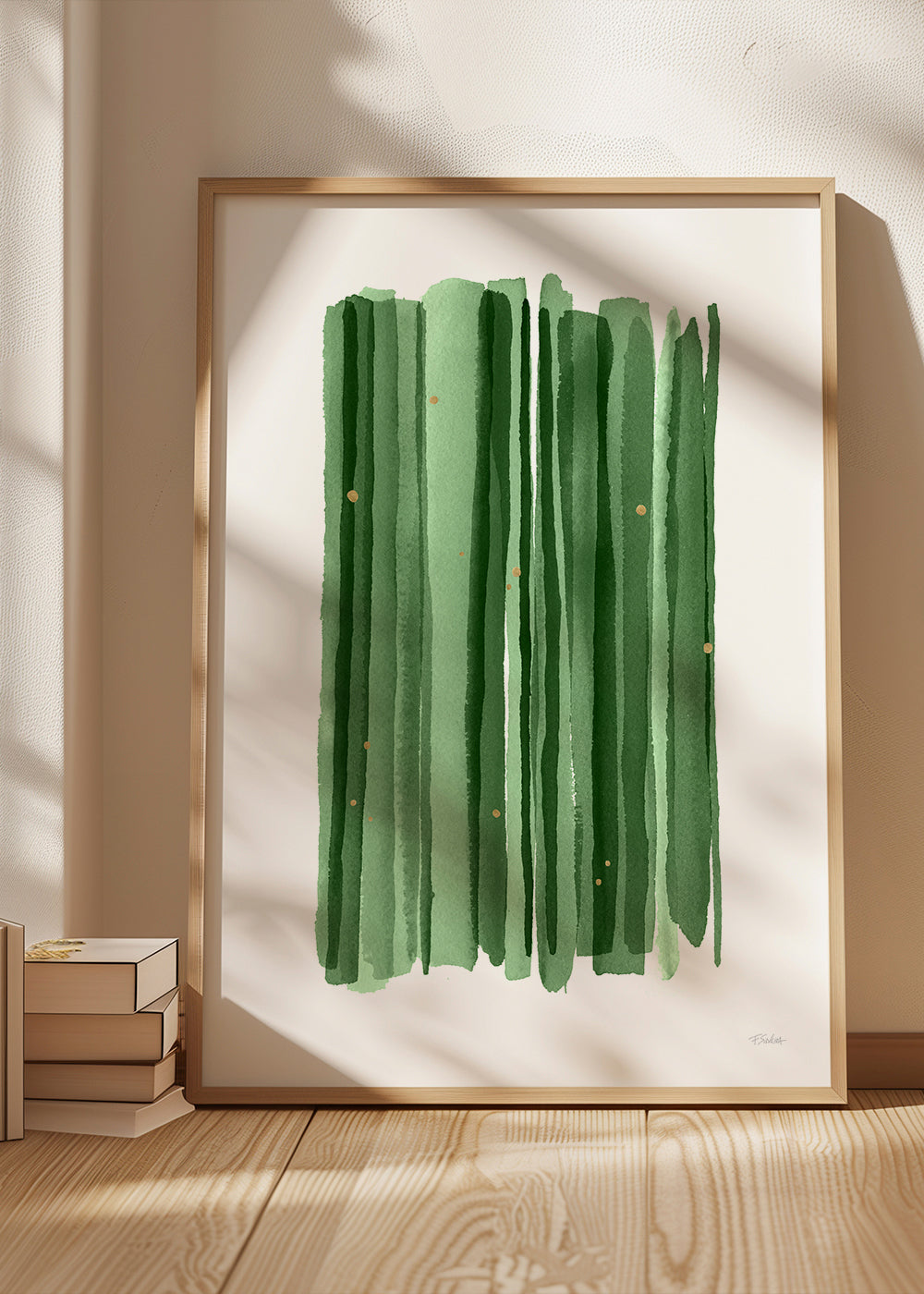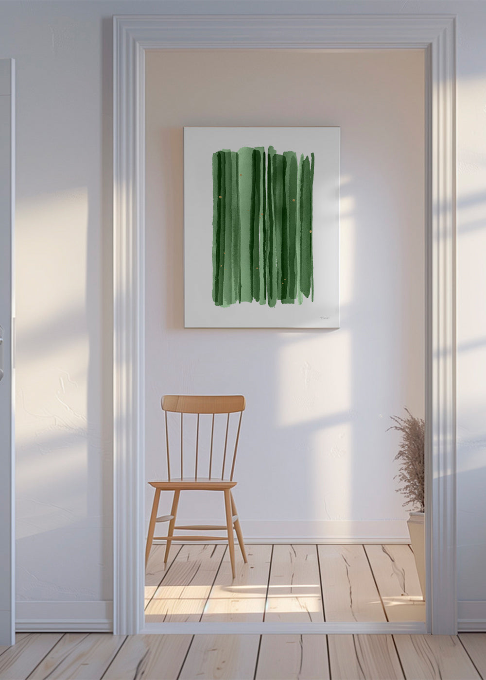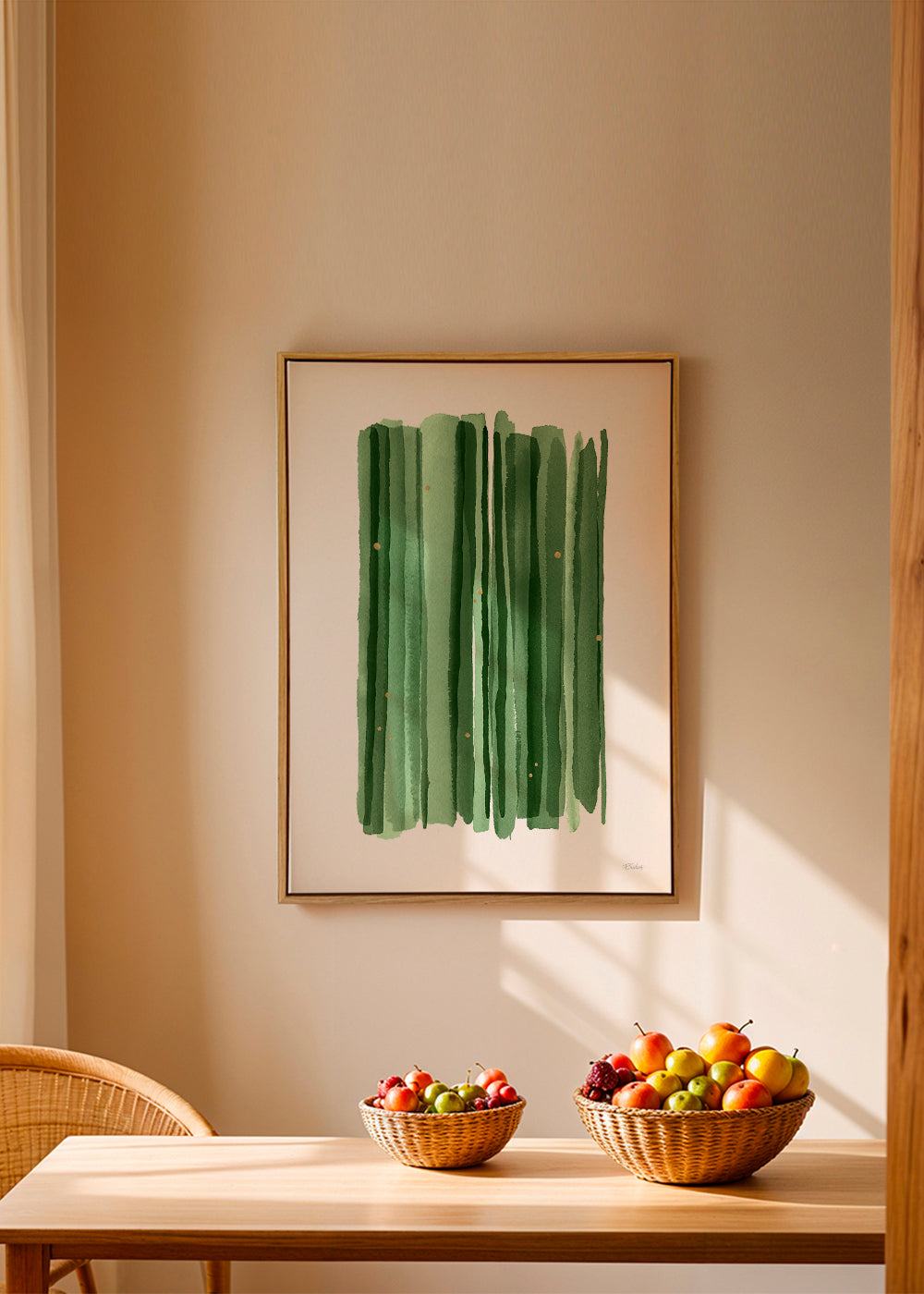 Bonito diseño de nuestra colección de cuadros geométricos, de la colección de Fabiana Silveira, con matices de tonos verdes, y ideal para poner en posición vertical. Las formas geométricas y abstractas ayudan a crear un ambiente desenfadado y creativo. Déjate cautivar por el arte.
