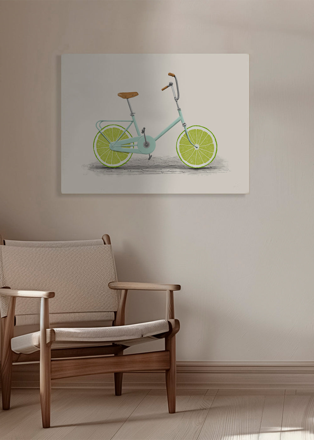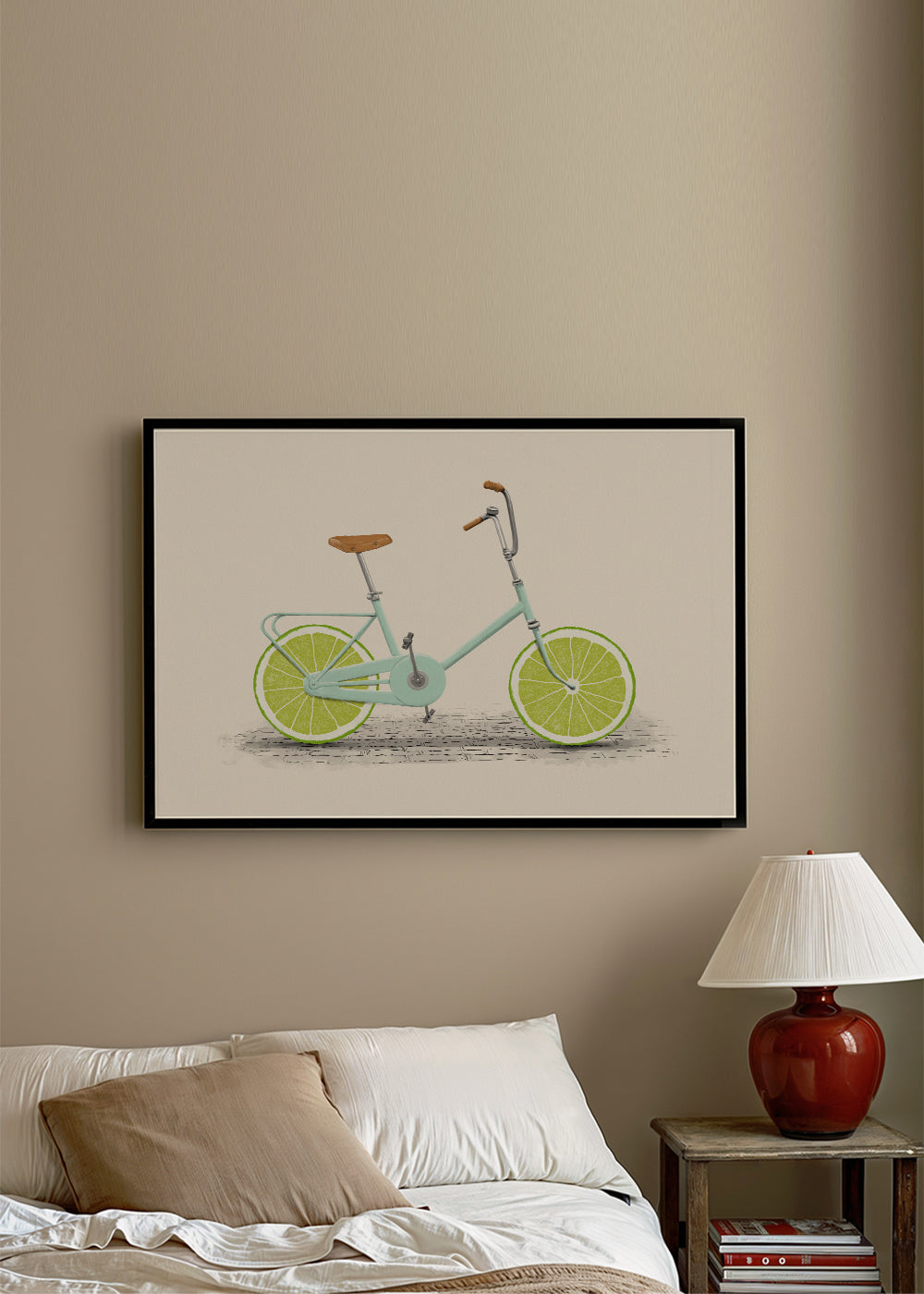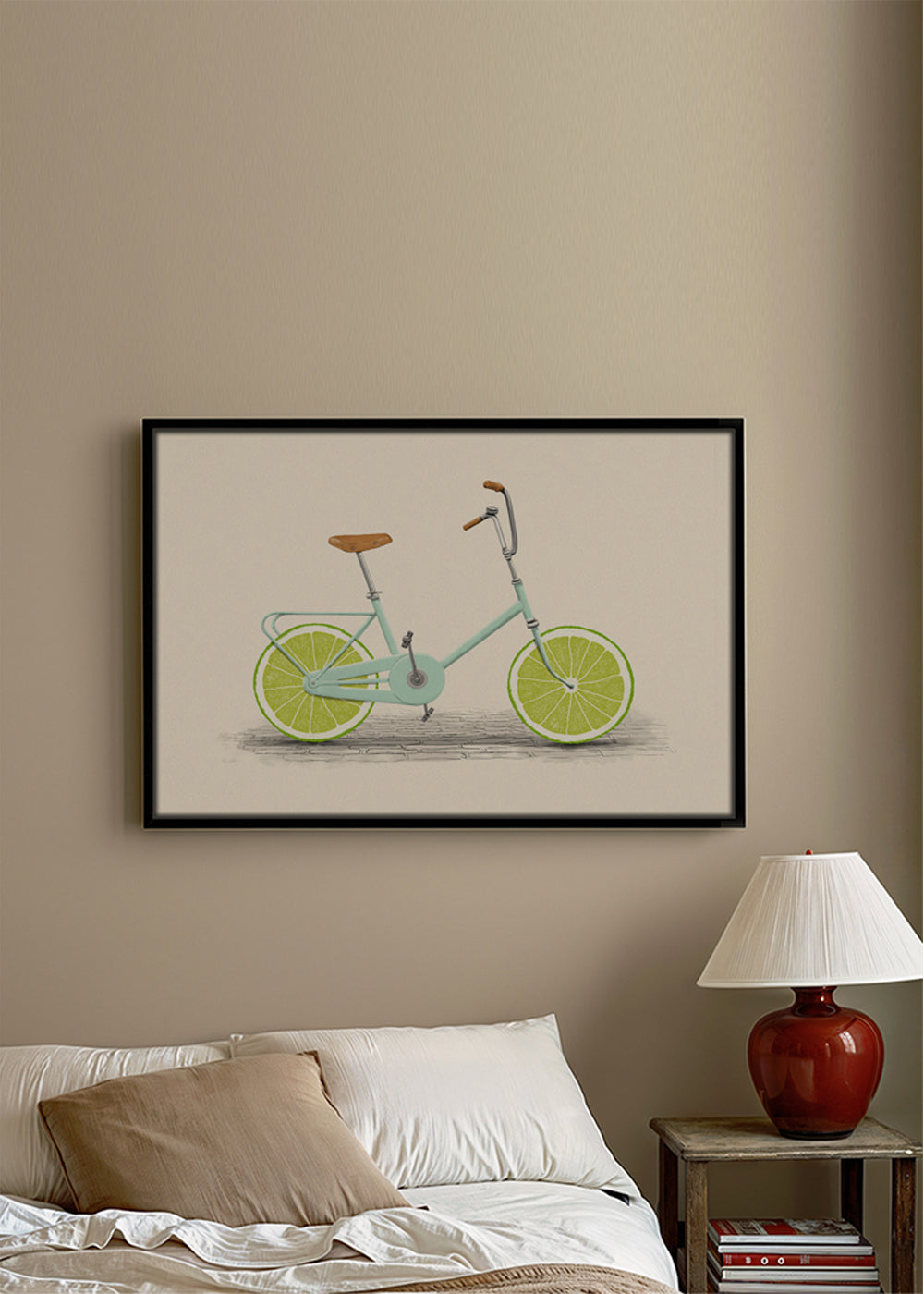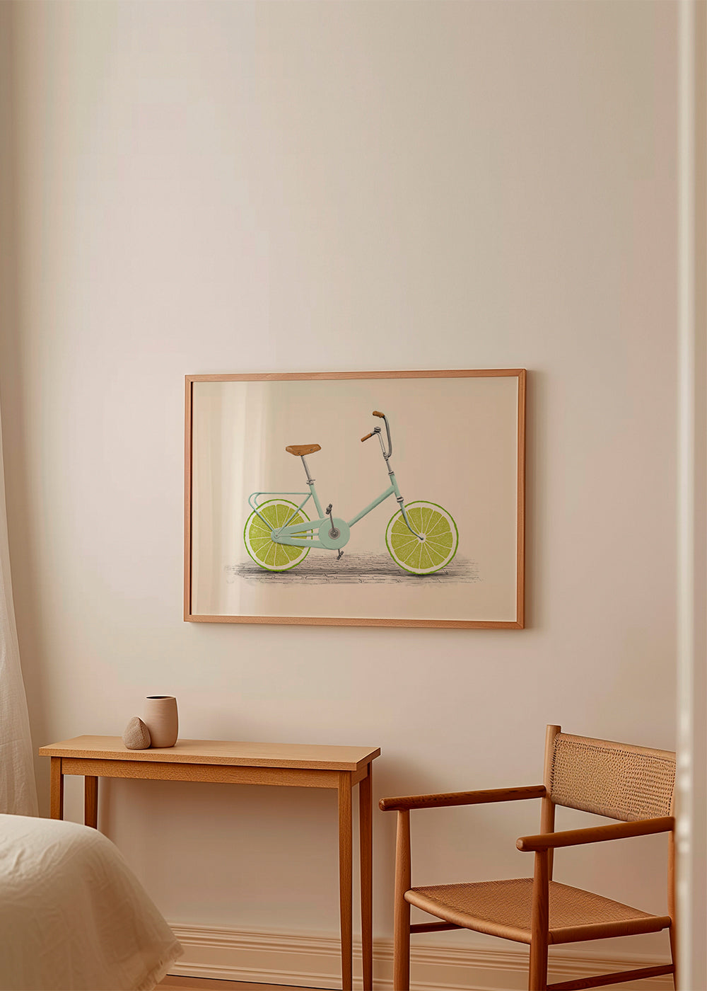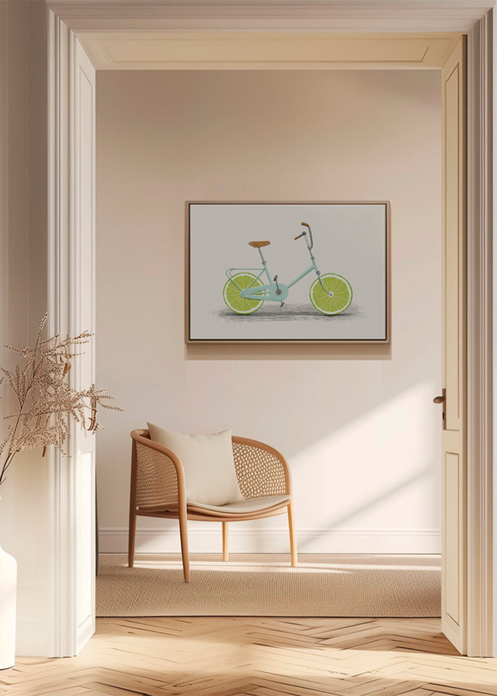 Un póster de nuestro conjunto de cuadros de bicicletas, de la mano de Florent Bodart, con matices de tonos azules, y de formato horizontal. Un póster retro que puedes combinar con otros posters de estilo vintage para dar un toque original al hogar. Una pieza que seguro dará un plus a la estancia.