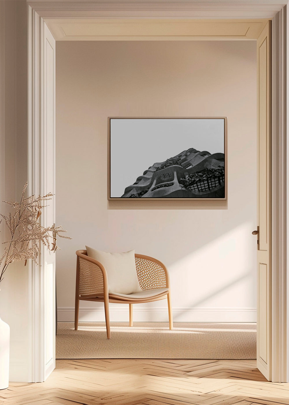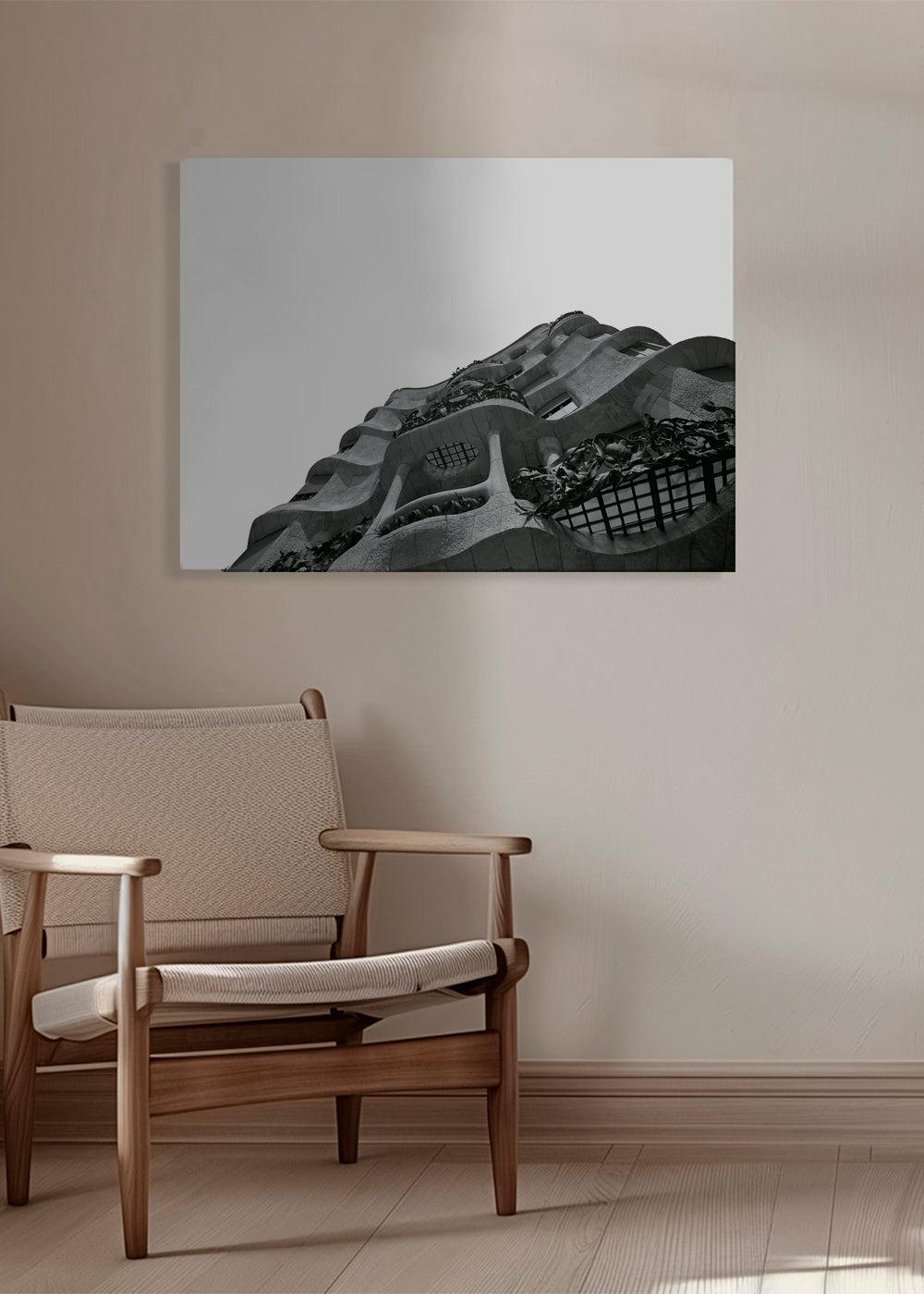 Una lámina decorativa moderna de una fotografía de nuestra colección blanco y negro de la Casa Batlló de Barcelona. Pertenece a nuestra colección cuadros de mapas y ciudades.