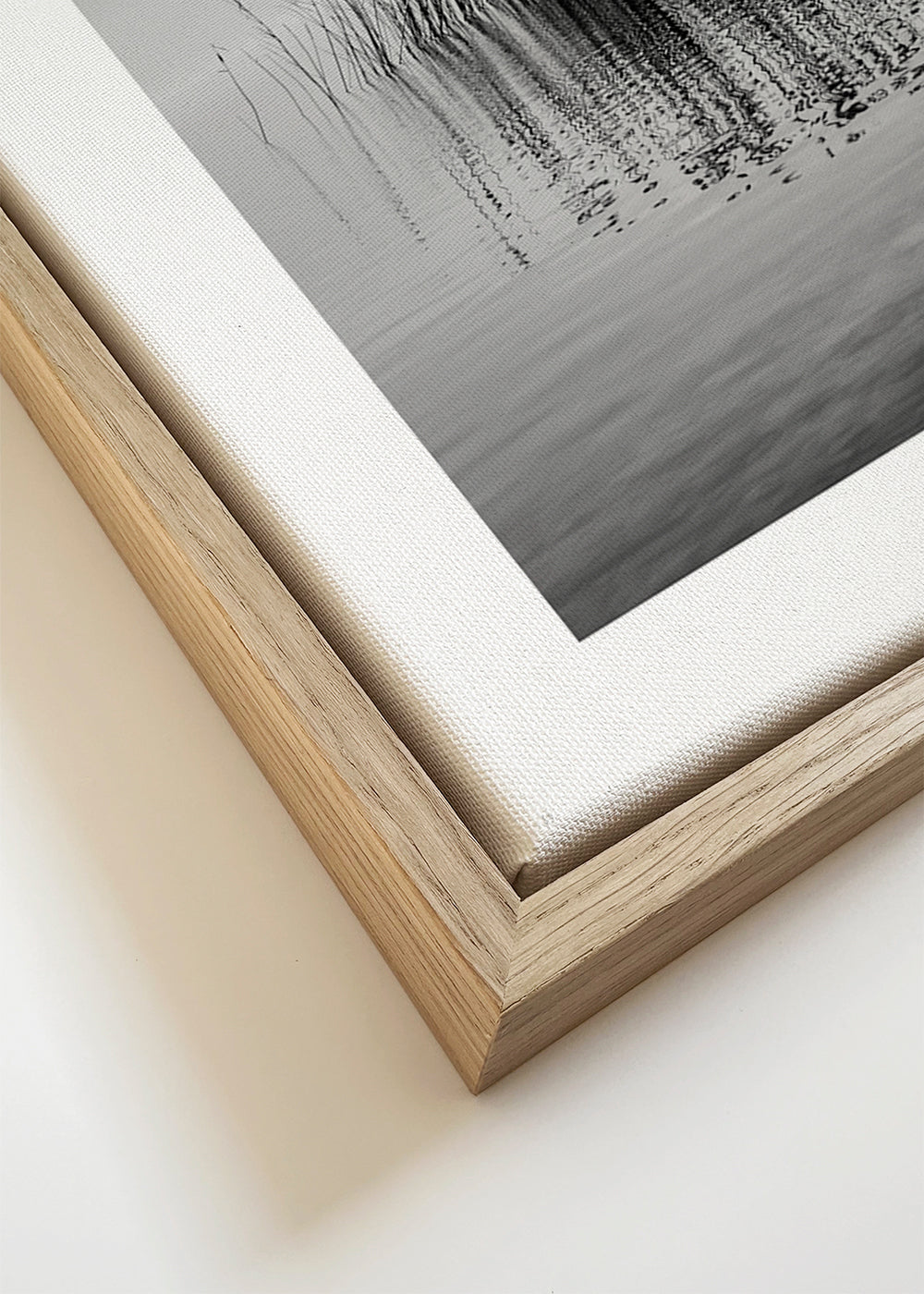 Si seleccionas la opción passepartout, añadiremos el recuadro de cartón blanco al marco, y reduciremos el diseño de la obra. Por ejemplo, si seleccionas una lámina de tamaño 50x70, con marco de color roble y passepartout, reduciremos el diseño de la lámina al tamaño anterior (40x50cm). De esta manera, se adaptará perfectamente a la ventana interior del passepartout.