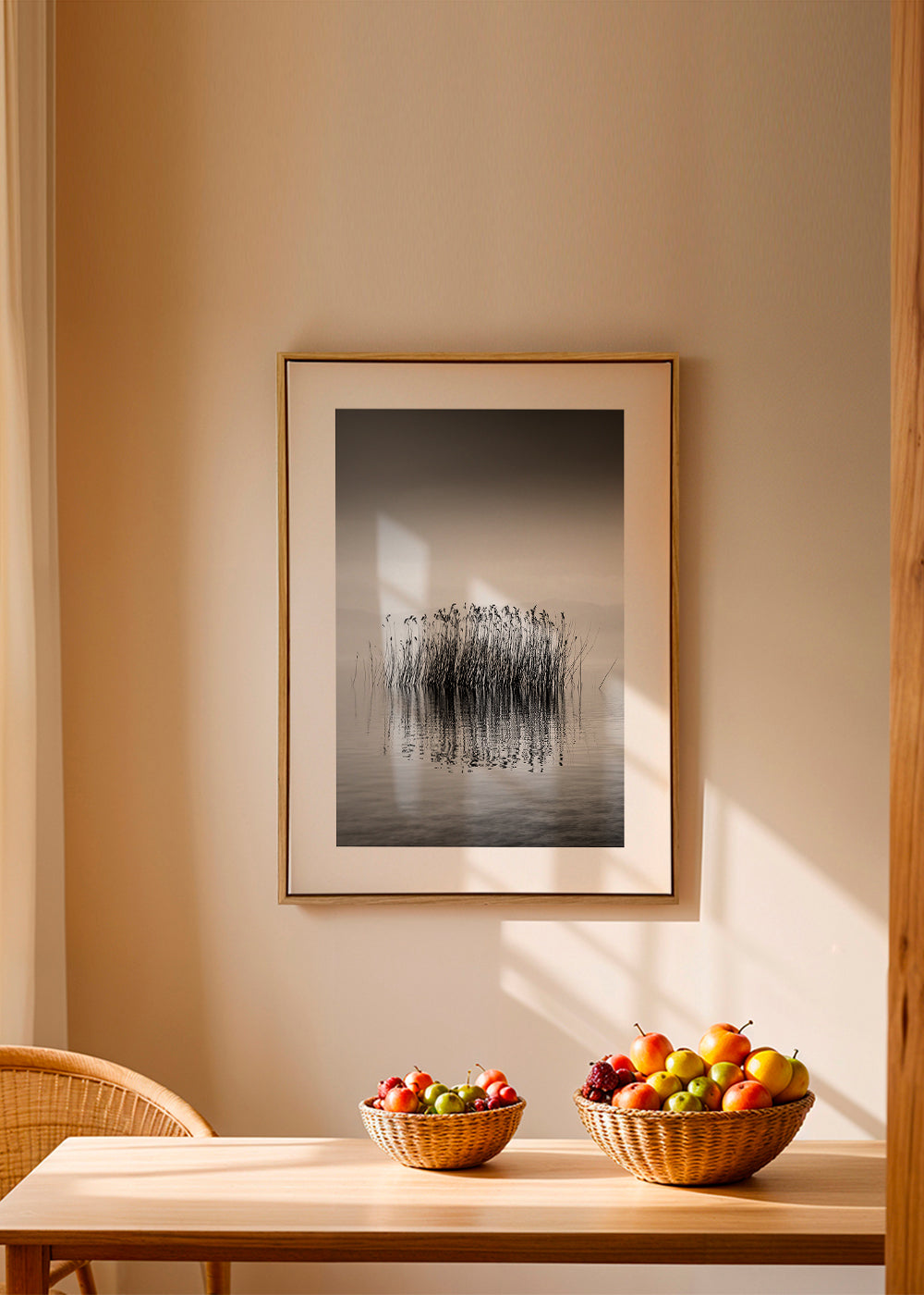 Un cuadro de nuestro conjunto de cuadros de lagos, con tonos monocromáticos, y en formato vertical. La naturaleza en su máximo esplendor, los cuadros con paisajes transmiten mucha calma. Consigue una decoración con mucho arte. Esta obra incluye un margen blanco que enmarca el diseño para potenciar su estilo.