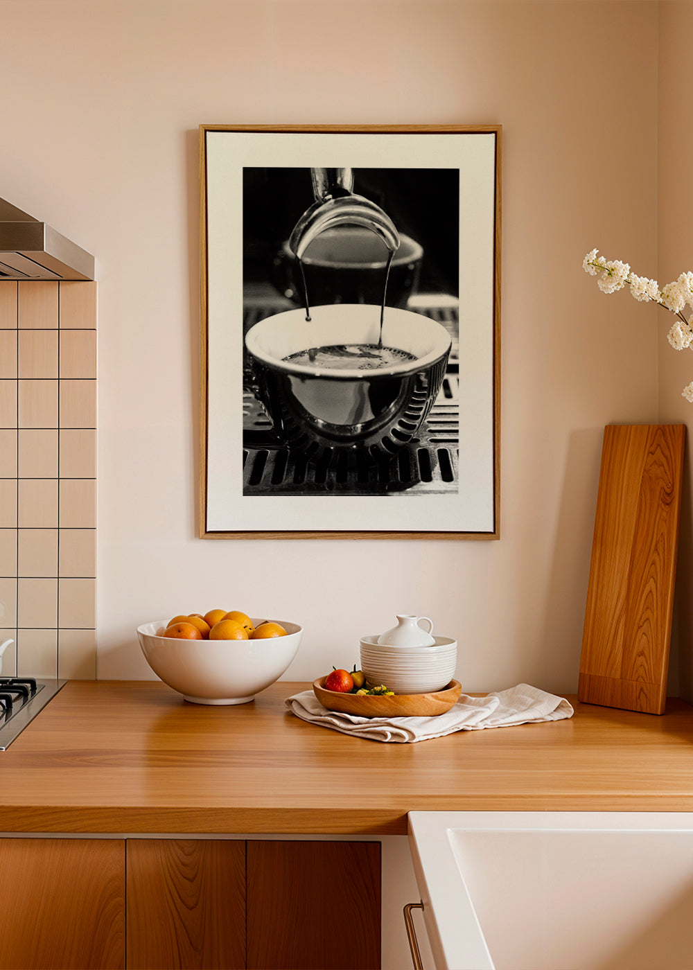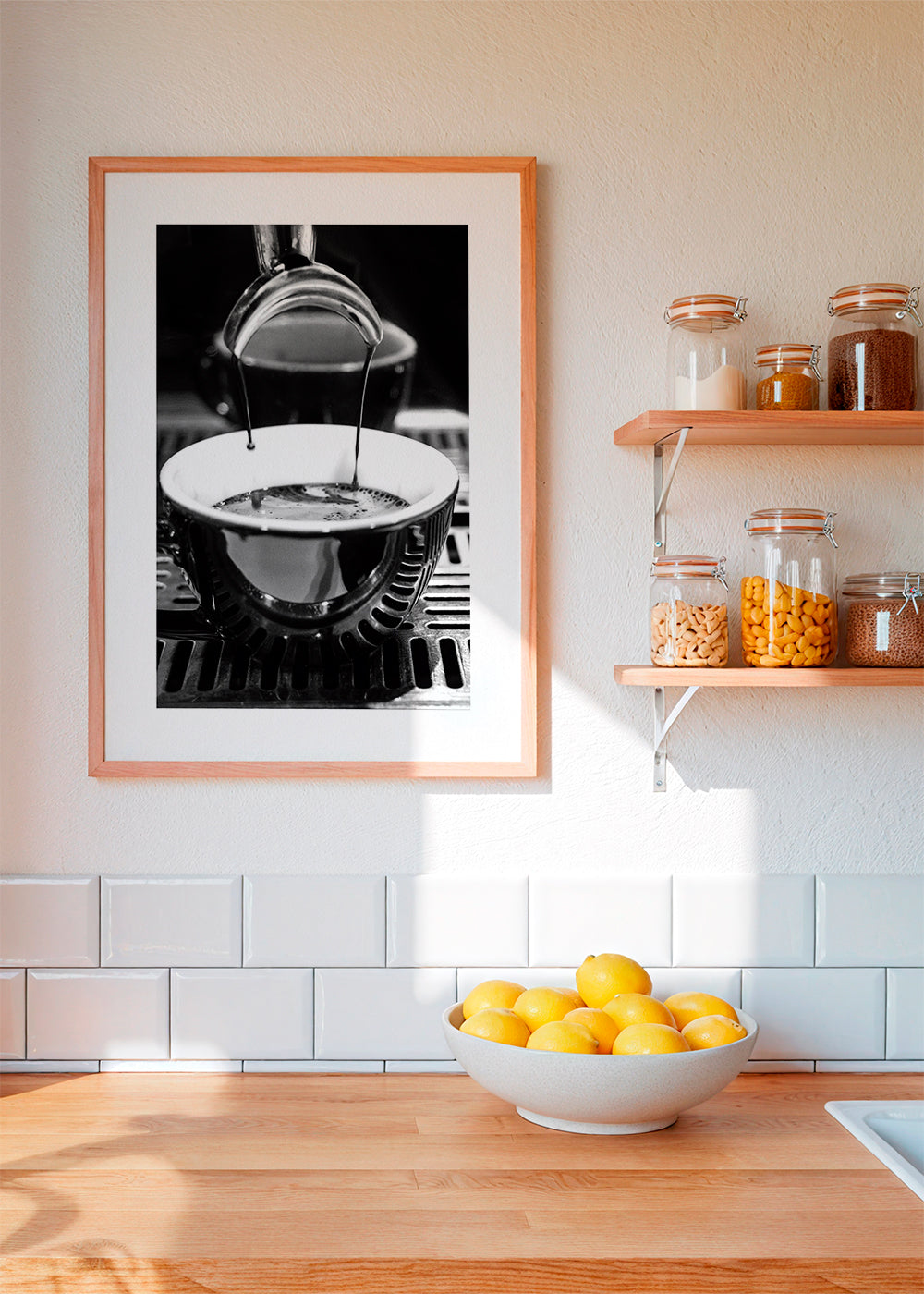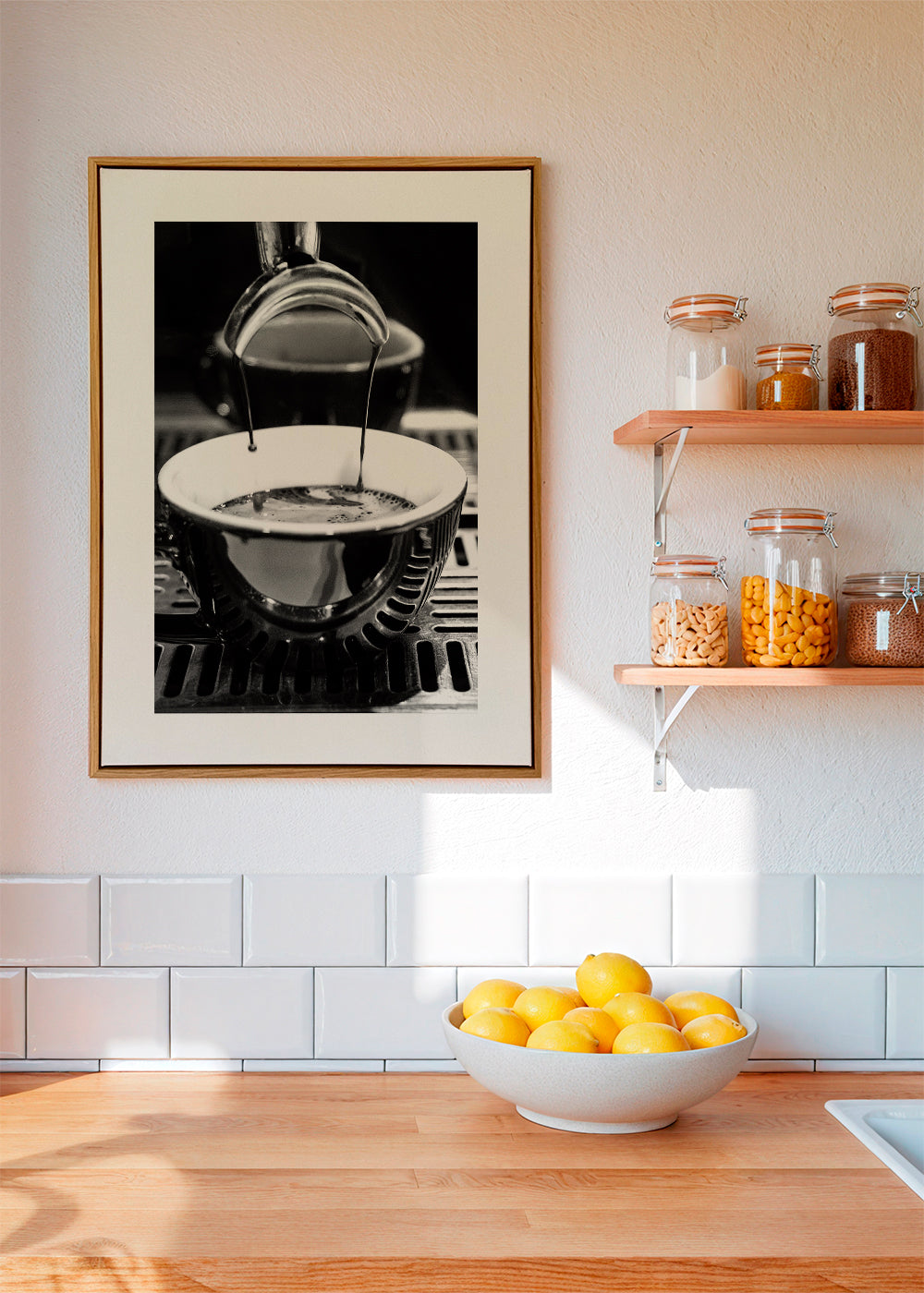 Un póster de la colección cuadros de café, en tonos monocromáticos, y orientada en vertical. Esta fotografía es una opción ideal para combinar con otros cuadros con fotografías y crear una galería de pared. Un hogar se viste por las paredes. El margen blanco que envuelve a la imagen potencia la expresividad de la obra.