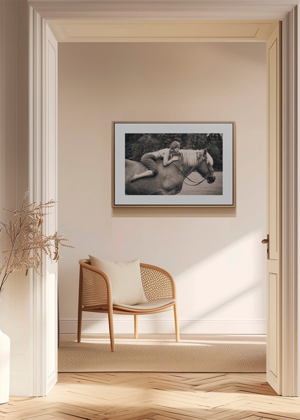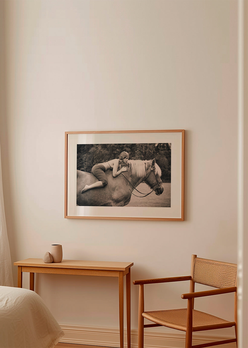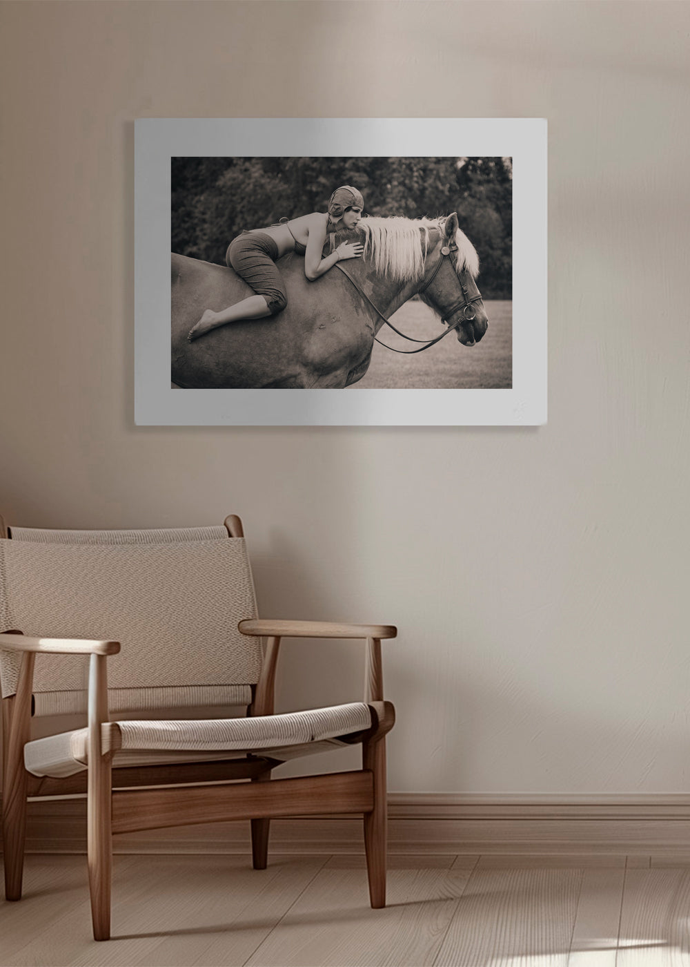 Bonito póster con inspiración en nuestra colección de cuadros de caballos, con tonos monocromáticos, y de formato horizontal. Un póster retro que puedes combinar con otros posters de estilo vintage para dar un toque original al hogar. El toque final que estabas buscando. Esta obra incluye un margen blanco que enmarca el diseño para potenciar su estilo.