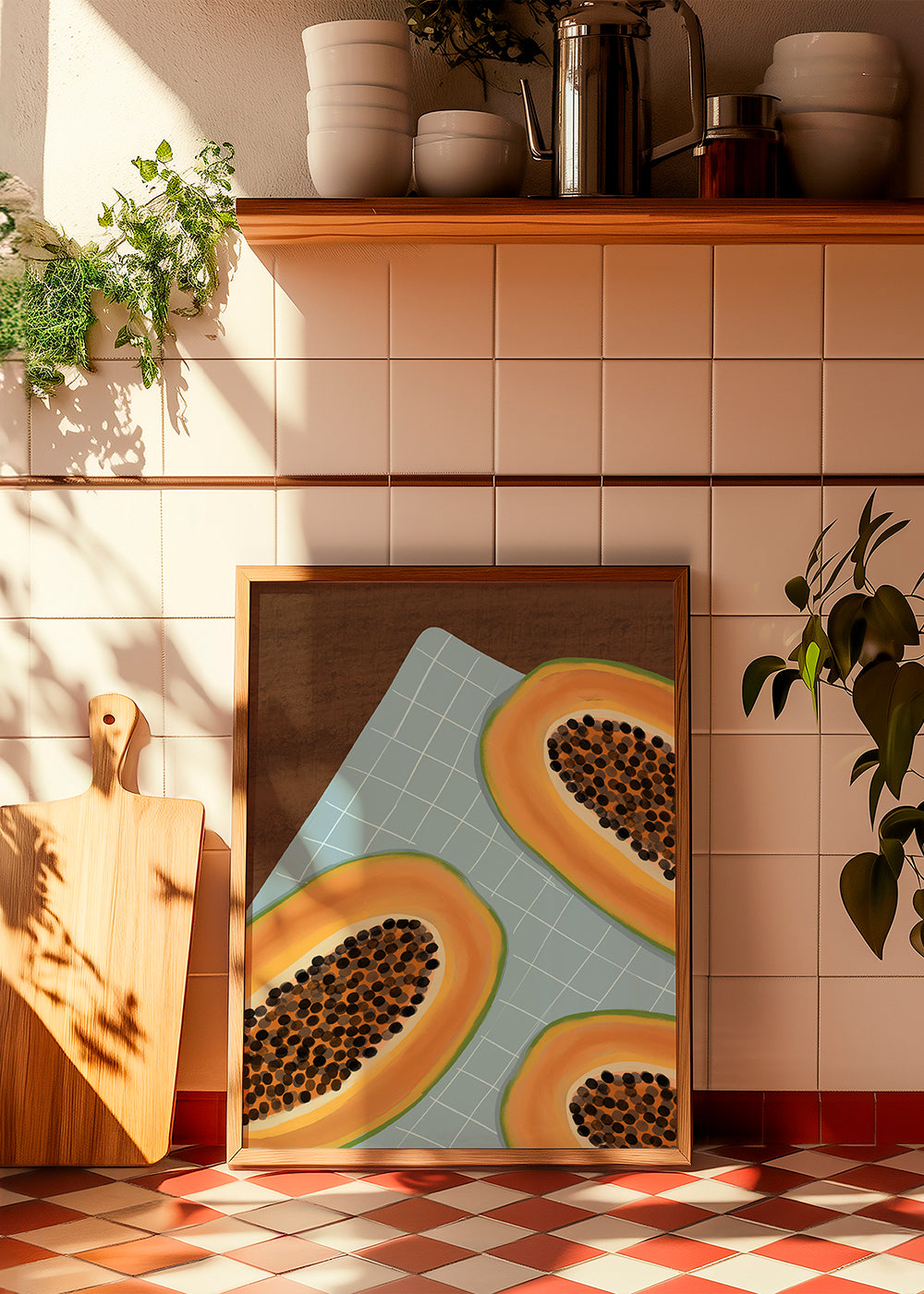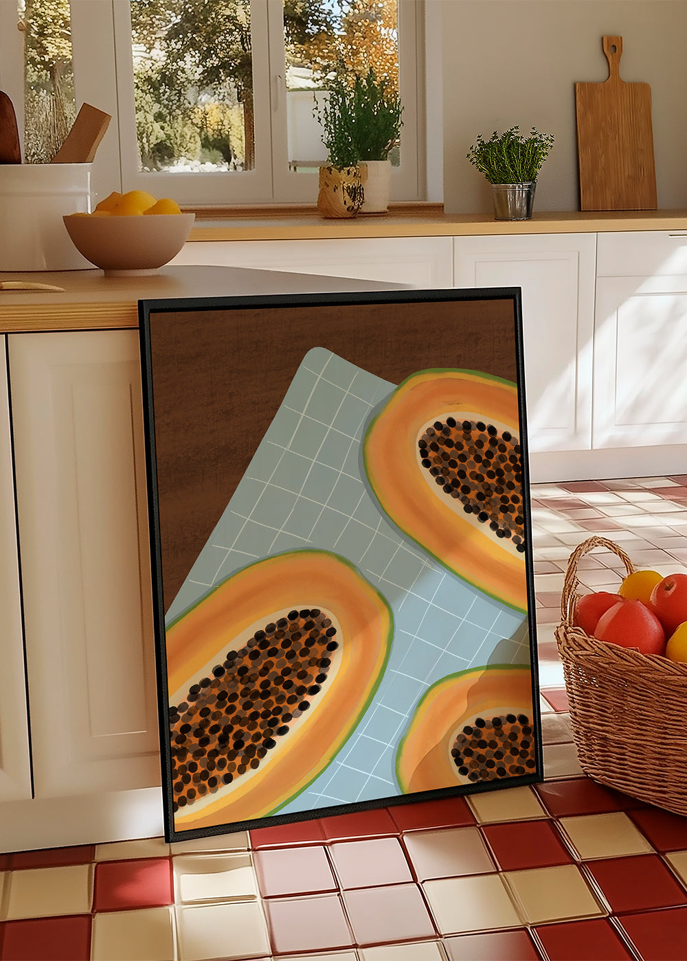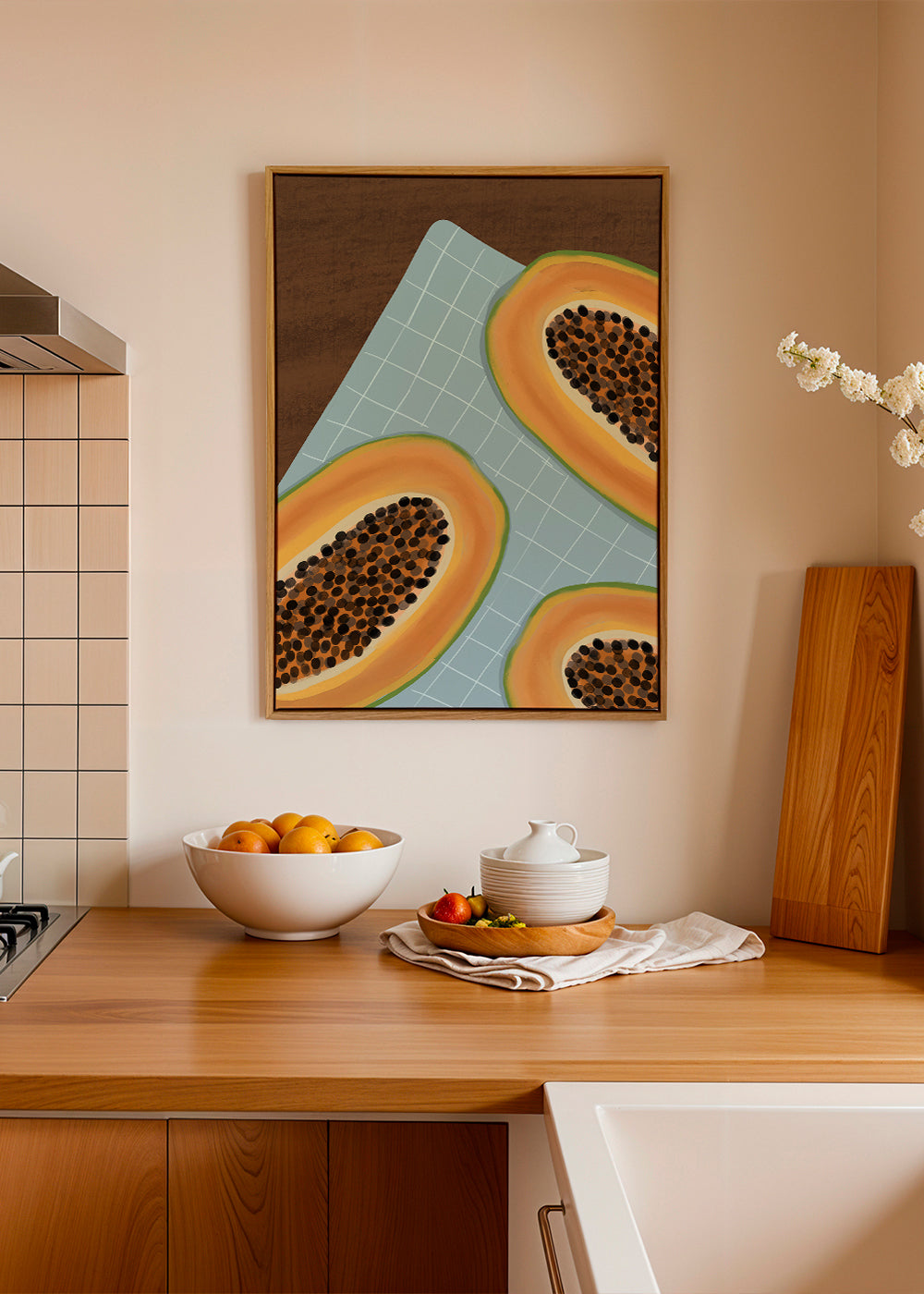 Bonito diseño de nuestro conjunto de cuadros de frutas, de Essentially Nomadic, con tonalidades de colores azules, y de disposición vertical. Convierte tu cocina en un espacio divertido con este y otros cuadros de cocina. Juega con diferentes combinaciones de nuestras obras para conseguir el estilo que buscas.