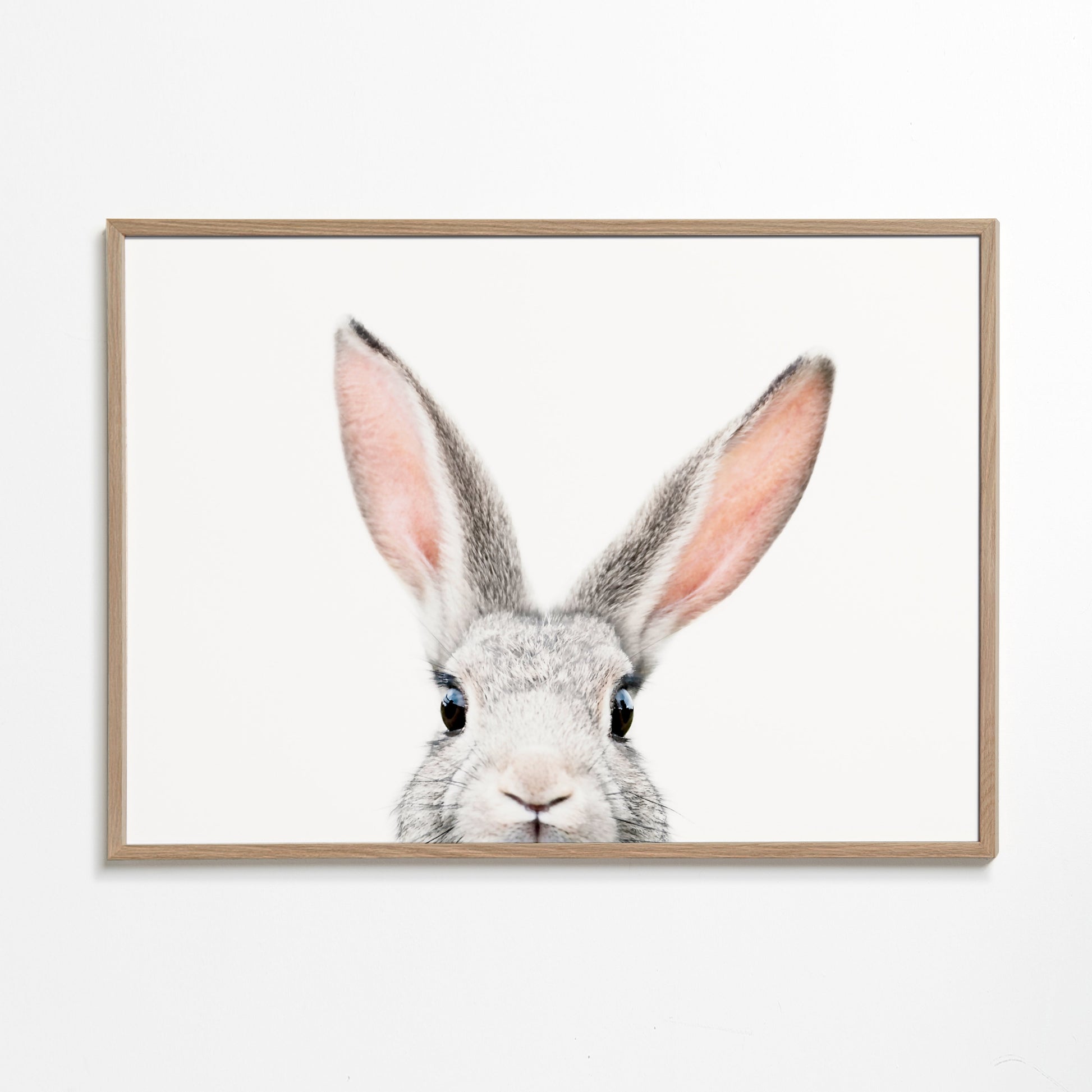 Cuadro infantil de un conejo asomándose por la parte inferior. Esta divertida lámina decorativa quedará genial en la habitación de los pequeños.