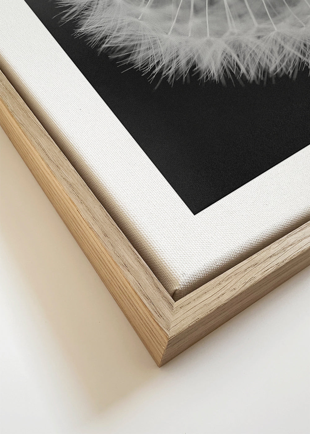 Si seleccionas la opción passepartout, añadiremos el recuadro de cartón blanco al marco, y reduciremos el diseño de la obra. Por ejemplo, si seleccionas una lámina de tamaño 50x70, con marco de color roble y passepartout, reduciremos el diseño de la lámina al tamaño anterior (40x50cm). De esta manera, se adaptará perfectamente a la ventana interior del passepartout.