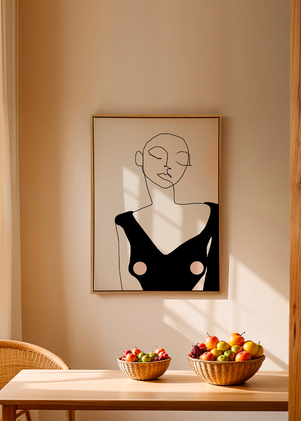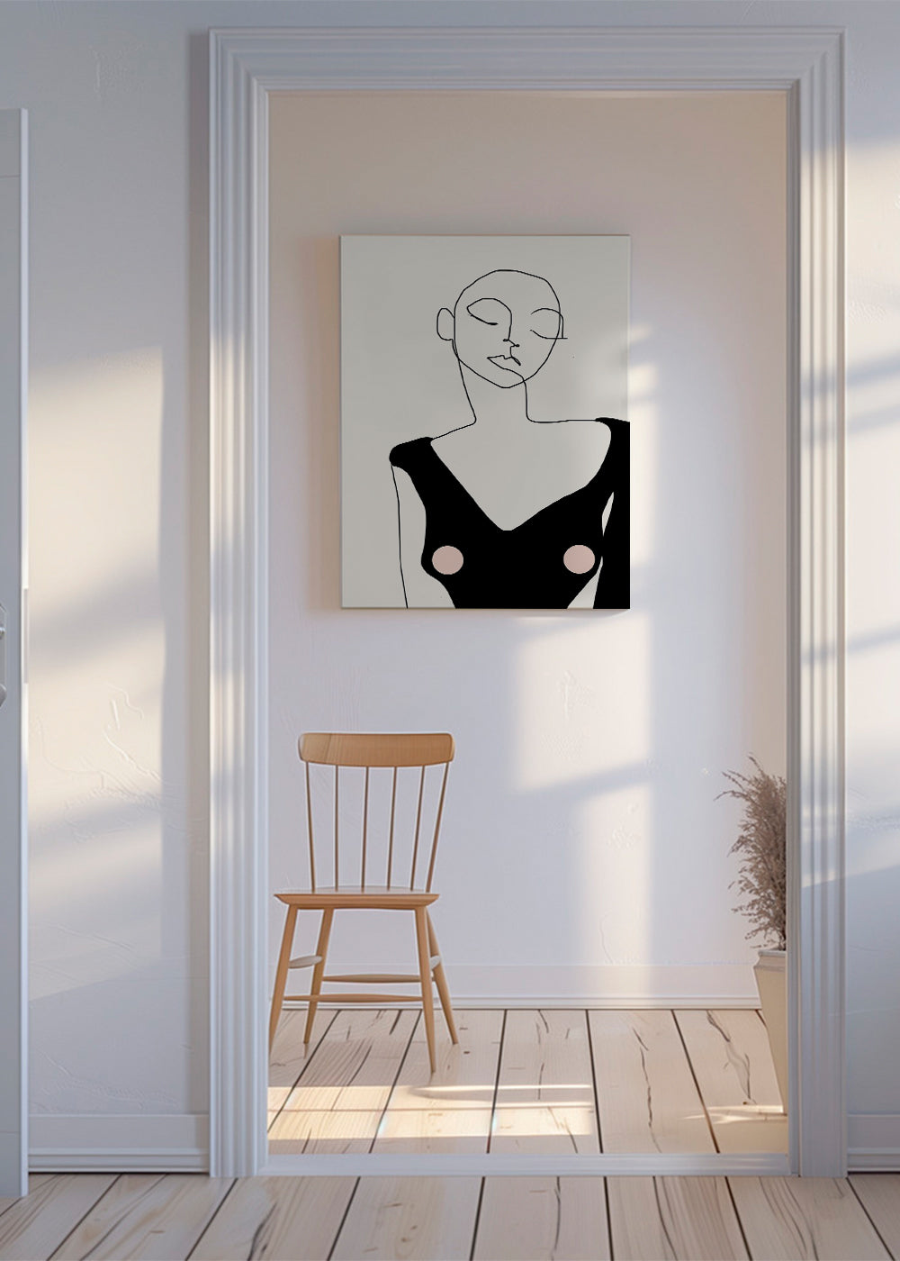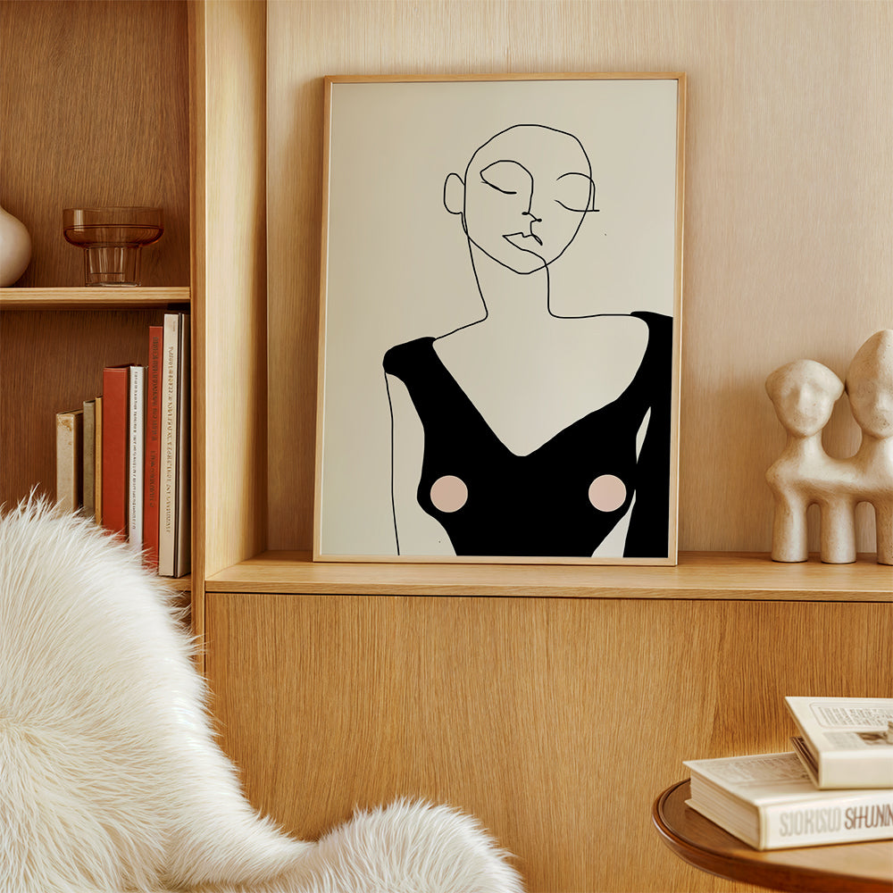 Una obra de la colección cuadros de mujeres, creada por Sophia Novosel, en tonalidades de colores negros, y orientada en vertical. Se trata de una ilustración de estilo sencillo y limpio, combínala con otras ilustraciones para obtener una composición artística. Construye rinconcitos llenos de arte.