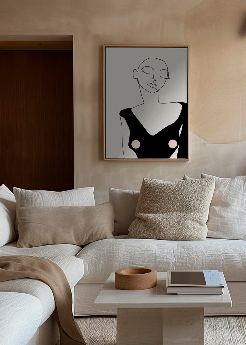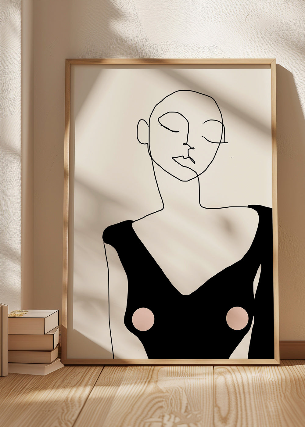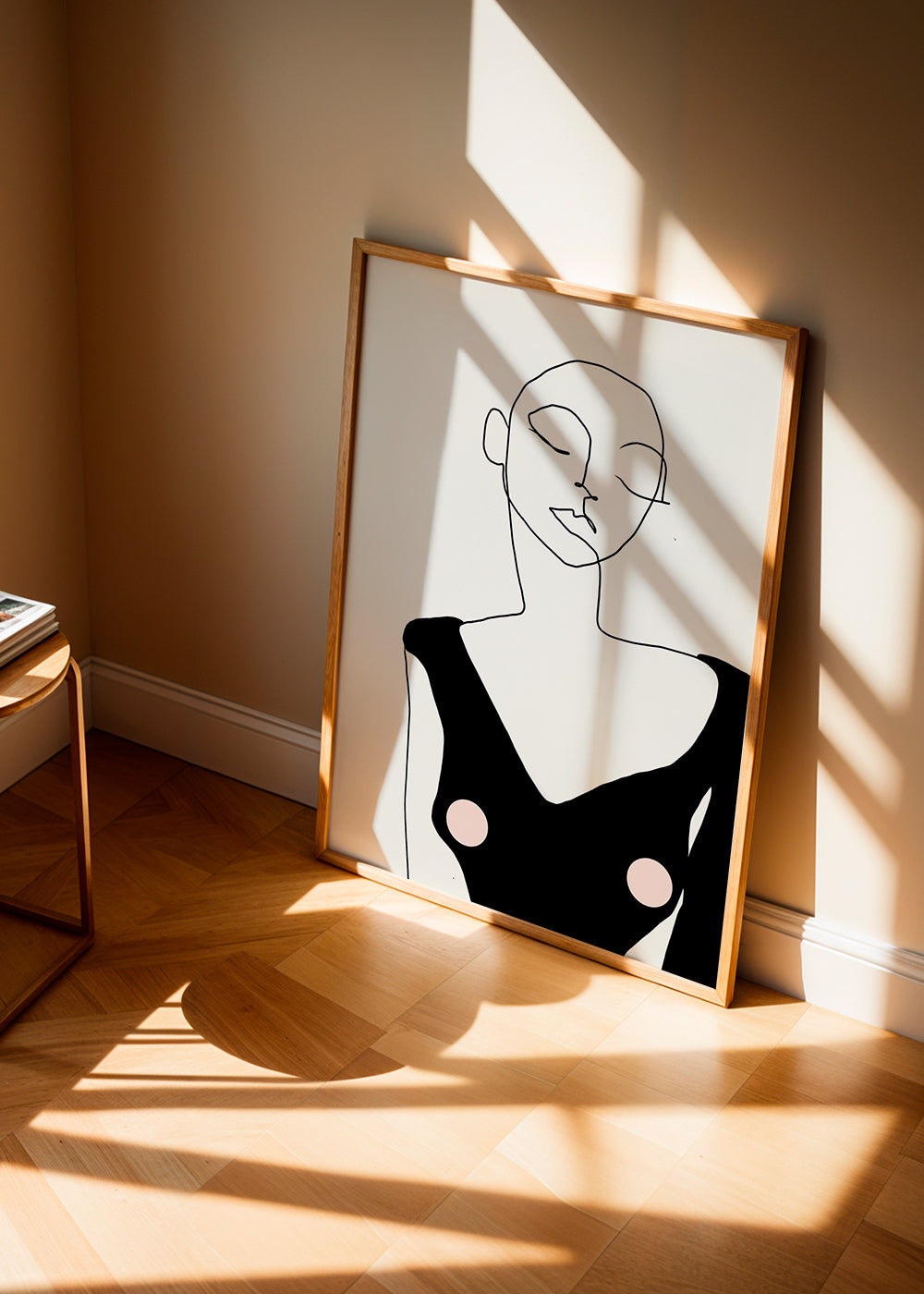 Una obra de la colección cuadros de mujeres, creada por Sophia Novosel, en tonalidades de colores negros, y orientada en vertical. Se trata de una ilustración de estilo sencillo y limpio, combínala con otras ilustraciones para obtener una composición artística. Construye rinconcitos llenos de arte.