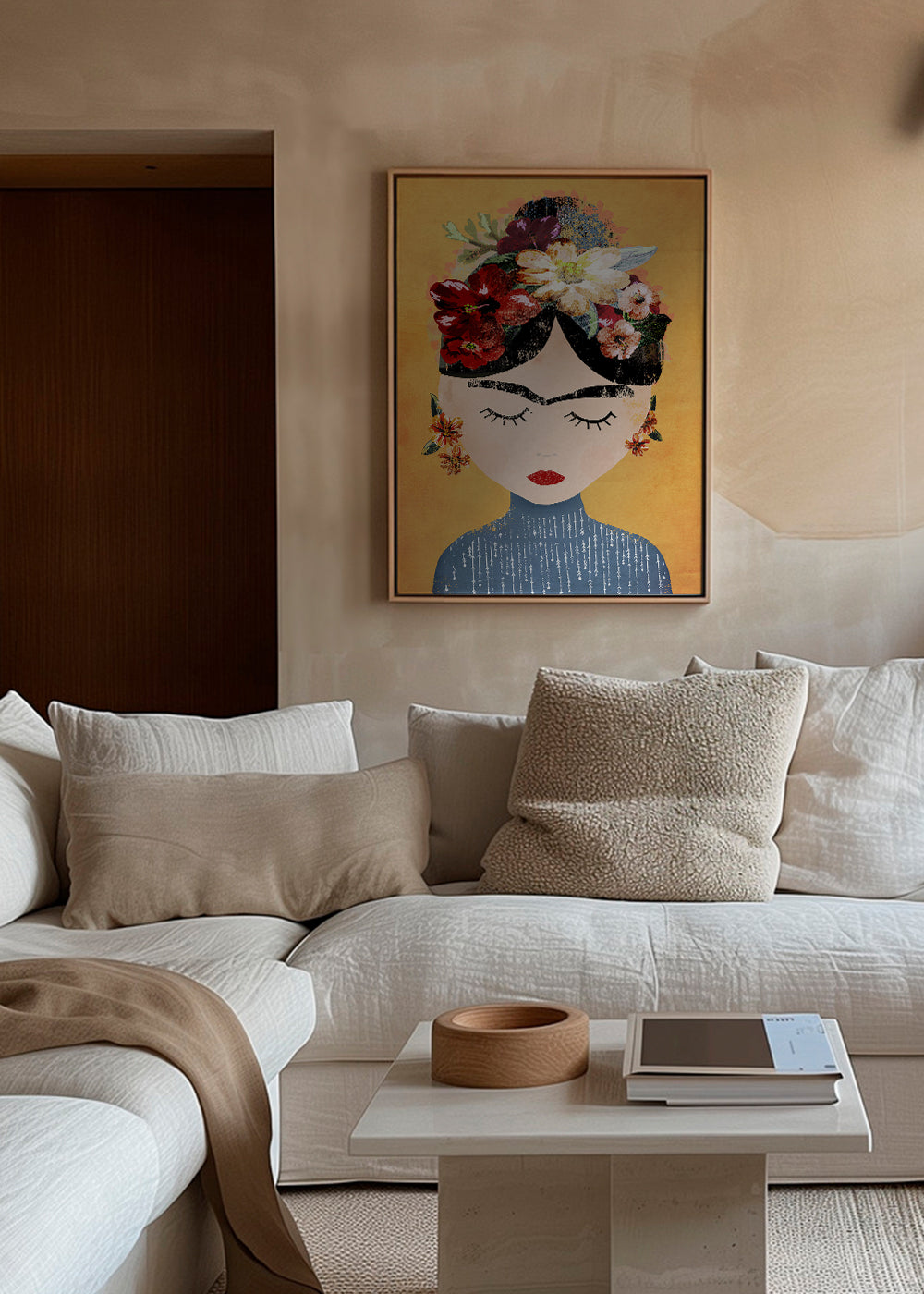 Bonito diseño del estilo de nuestros cuadros y láminas de frida kahlo, concebida por Treechild, de matices multicolor, y para colocar en posición vertical. Los cuadros con ilustraciones son ideales para combinar con arte minimalista y abstracto. Una pieza que seguro dará un plus a la estancia.