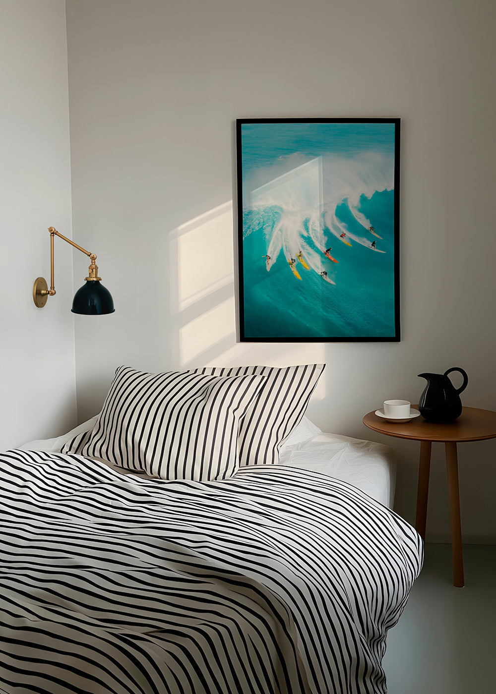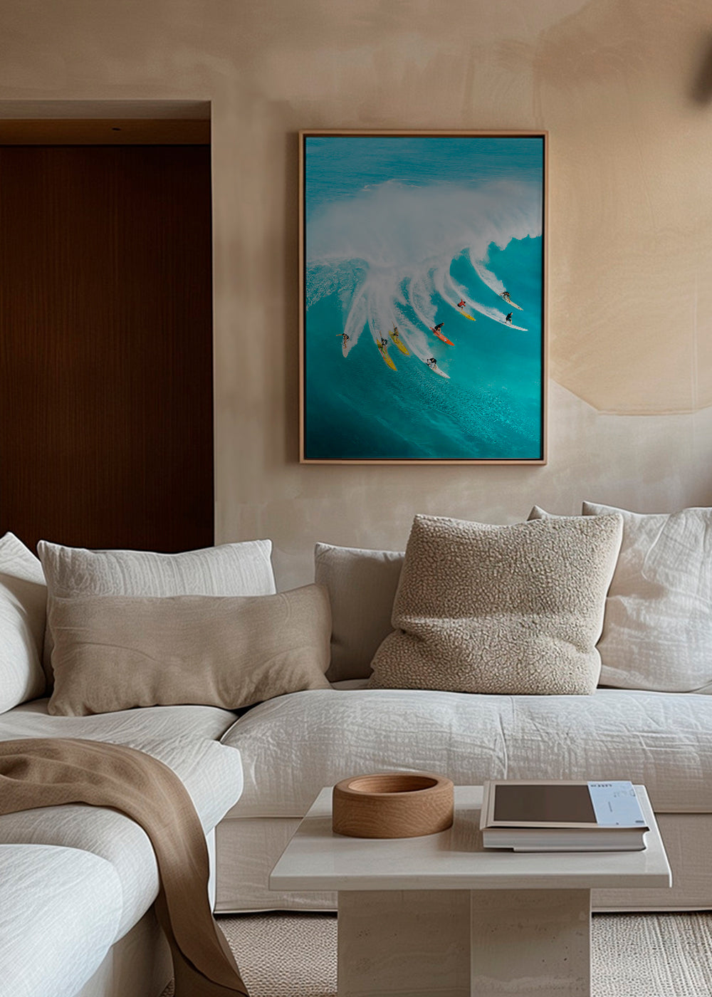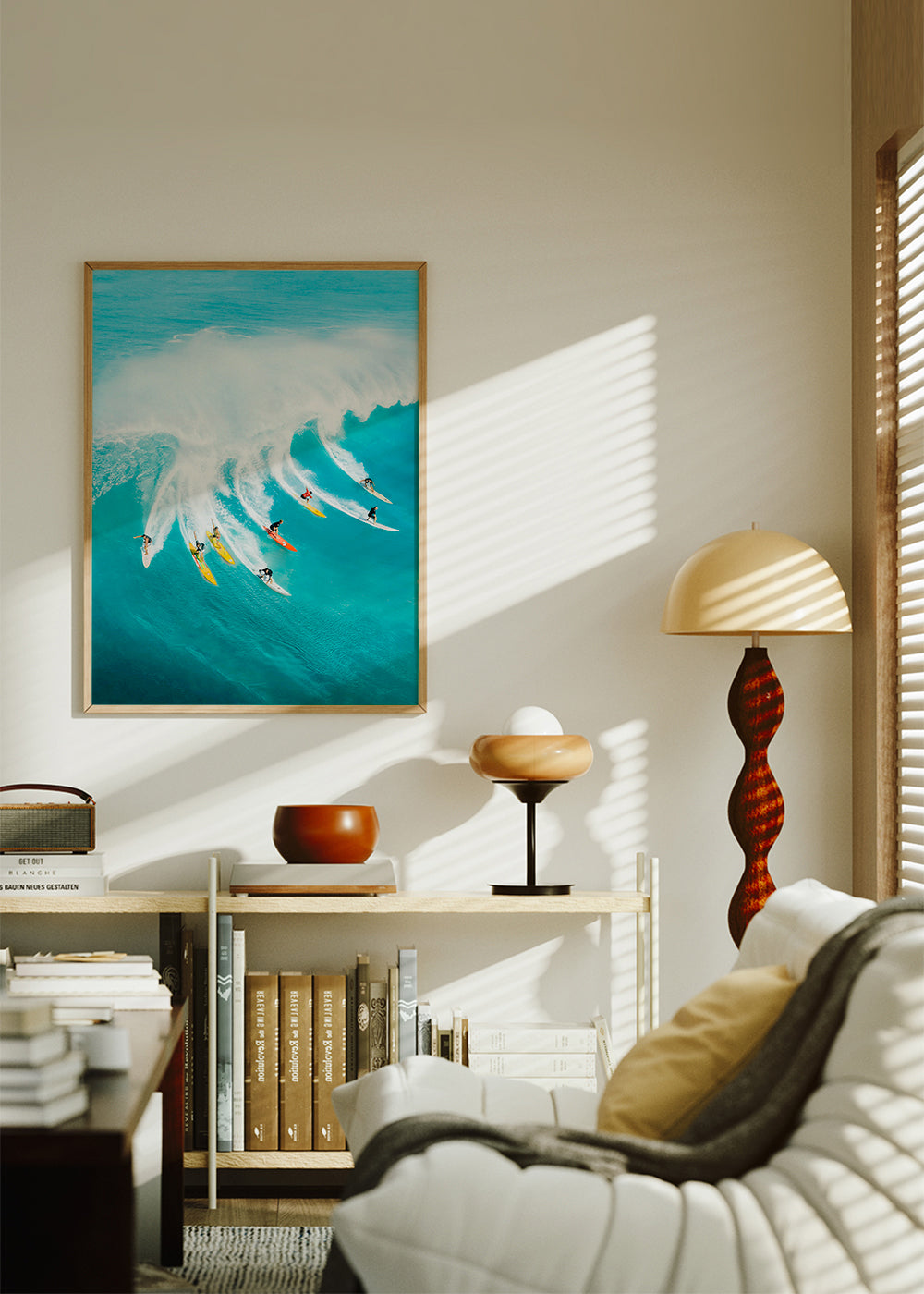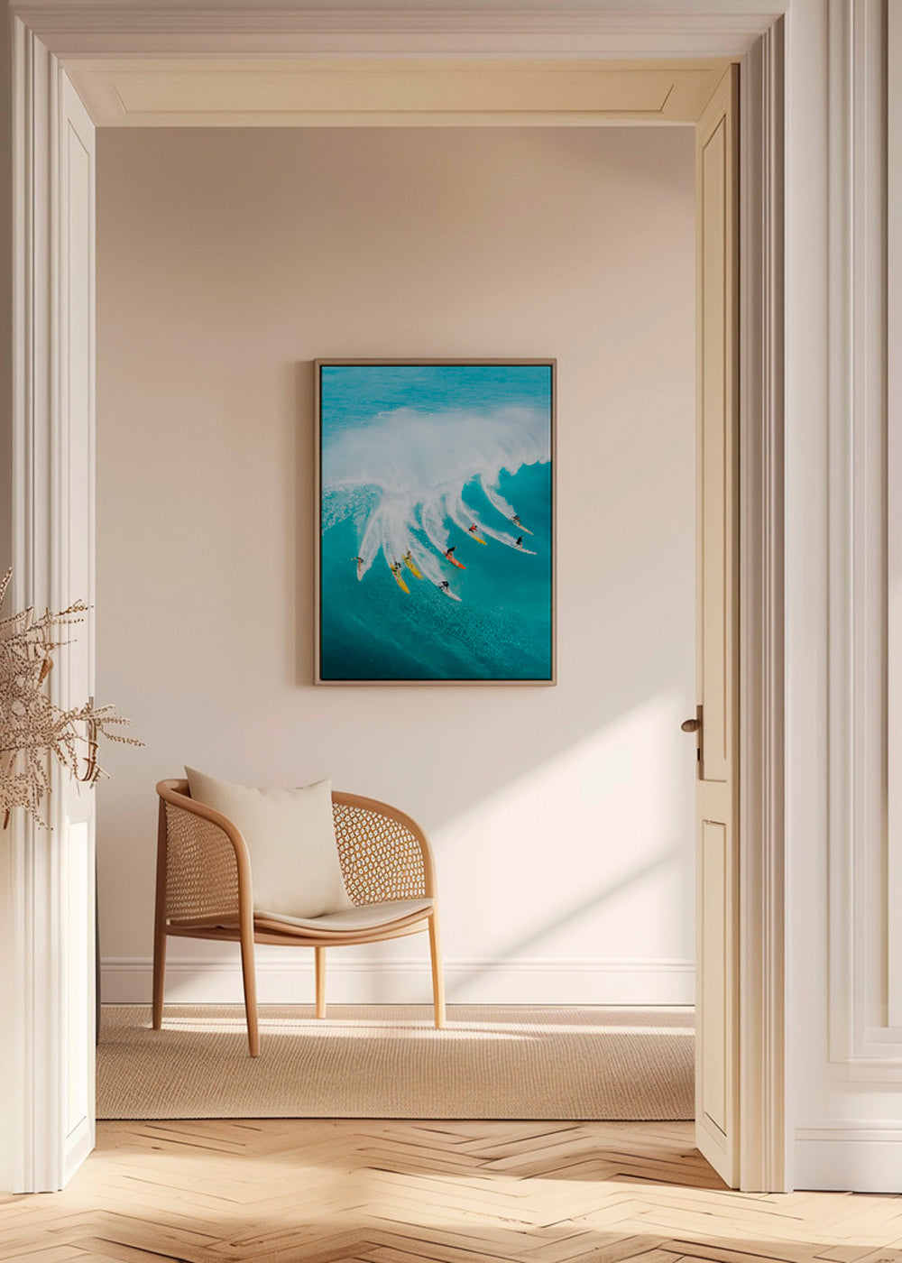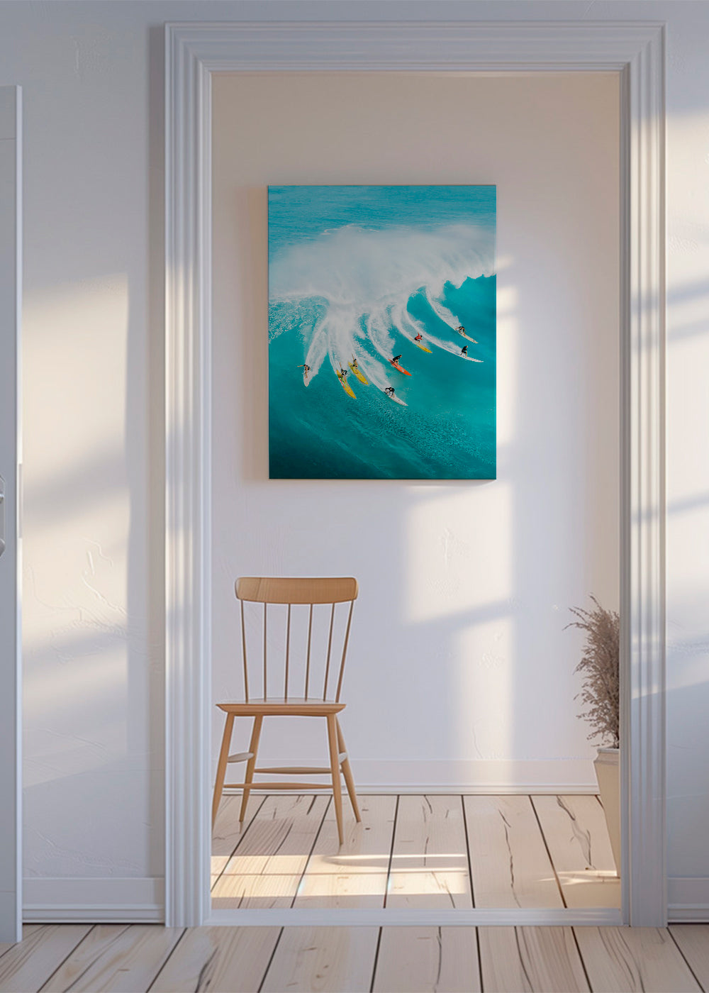 Bonita pieza de la colección cuadros de surf, de Gal Design, con matices de tonos azules, y de formato vertical. La naturaleza en su máximo esplendor, los cuadros con paisajes transmiten mucha calma. Un hogar se viste por las paredes.