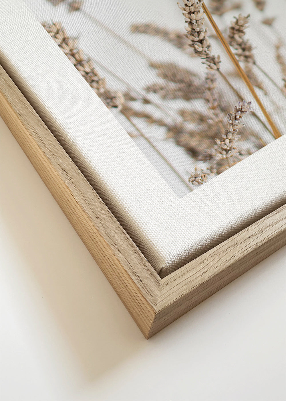 Si seleccionas la opción passepartout, añadiremos el recuadro de cartón blanco al marco, y reduciremos el diseño de la obra. Por ejemplo, si seleccionas una lámina de tamaño 50x70, con marco de color roble y passepartout, reduciremos el diseño de la lámina al tamaño anterior (40x50cm). De esta manera, se adaptará perfectamente a la ventana interior del passepartout.