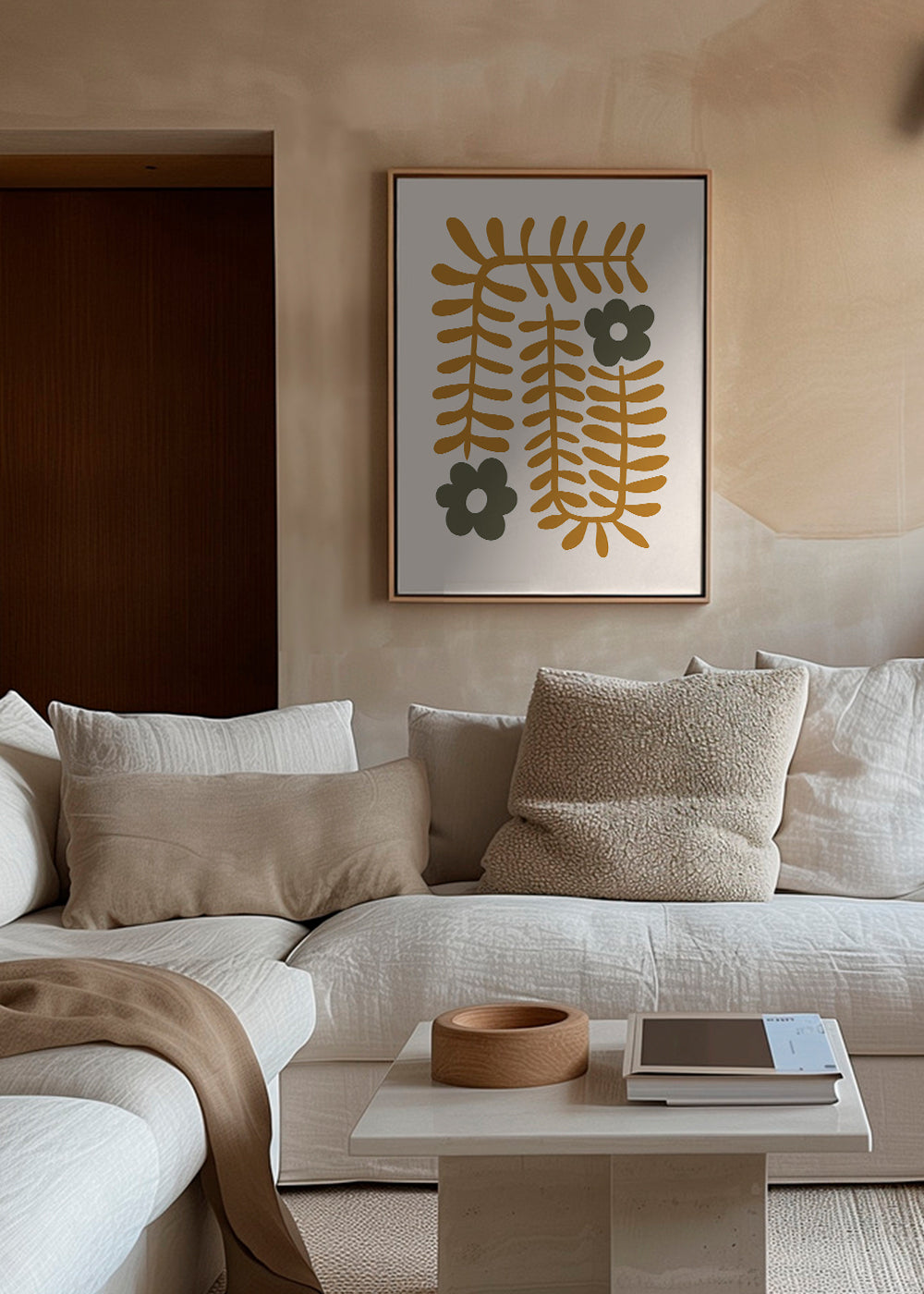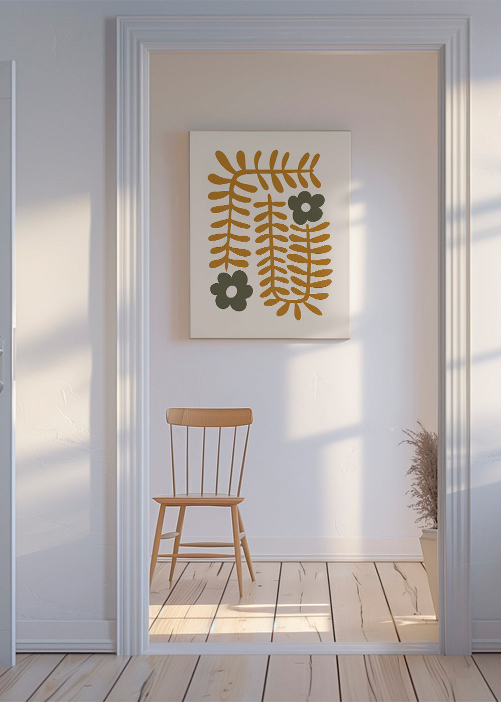 Un póster de la colección cuadros de flores y plantas, perteneciente a la colección de Essentially Nomadic, con pigmentos naranjas, y en formato vertical. Los cuadros con ilustraciones dan un toque original a la decoración del hogar. Crea rincones especiales.