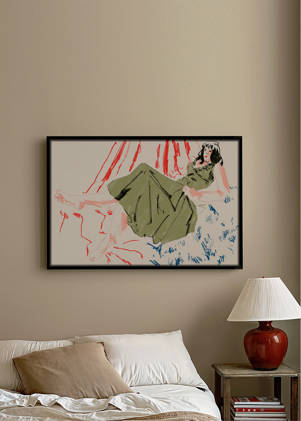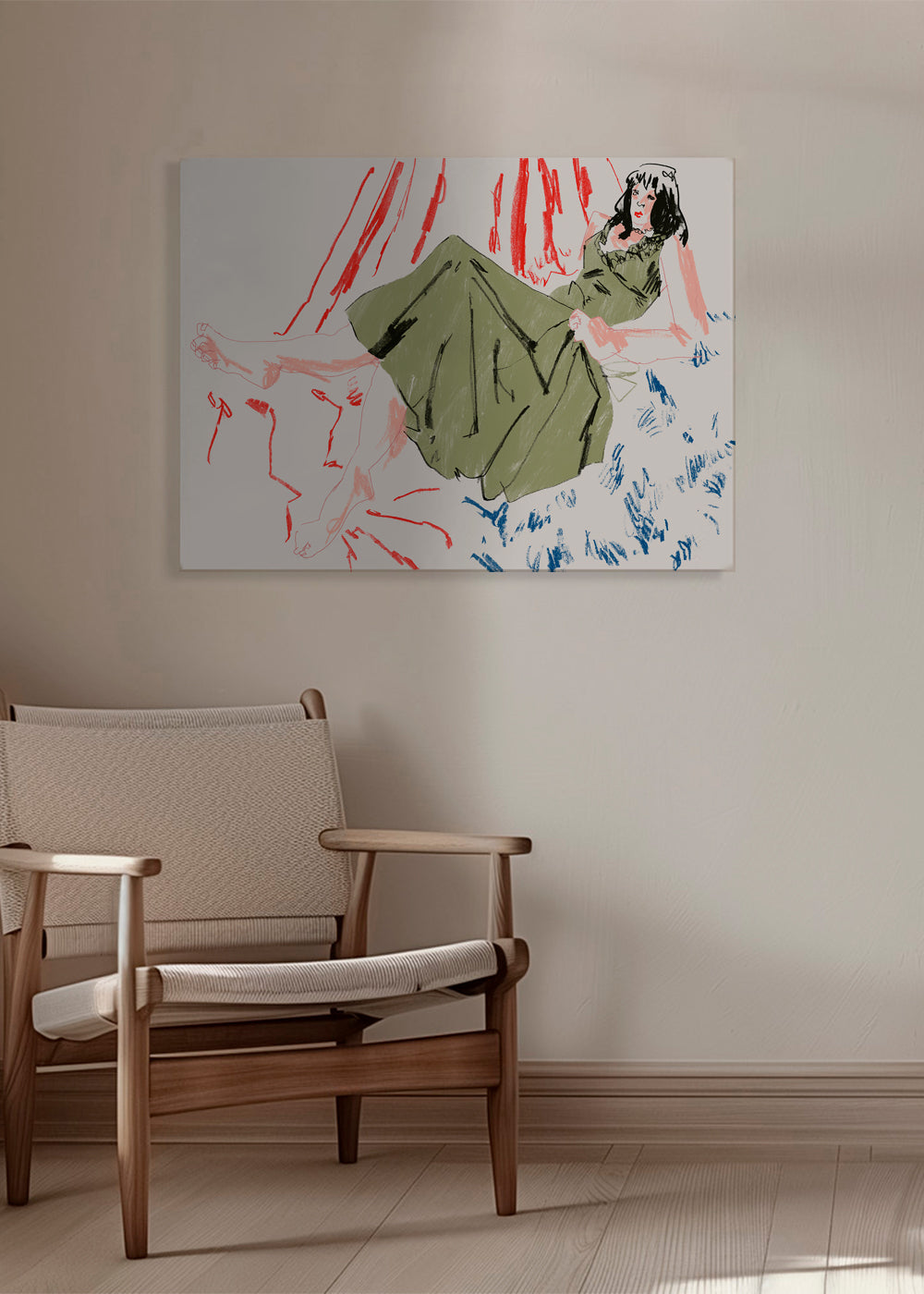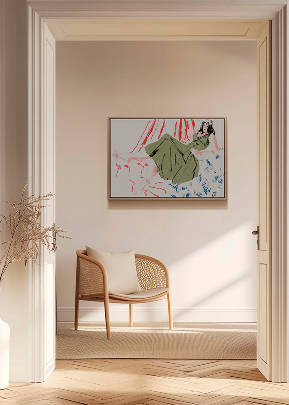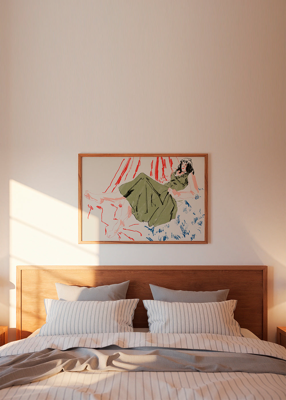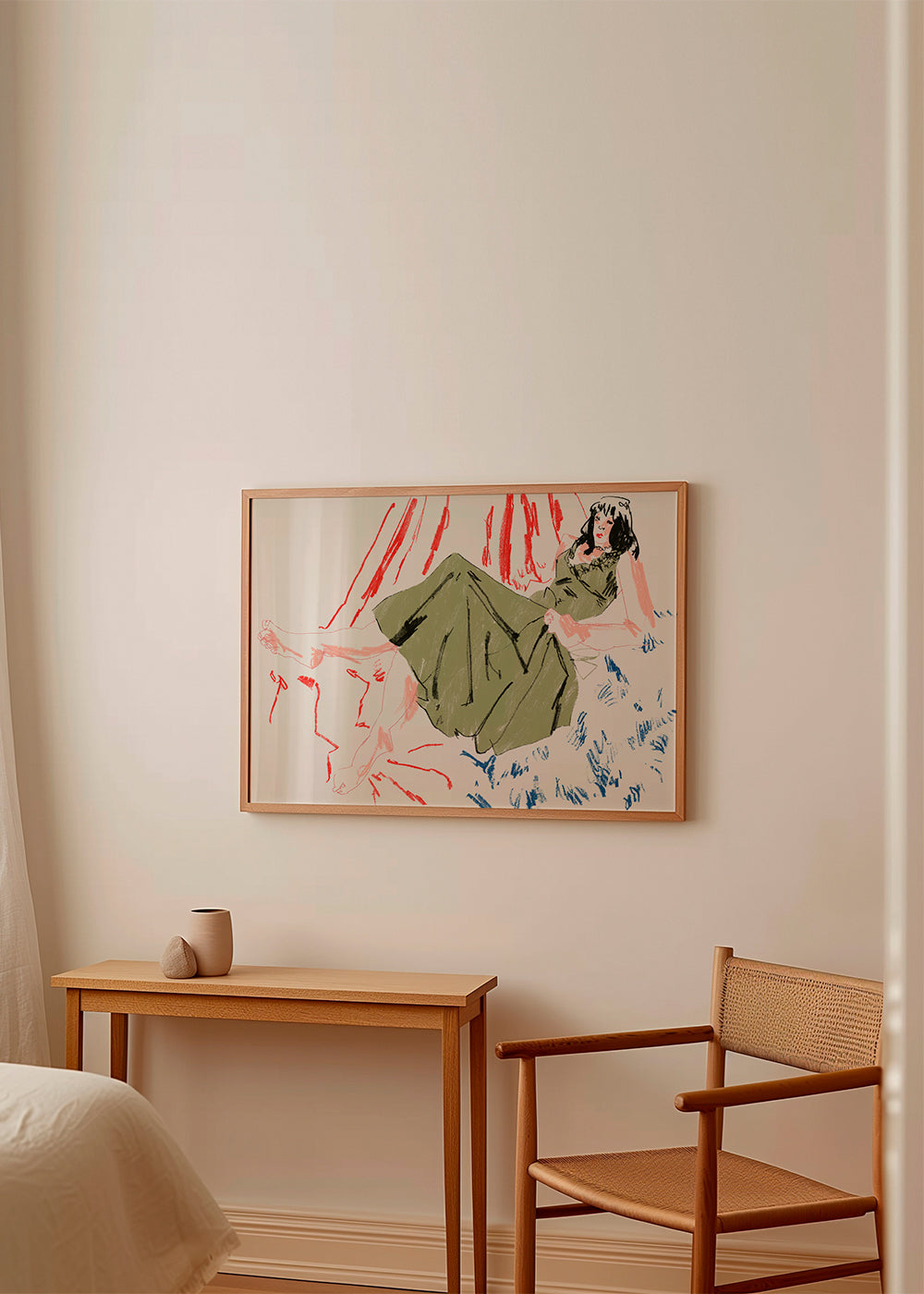 Una lámina de la colección cuadros de mujeres, de la mano de 1x, con tonos verdes, y de formato horizontal. Los cuadros con ilustraciones dan un toque original a la decoración del hogar. Deja tus paredes a cuadros.