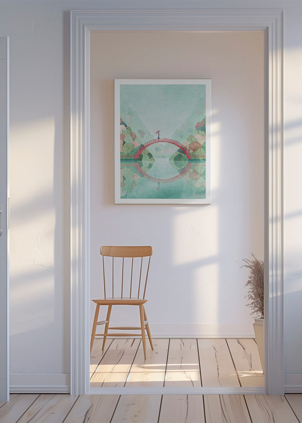 Una lámina de la colección cuadros japoneses, creada por Henry Rivers, en tonos rojos, y de posición vertical. El arte minimalista aporta tranquilidad y armonía al interiorismo del hogar Dale un toque artístico a tu decoración.