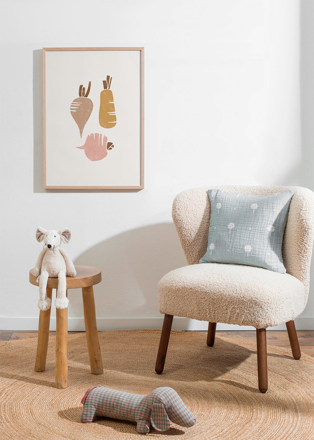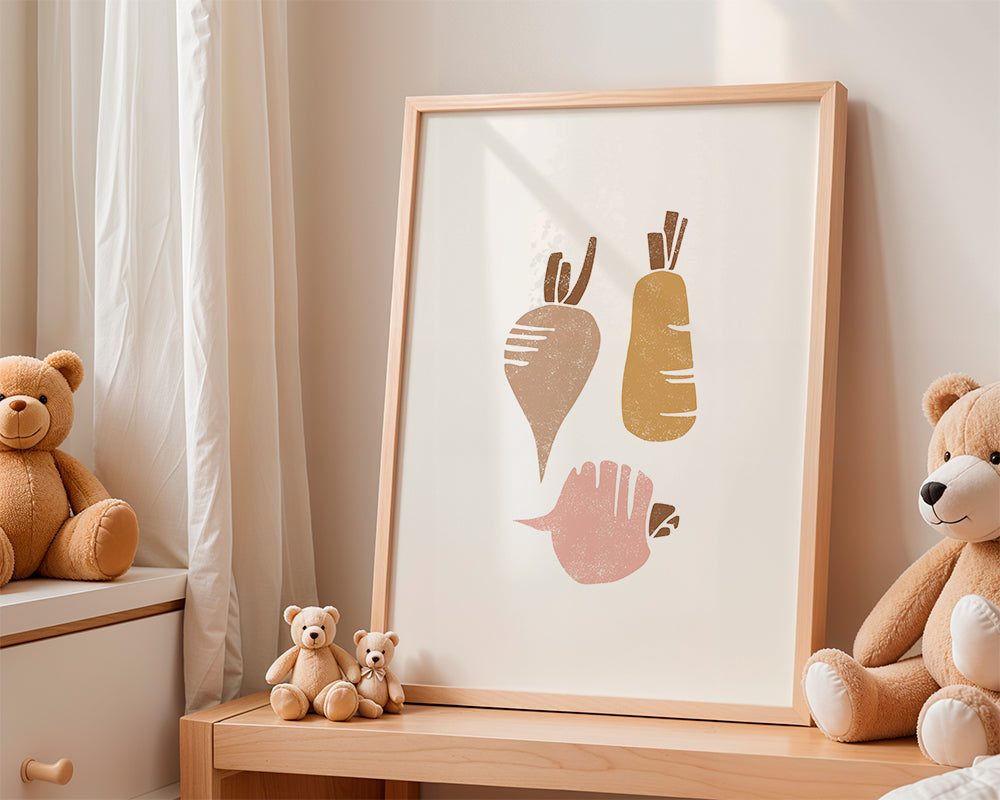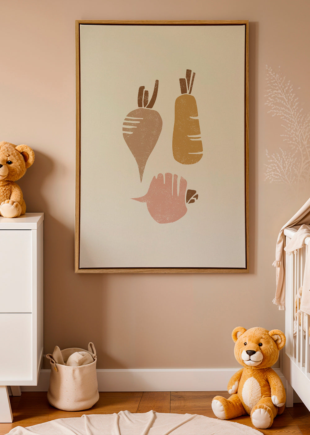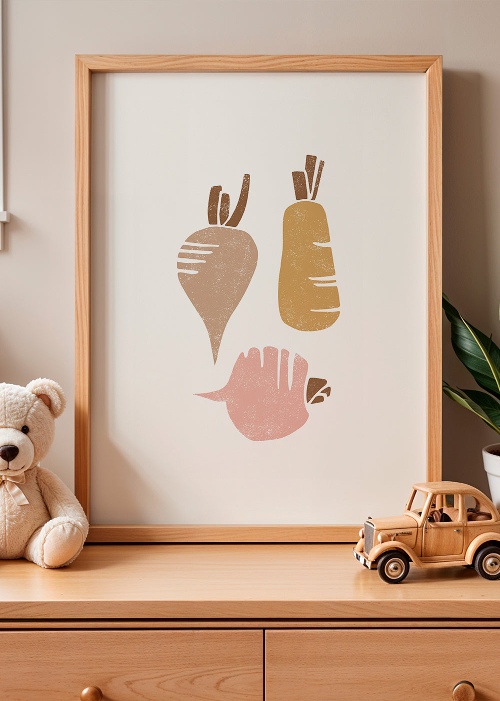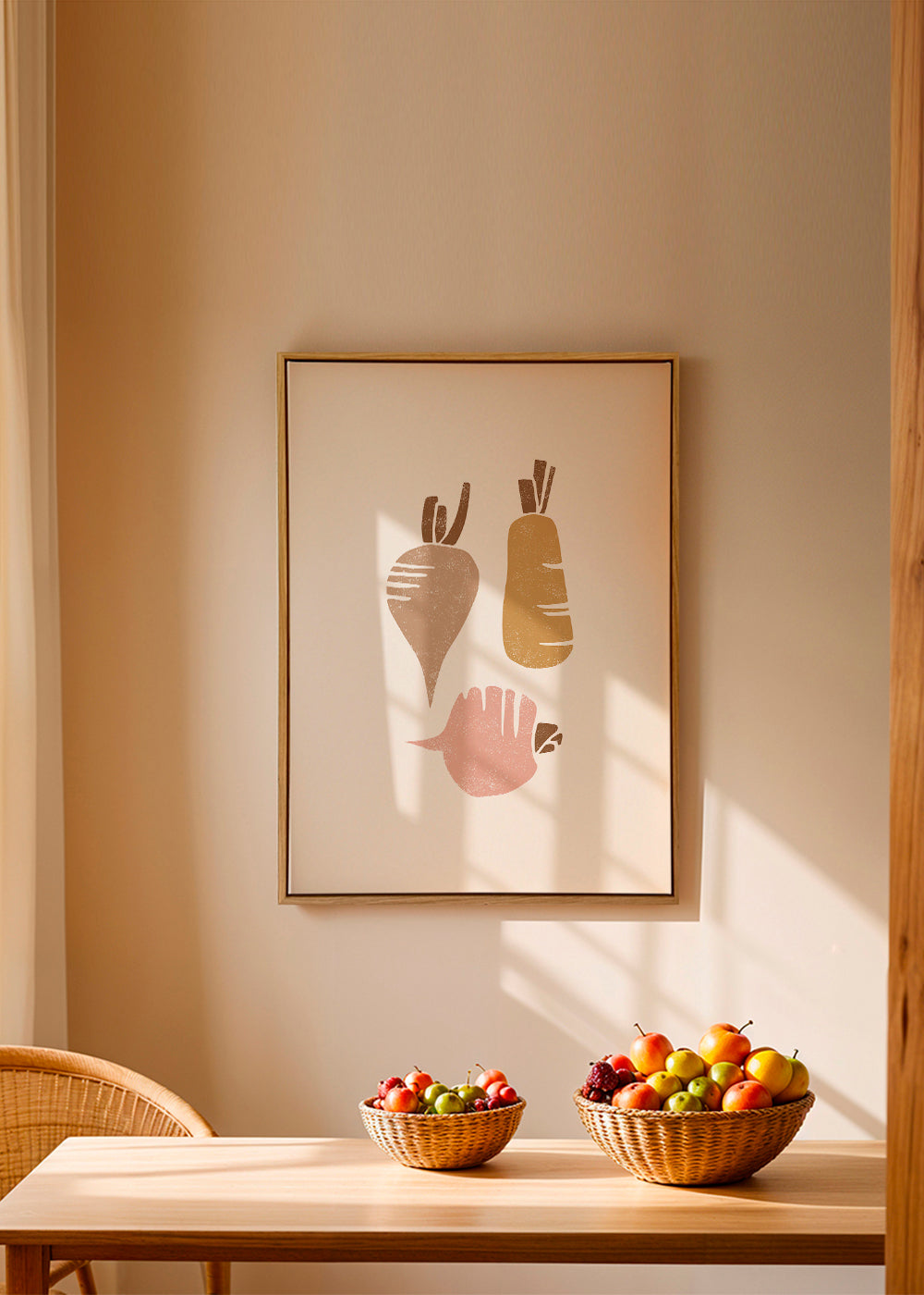 Bonita obra de nuestra selección de cuadros de verduras y hortalizas, creada por Marta Munte, de matices rosas, y orientada en vertical. Los cuadros con ilustraciones dan un toque original a la decoración del hogar. No hay paredes feas o bonitas, hay paredes vacías o paredes llenas.
