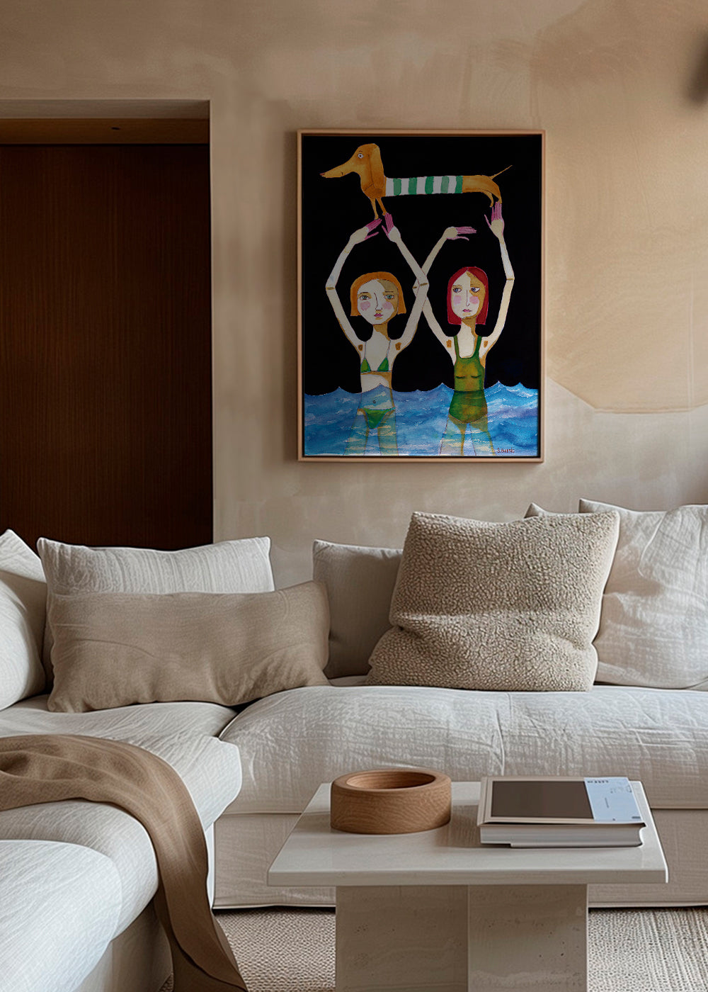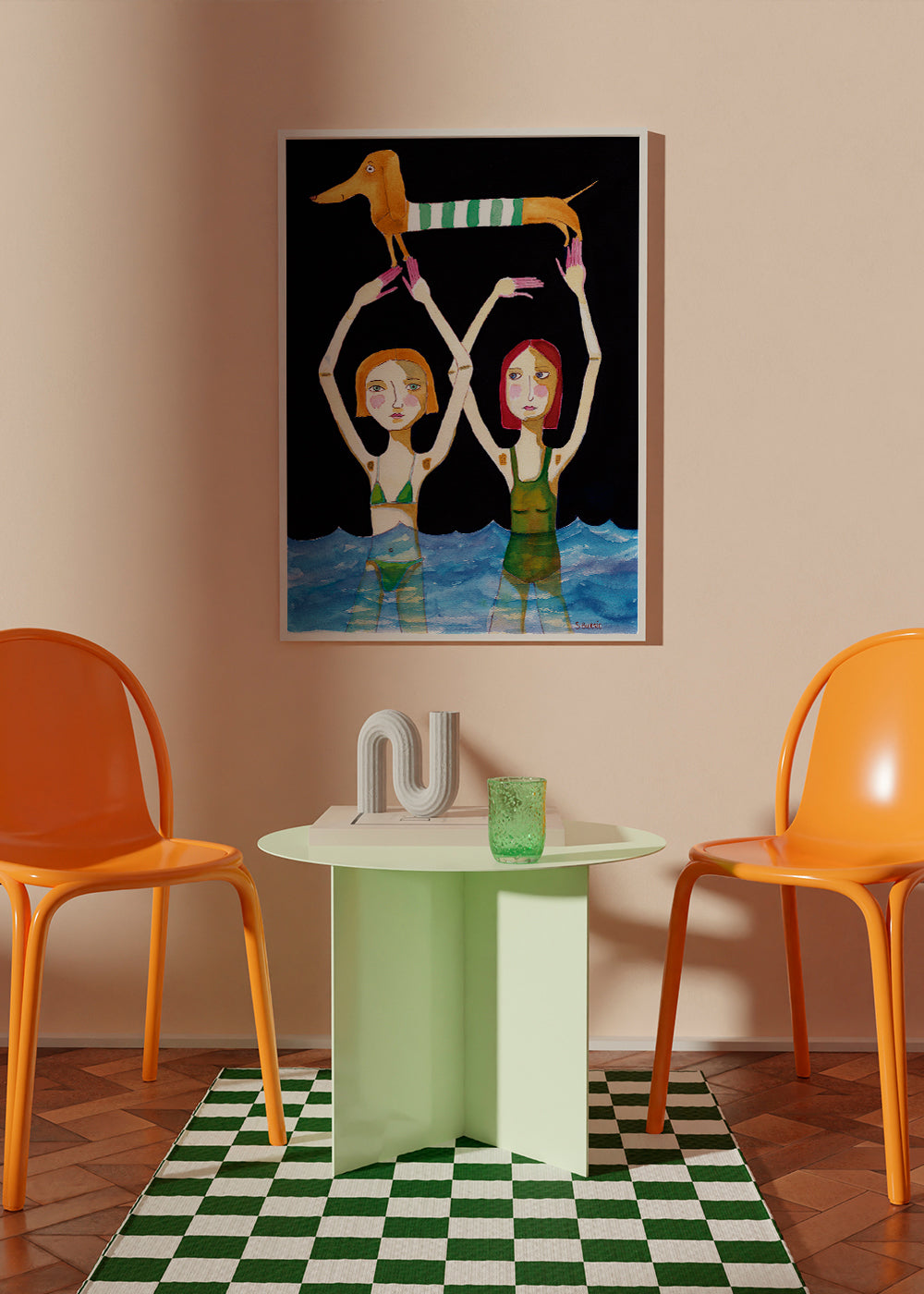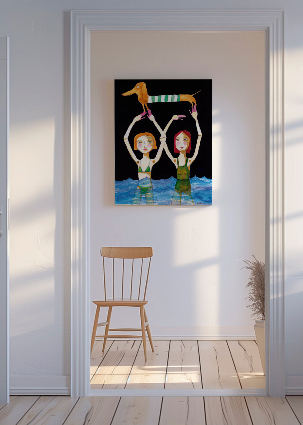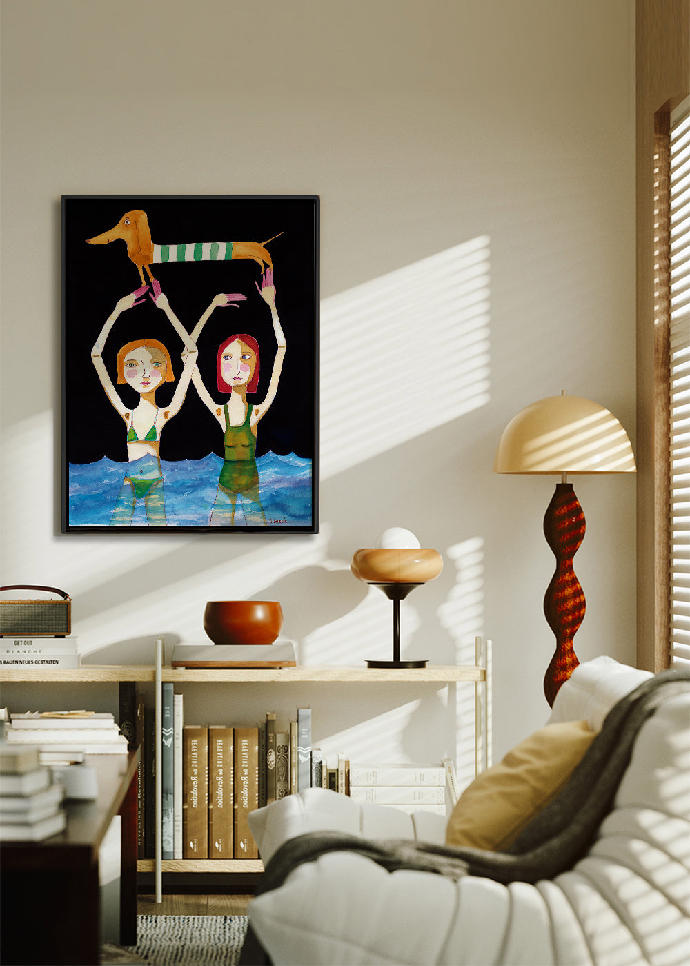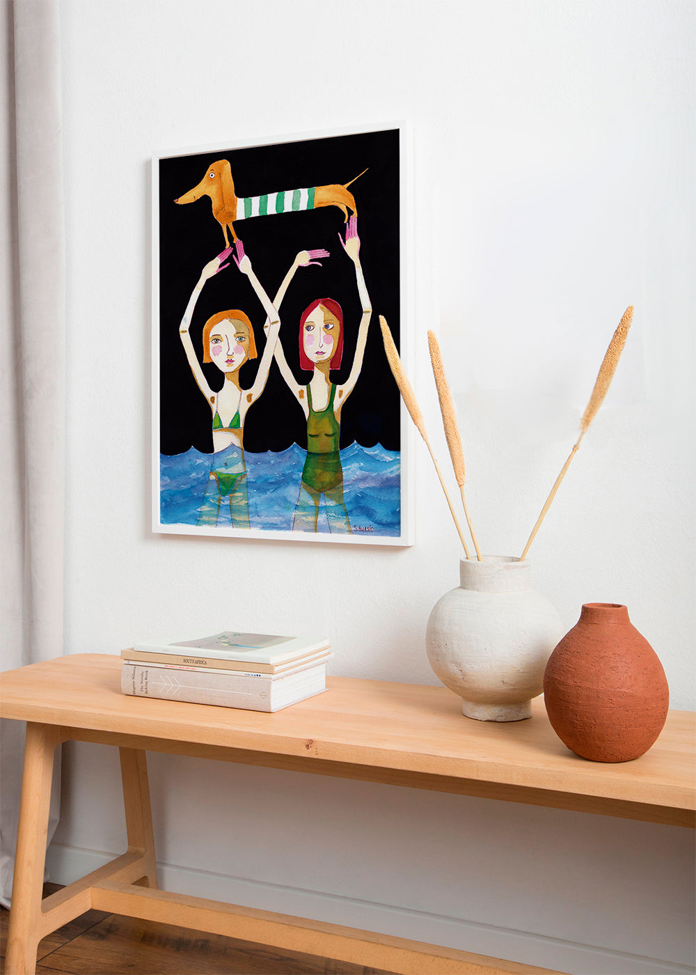 Cuadro de estilo nórdico Swimming Girls with Sausage Dog - Sharyn Bursic