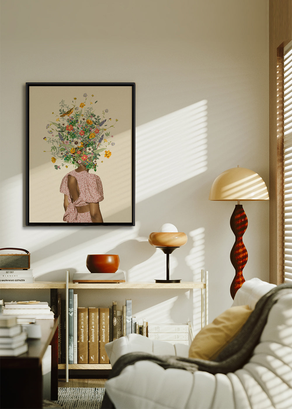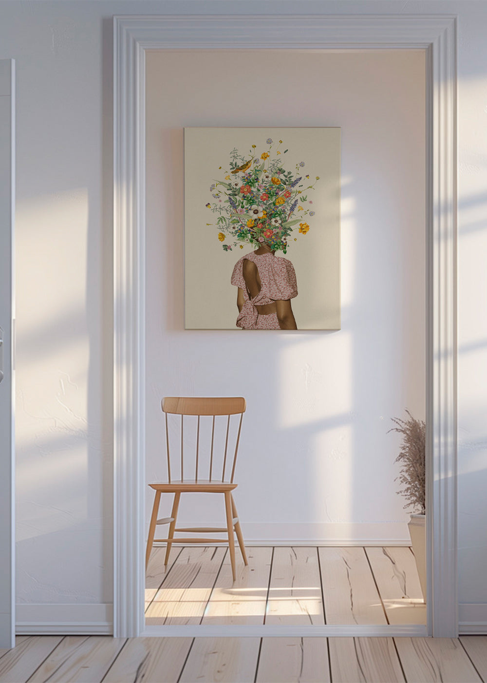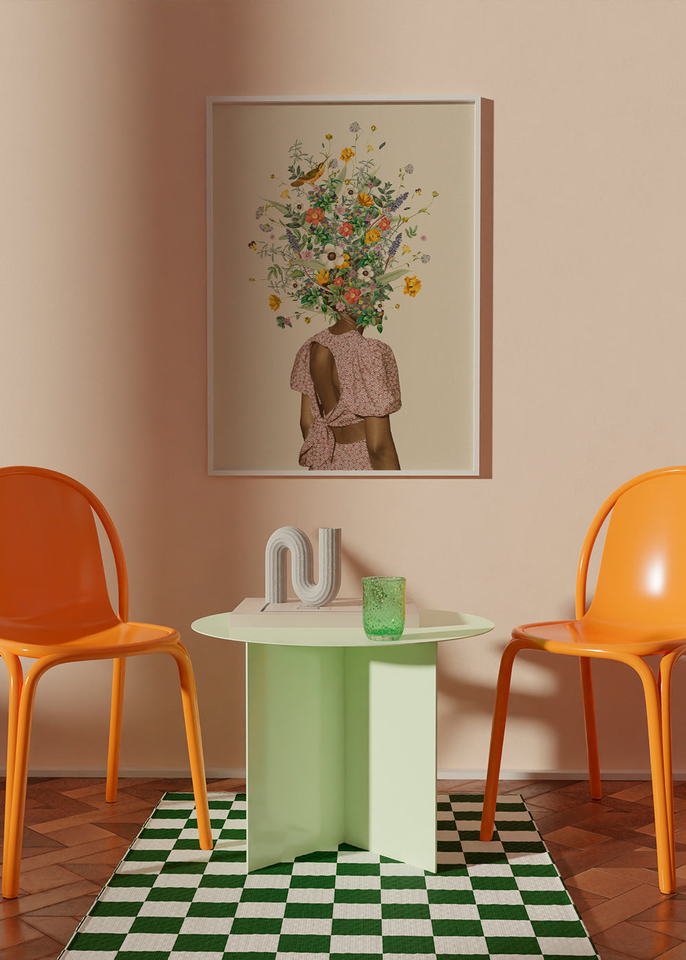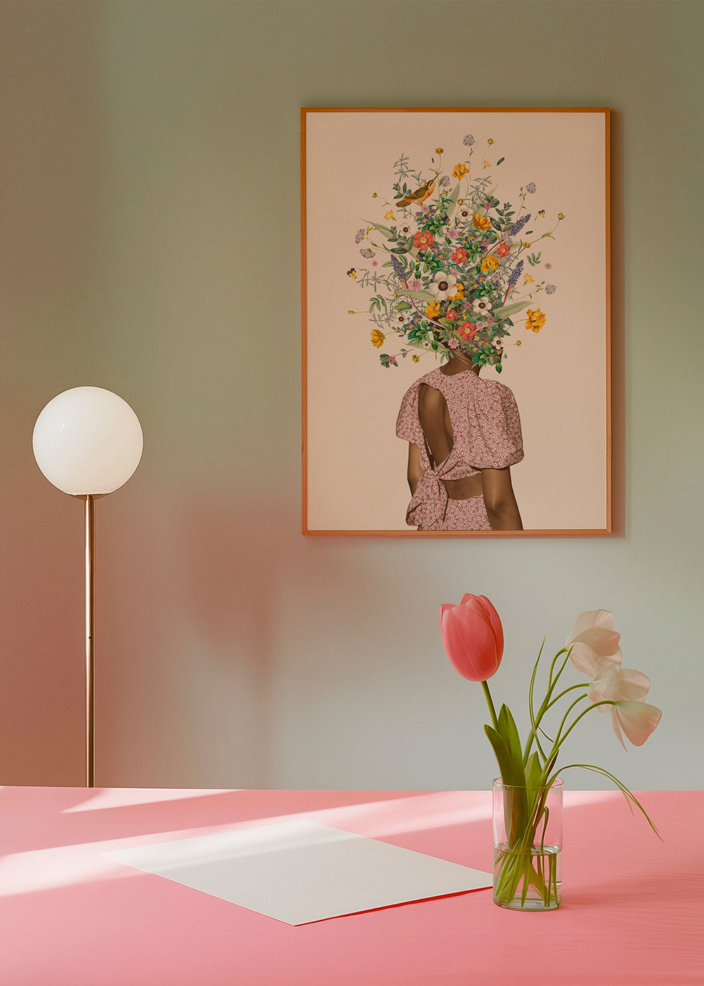 Un diseño de nuestra selección de cuadros de mujeres, de la mano de Frida Floral Studio, con tonos verdes, y para colgar en posición vertical. Una obra de estilo retro ideal para una decoración con toques vintage. Paredes llenas de creatividad.