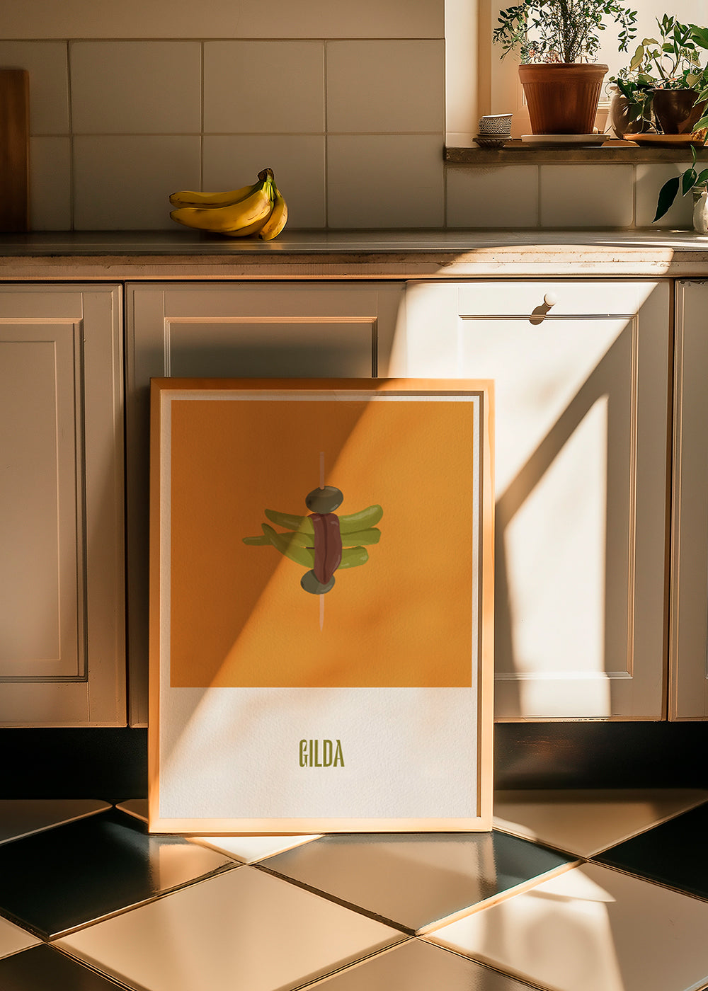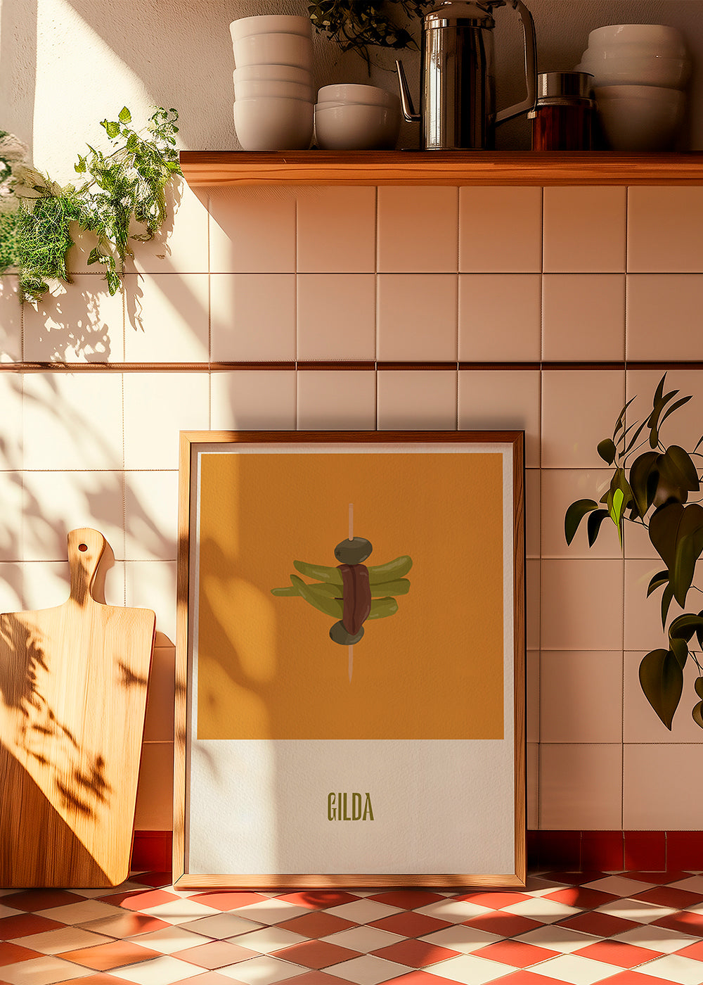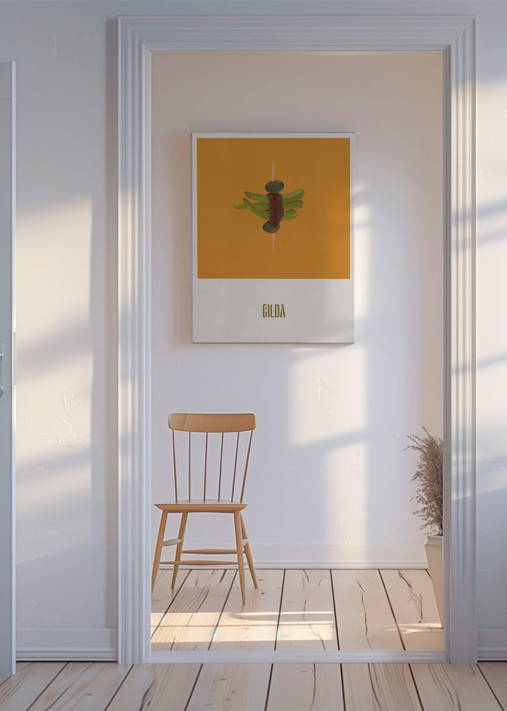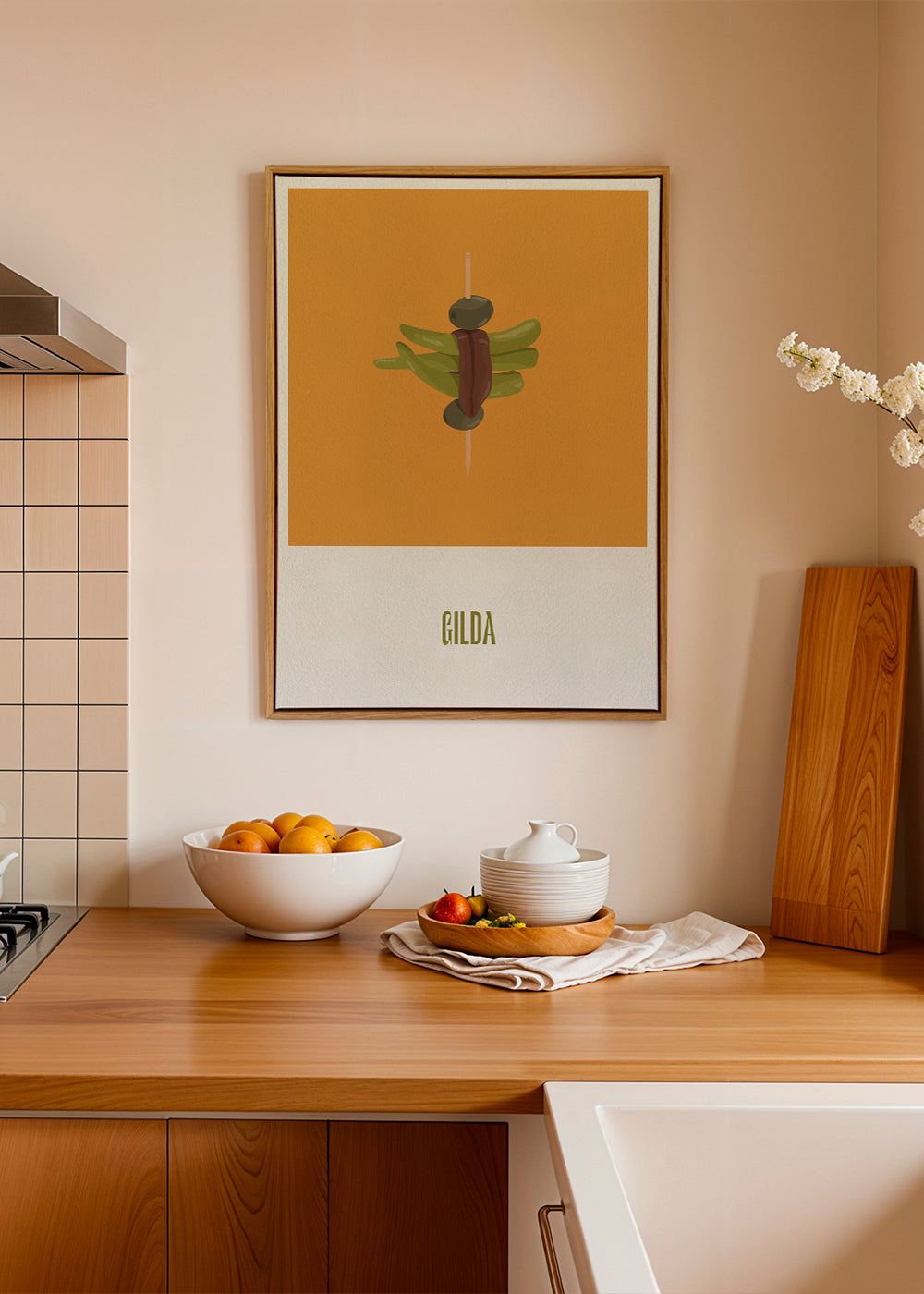 Una lámina de la colección cuadros de comida y bebida, hecha por Nerea Ramírez, con pigmentos naranjas, y de posición vertical. Llena tu cocina de arte combinando esta obra con otros diseños ideales para cocina. Deja que el arte inunde tu hogar.