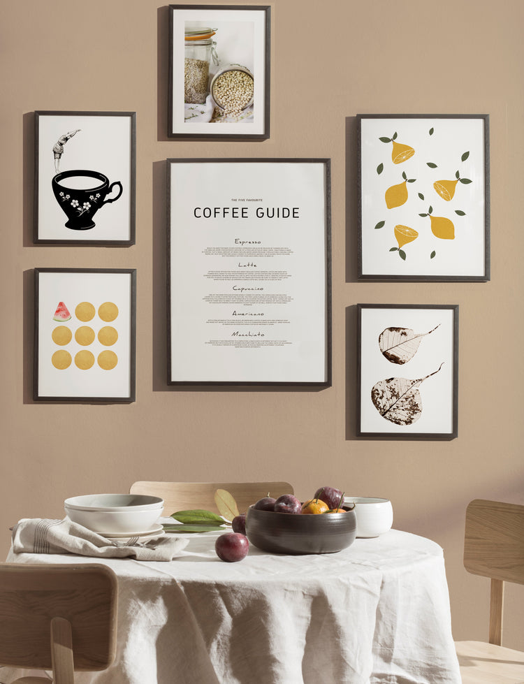 Moderna lámina decorativa para cocina con los diferentes tipos de café que existen: Espresso, Latte, Capuccino, Americano, Macchiato.