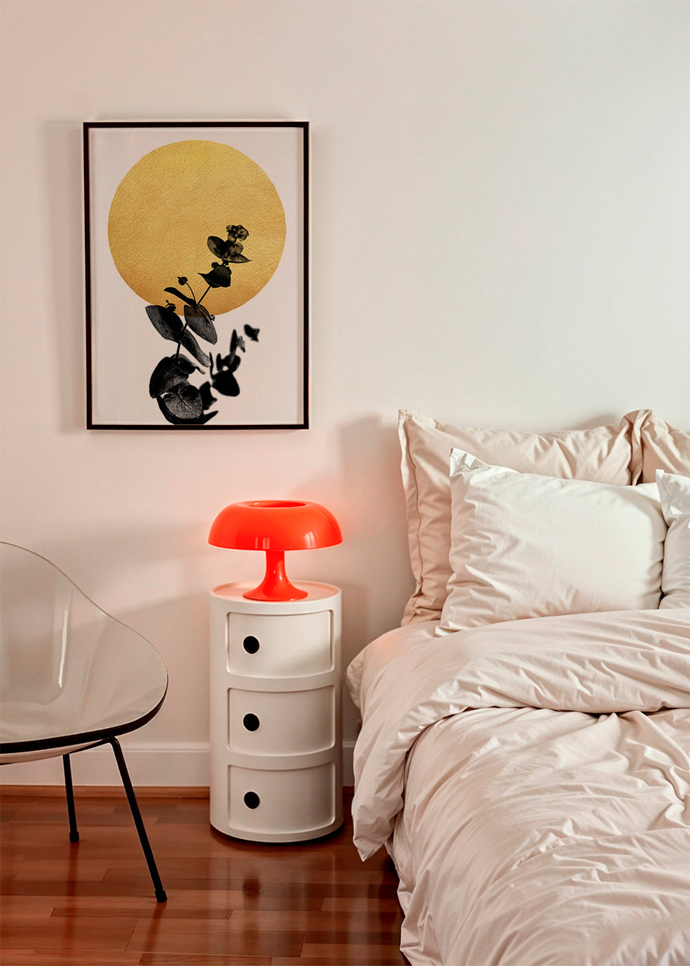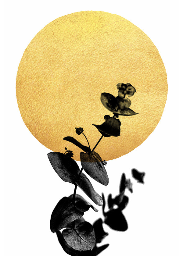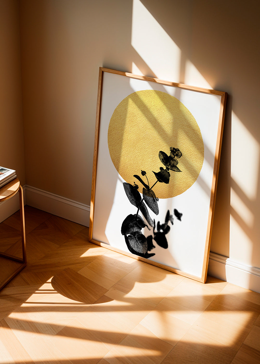 Aquí tienes una ilustración abstracta con tonos amarillos, blancos y negros. En ella se representa el sol y una planta, y es obra del artista Kubistik.