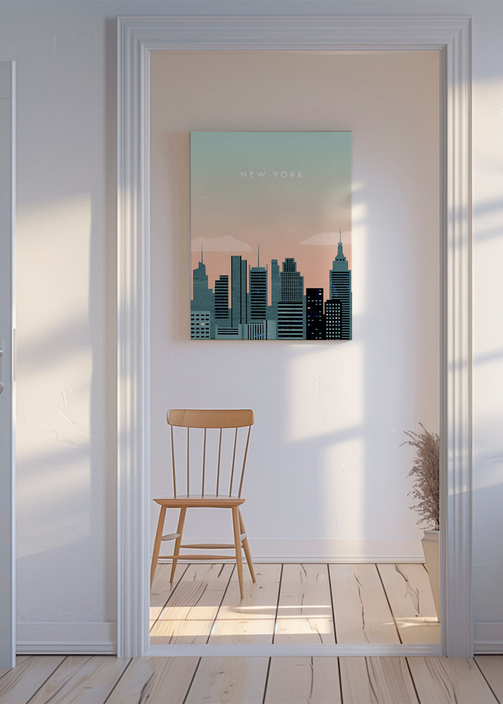 Esta pieza de nuestra selección de cuadros de rascacielos, perteneciente a la colección de Katinka Reinke, en tonalidades de colores azules, y para colgar en posición vertical. Combina skylines, fotografías y mapas de ciudades para crear una composición solo apta para viajeros. Frescura y originalidad.