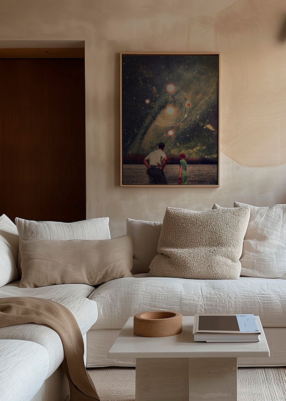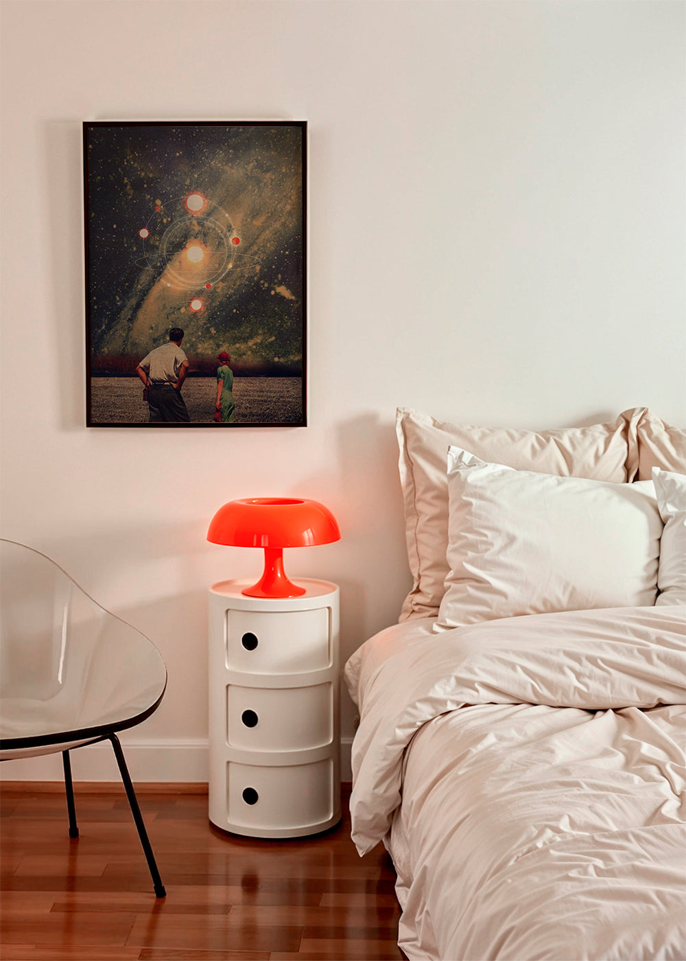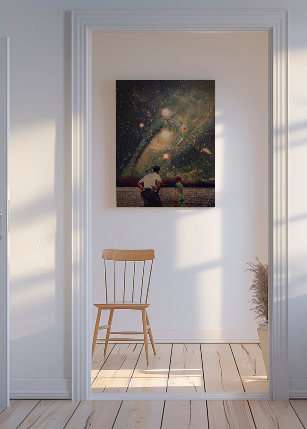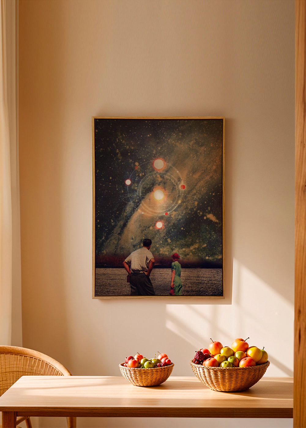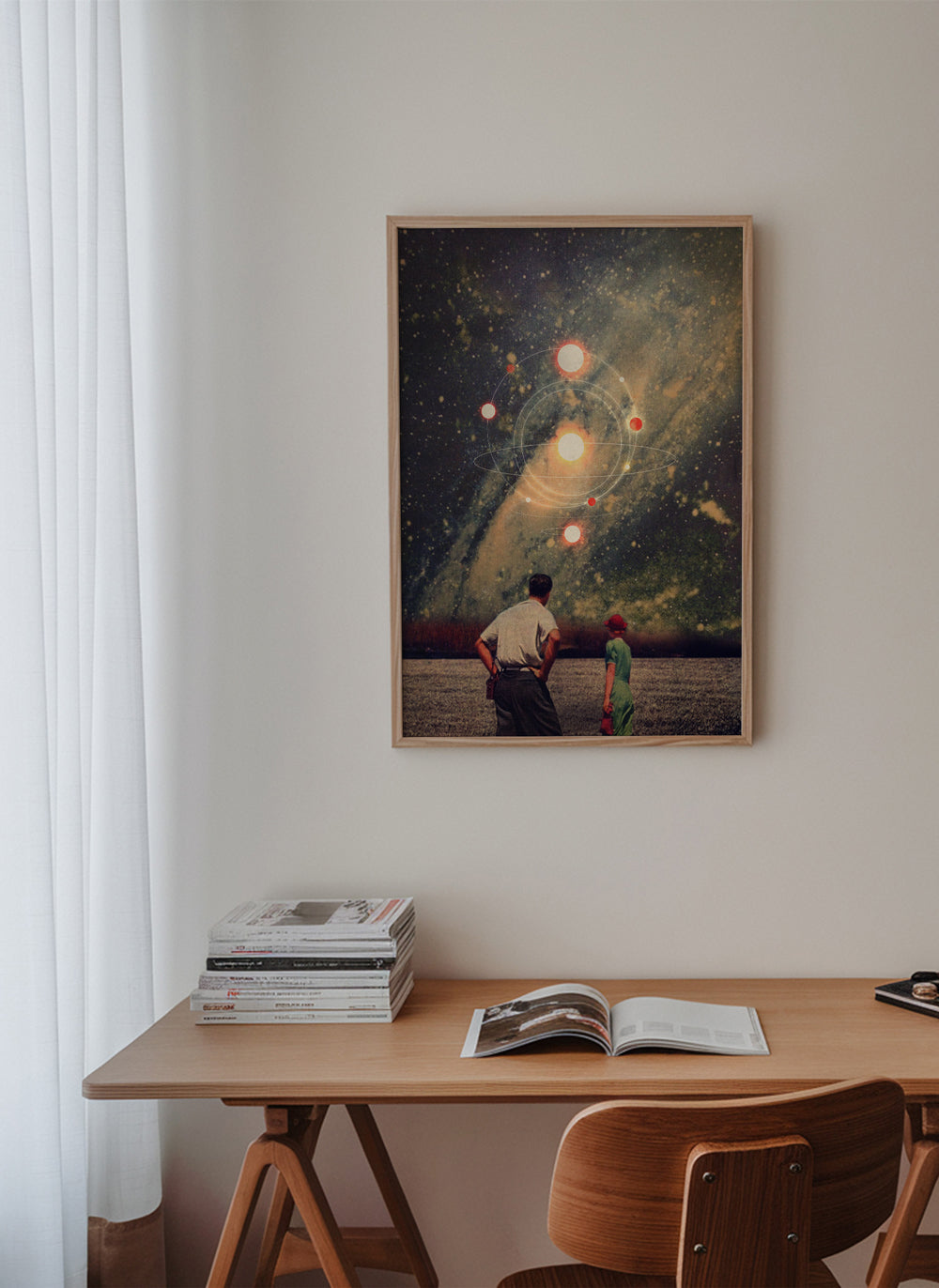 Un póster de nuestro conjunto de cuadros de planetas, de la mano de Frank Moth, con toques azules, y orientada en vertical. Una obra de estilo retro ideal para una decoración con toques vintage. Construye rinconcitos llenos de arte.