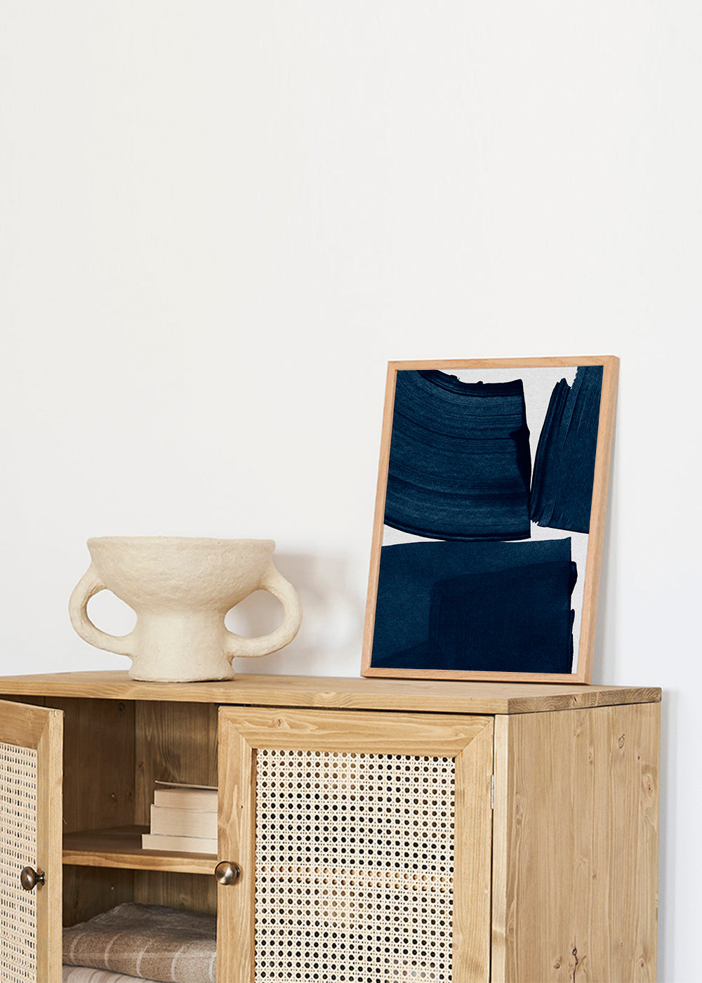 Una lámina perteneciente a la categoría de cuadros con pincel, que nos presenta Orara Studio, con toques azules, y para colgar en posición vertical. Las formas geométricas y abstractas ayudan a crear un ambiente desenfadado y creativo. Paredes elegantes para hogares chic.