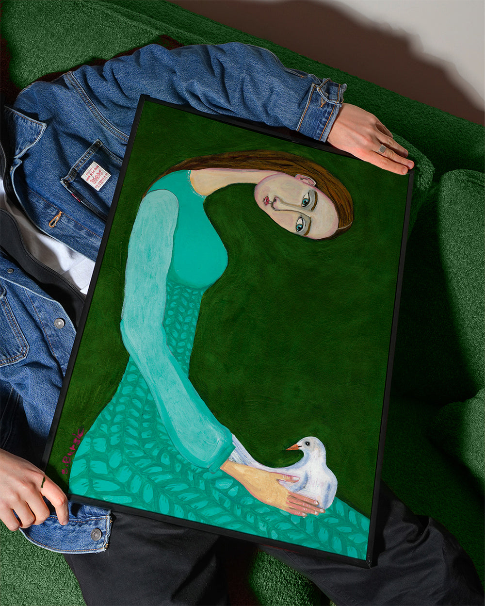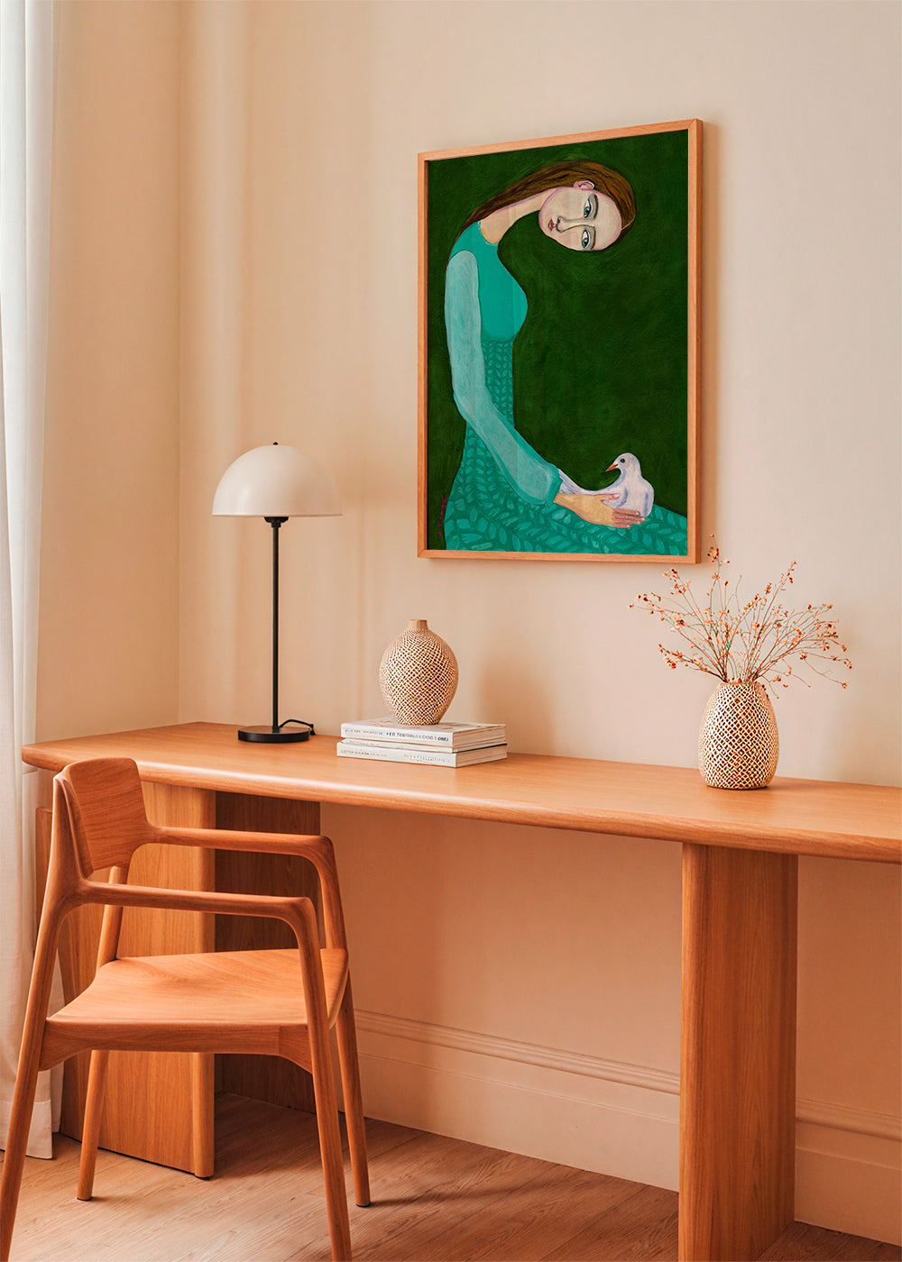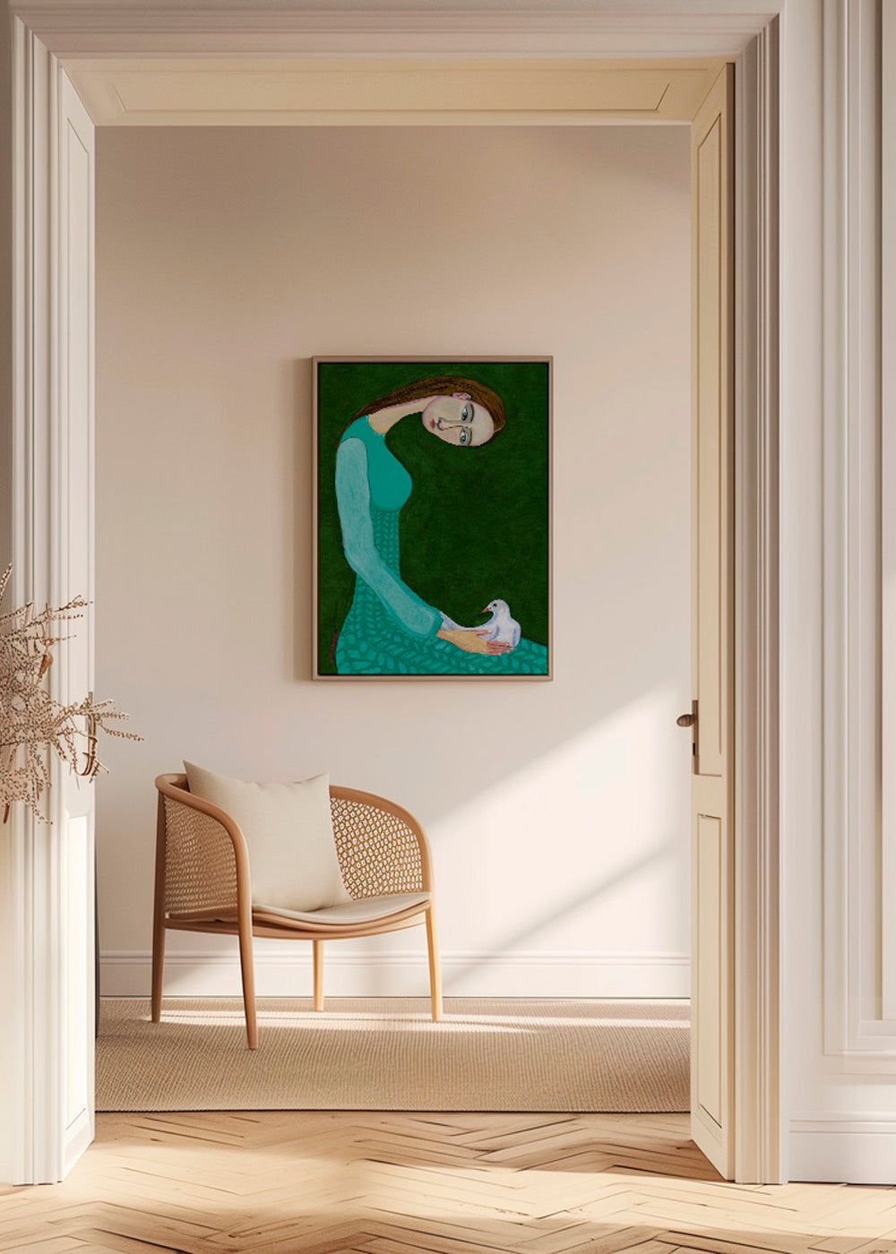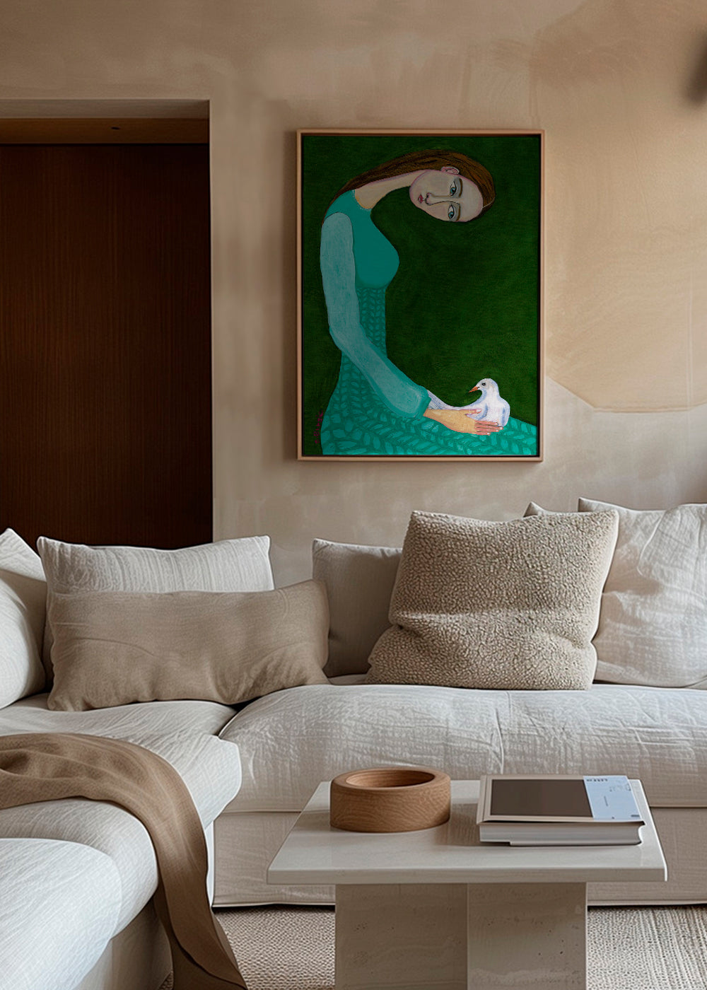 Cuadro minimalista Lady sitting with white dove bird woman - Sharyn Bursic
