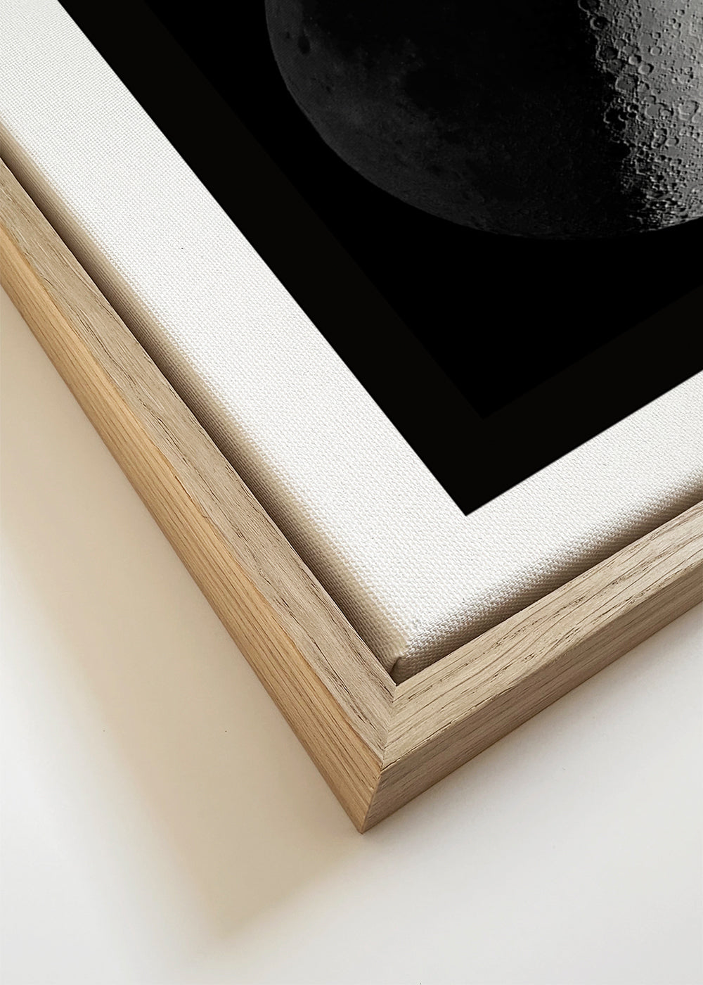 Si seleccionas la opción passepartout, añadiremos el recuadro de cartón blanco al marco, y reduciremos el diseño de la obra. Por ejemplo, si seleccionas una lámina de tamaño 50x70, con marco de color roble y passepartout, reduciremos el diseño de la lámina al tamaño anterior (40x50cm). De esta manera, se adaptará perfectamente a la ventana interior del passepartout.