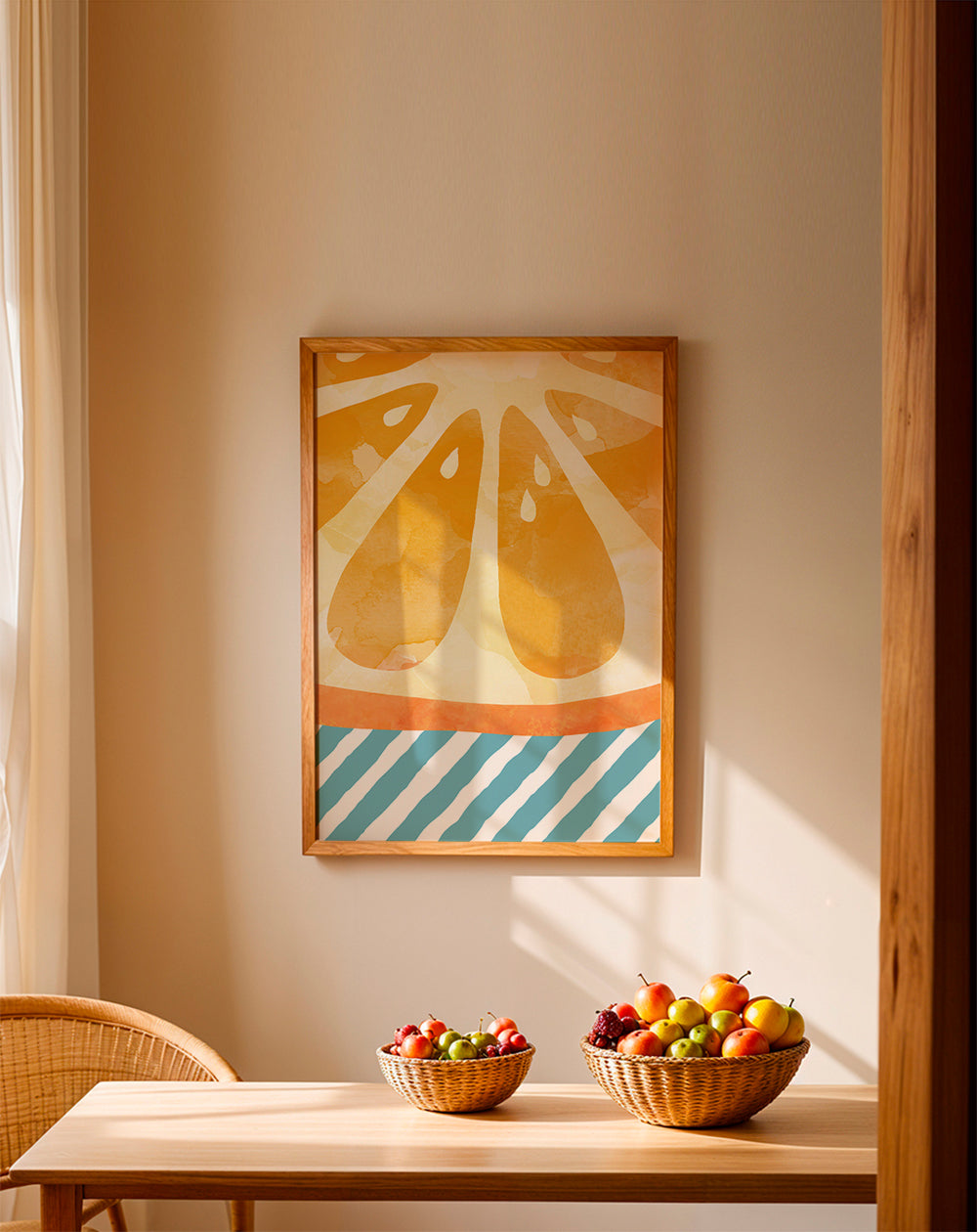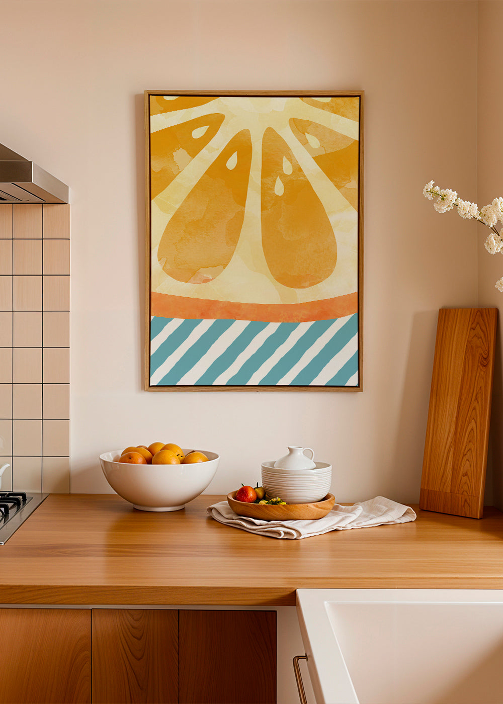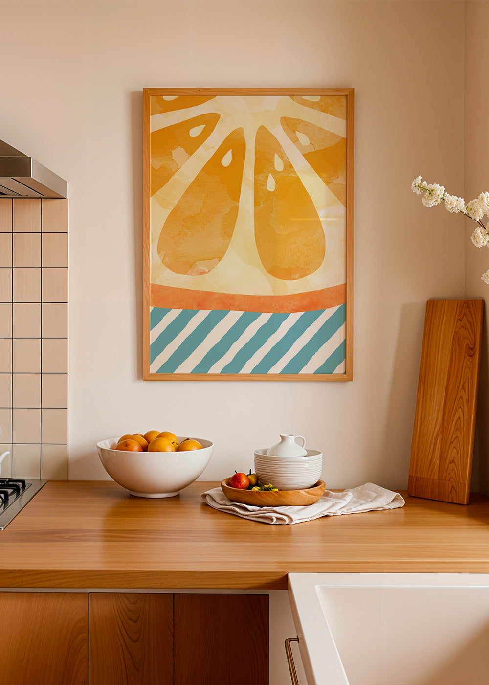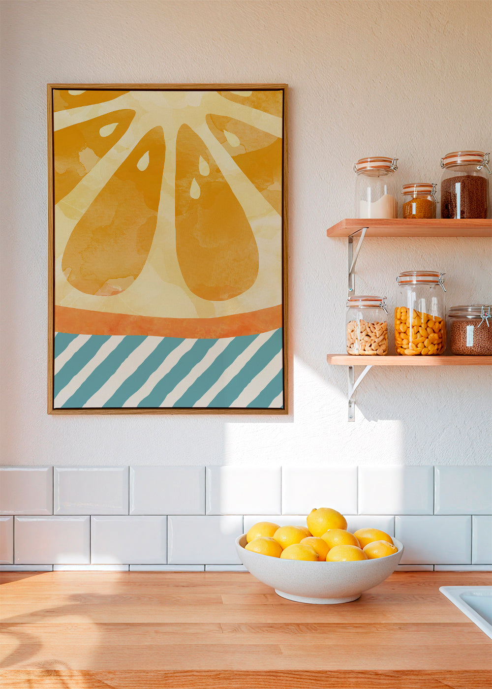 Una bonita lámina para la cocina con tonos naranjas y azules que darán alegría a aquel rincón que tu elijas.