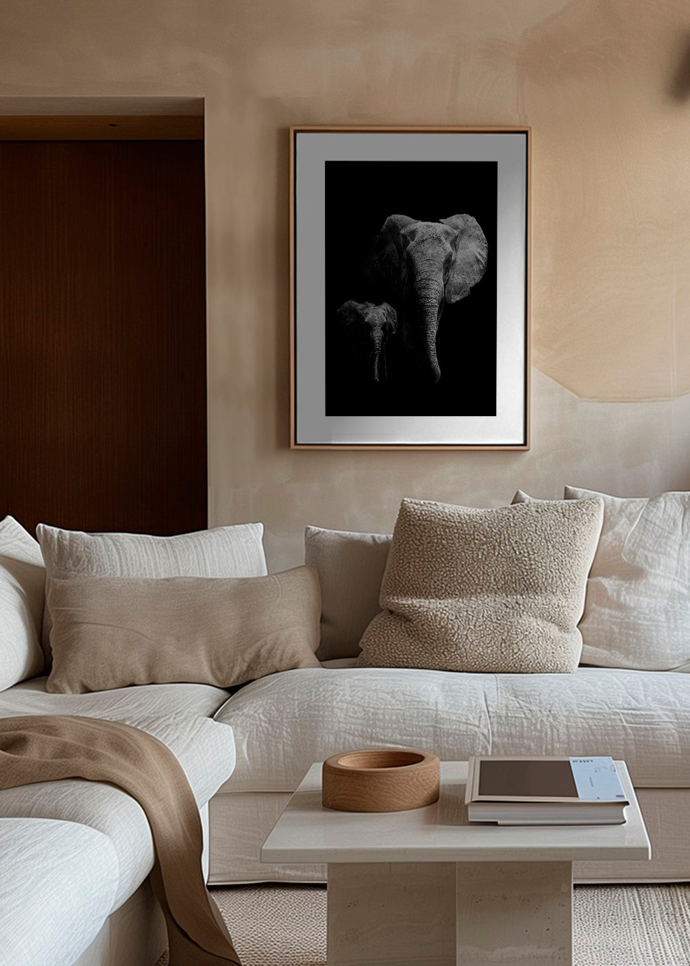 Un diseño de nuestro conjunto de cuadros de elefantes, con matices de colores monocromáticos, y en formato vertical. Se trata de una obra ideal para los amantes de los animales. Combínala con otros cuadros de animales para crear una composición maravillosa. Viste las paredes de tu hogar. Esta obra incluye un margen blanco que enmarca el diseño para potenciar su estilo.