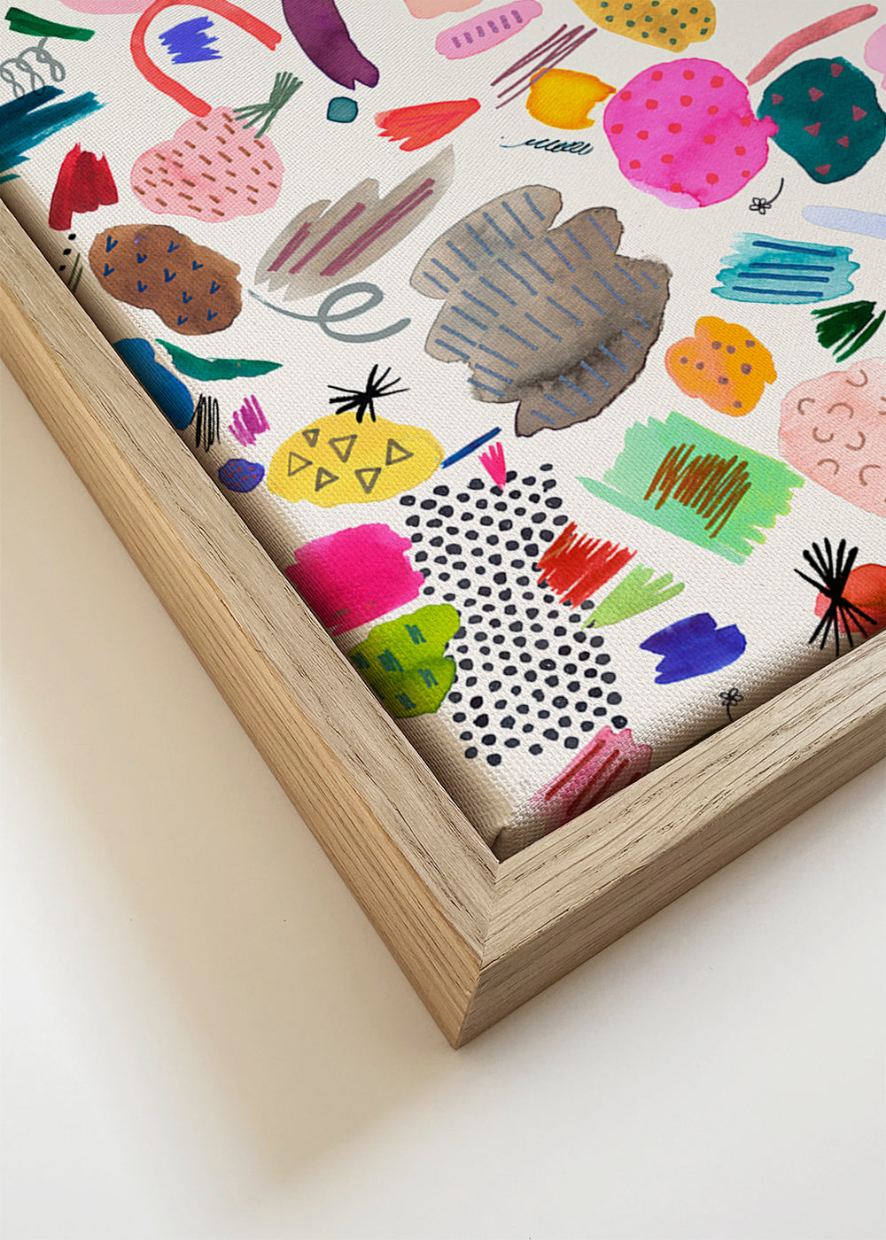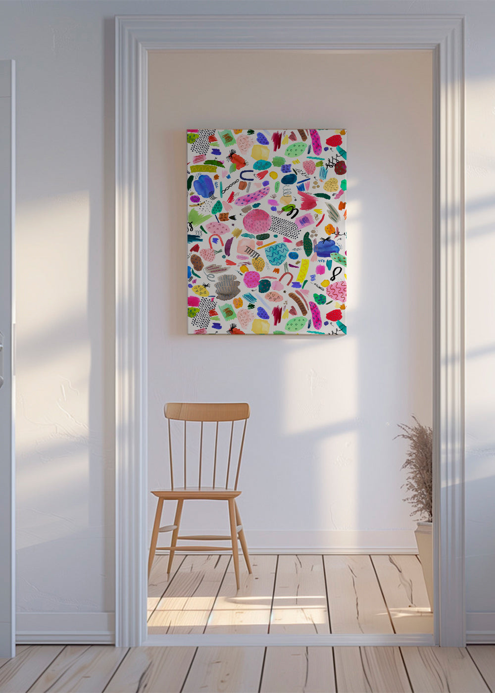Una lámina con inspiración en nuestra colección de cuadros de estampados, de la colección de Ninola Design, con matices de tonos multicolor, y de disposición vertical. De líneas y formas suaves propias de los cuadros nórdicos, una obra ideal para espacios sencillos y funcionales. Dales vida a las paredes de tu casa.