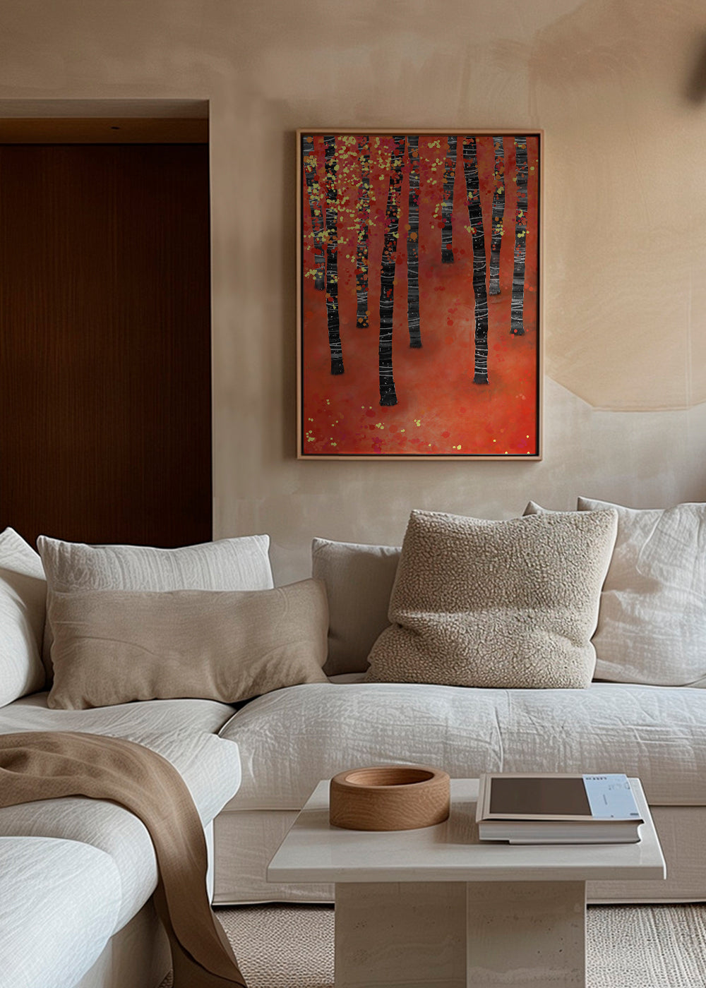 Un cuadro del estilo de nuestros cuadros de estilo nórdico, del artista Nic Squirrell, con pigmentos rojos, y para colgar en posición vertical. El arte minimalista aporta tranquilidad y armonía al interiorismo del hogar El cuadro que esa pared está esperando.