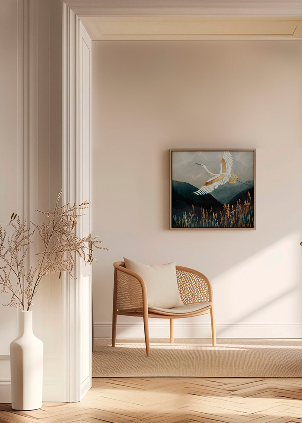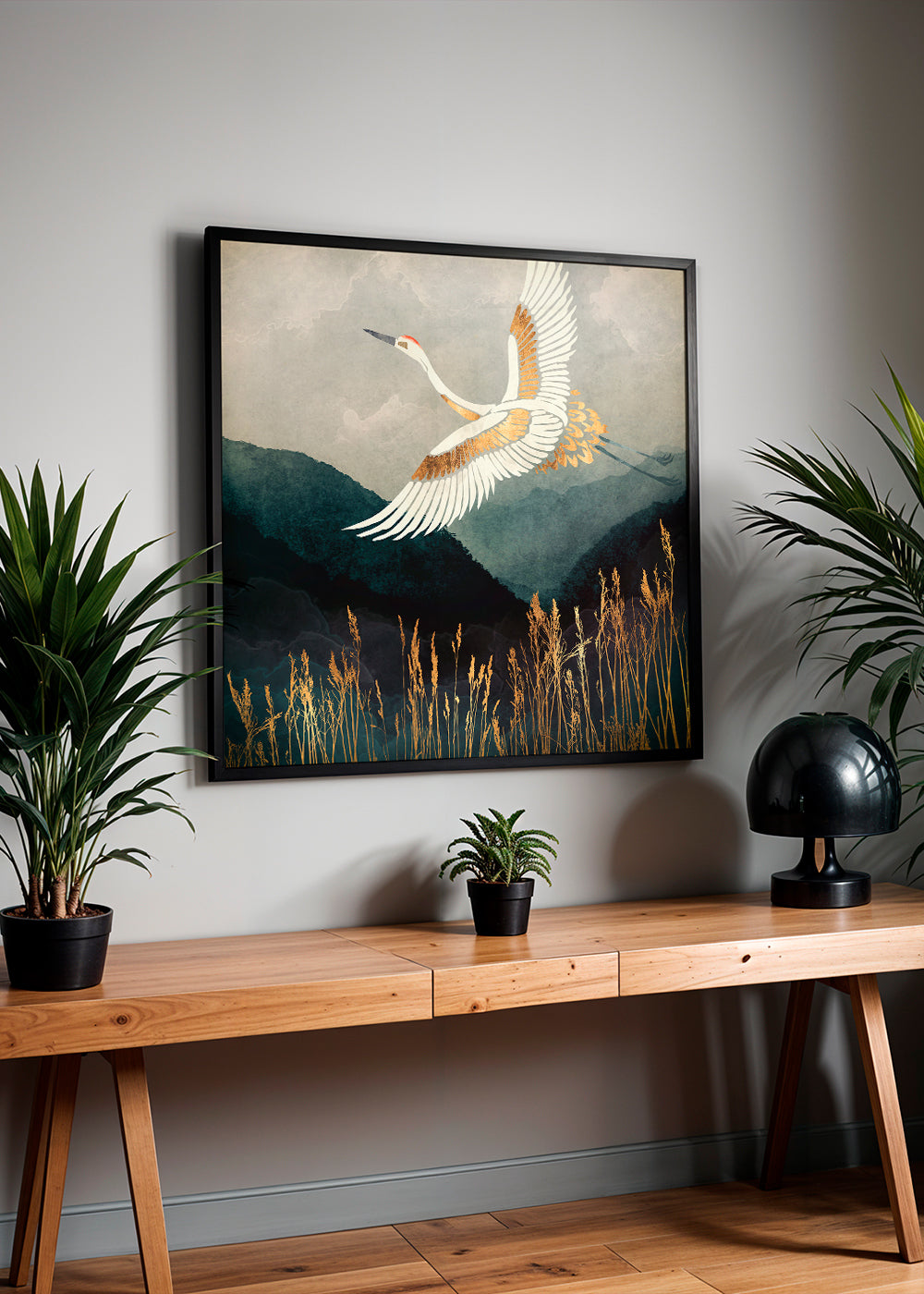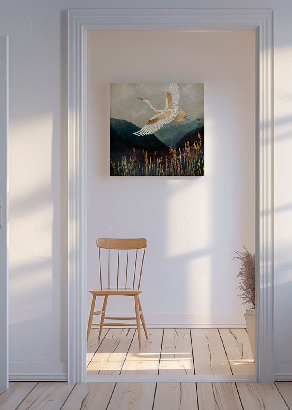 Un cuadro de nuestro repertorio de cuadros de pájaros, perteneciente a la colección de SpaceFrog Designs, en tonos verdes. La tranquilidad y libertad que transmiten los cuadros de paisajes es única. Un nuevo look en tus paredes puede dar un aire nuevo a toda la decoración.