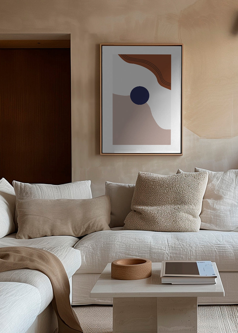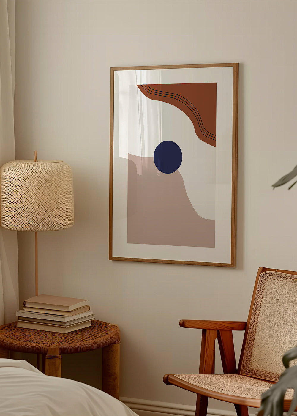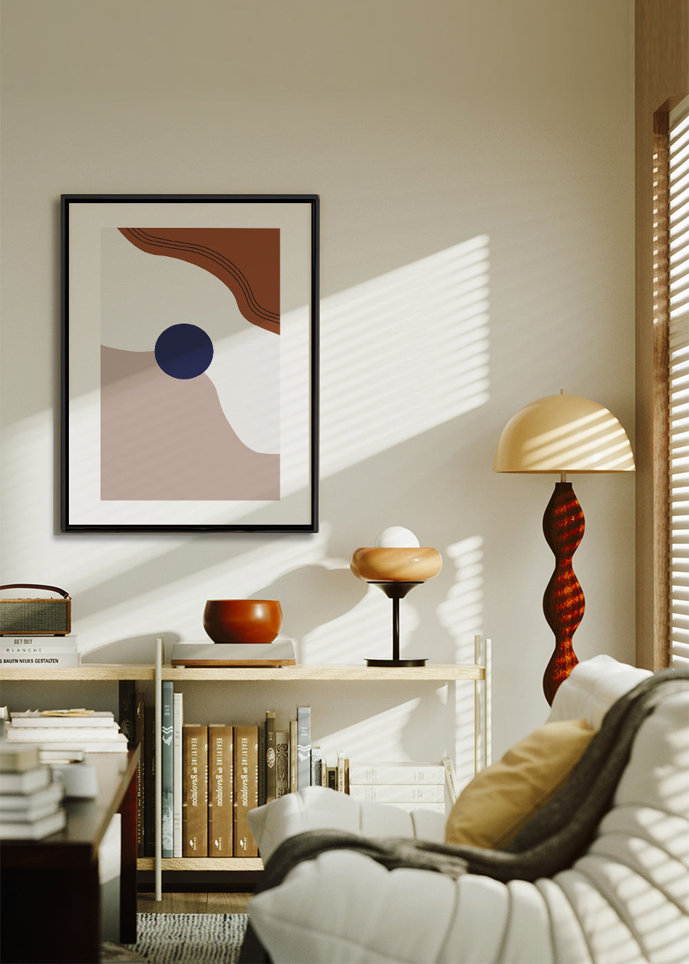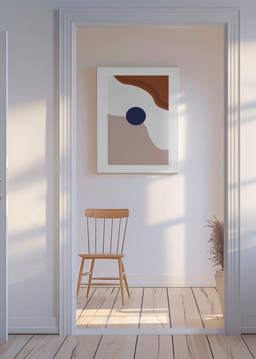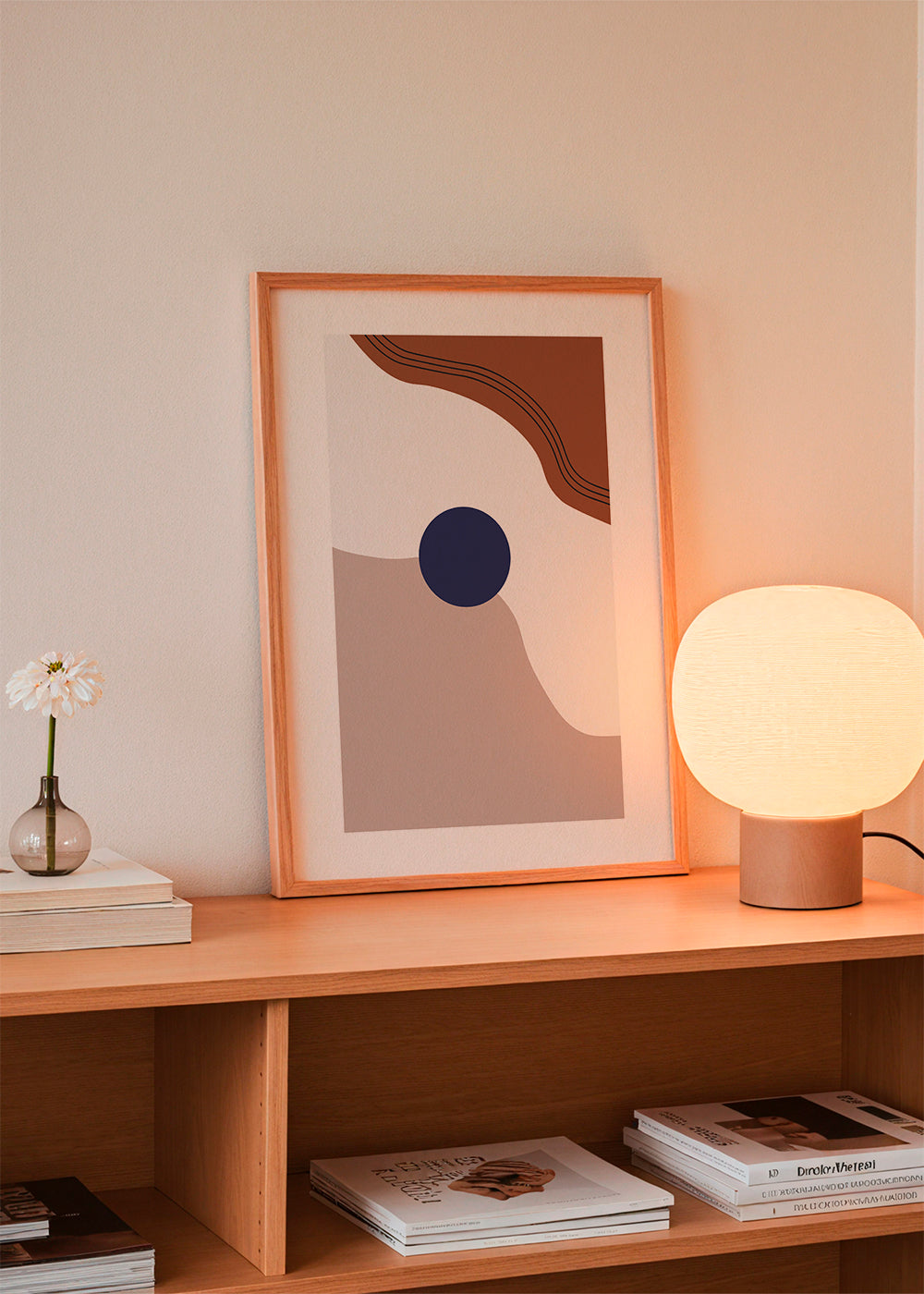 Un diseño con inspiración en nuestra colección de cuadros geométricos, creada por Studio Krone Kern, con tonos marrones, y para colocar en posición vertical. Las formas geométricas y abstractas ayudan a crear un ambiente desenfadado y creativo. Llena tus paredes de arte. El margen blanco que envuelve a la imagen potencia la expresividad de la obra.