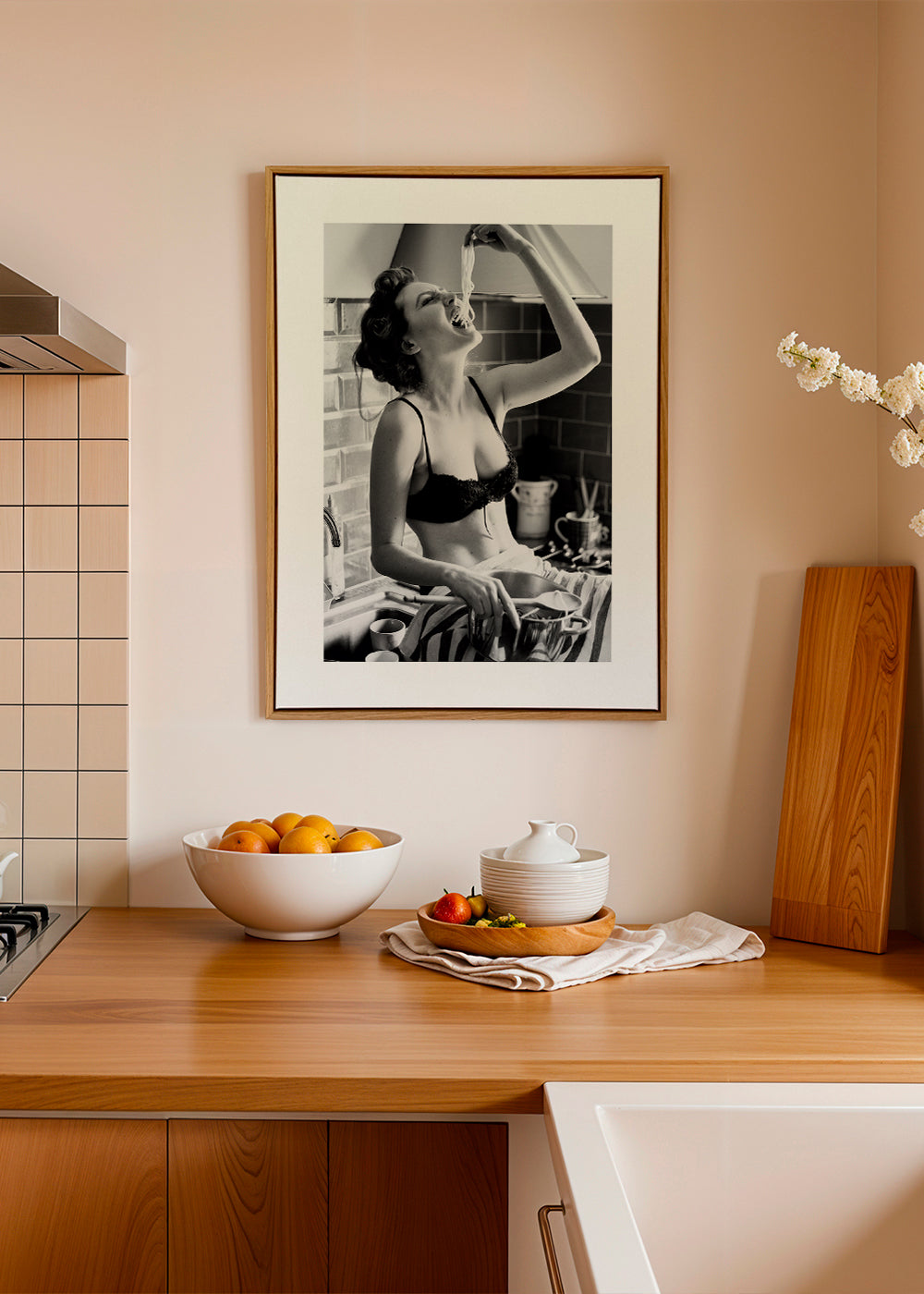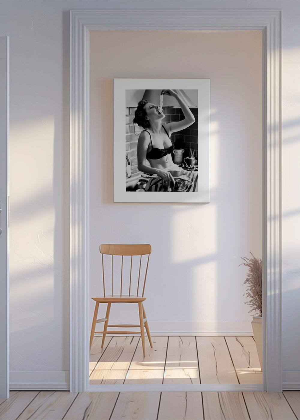 Una lámina de nuestro conjunto de cuadros de mujeres, en tonos monocromáticos, y para colocar en posición vertical. Los cuadros en blanco y negro quedan bien prácticamente con cualquier decoración. Un hogar se viste por las paredes.