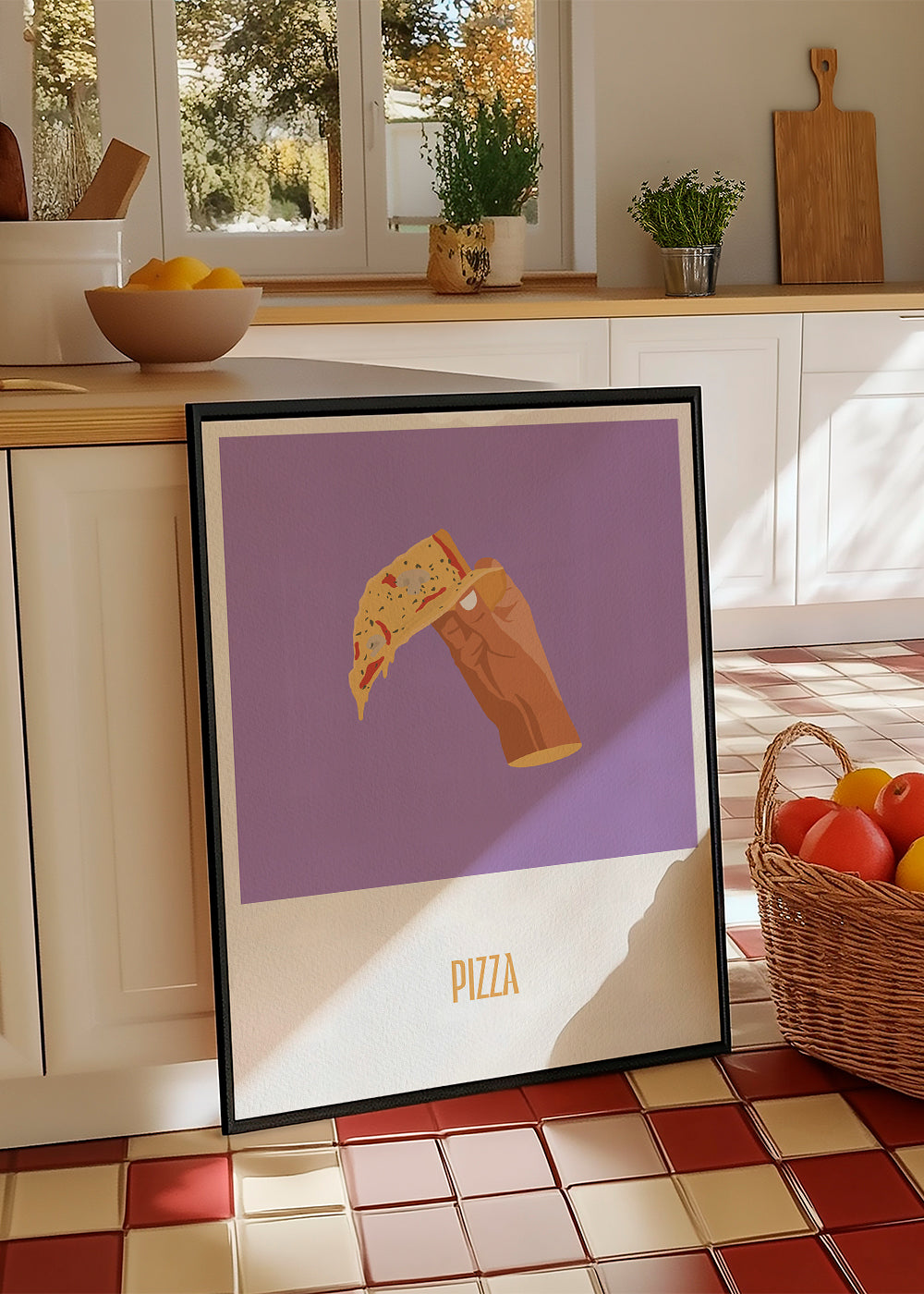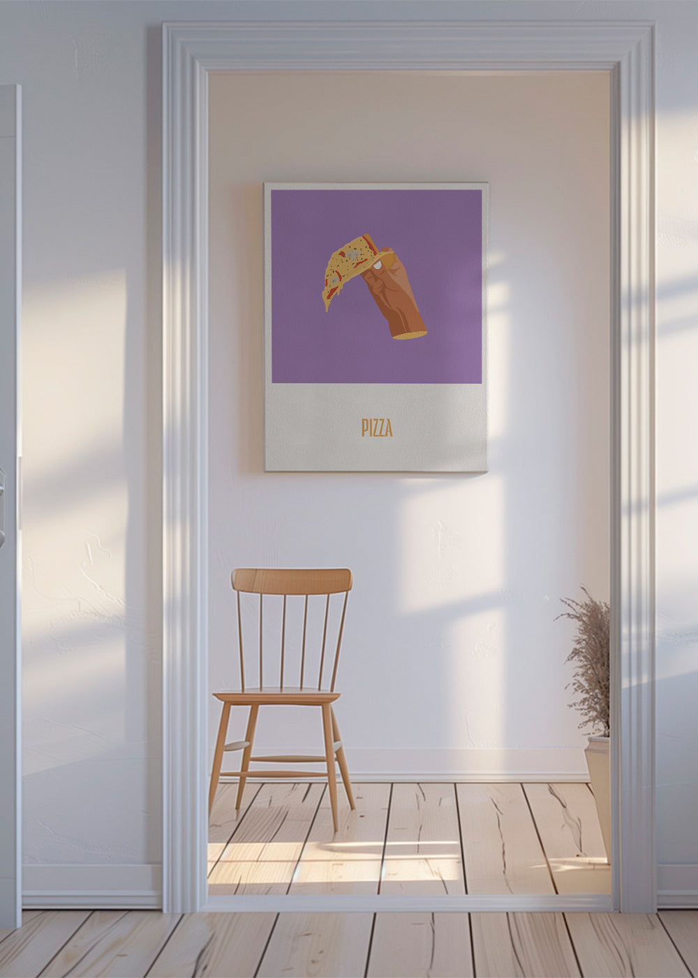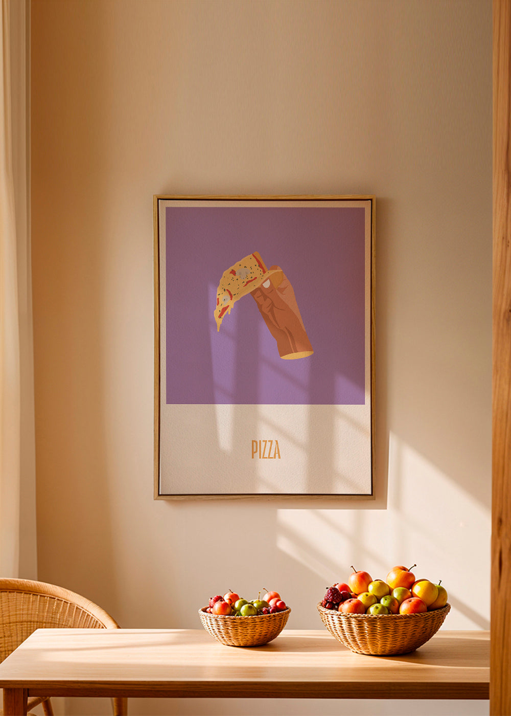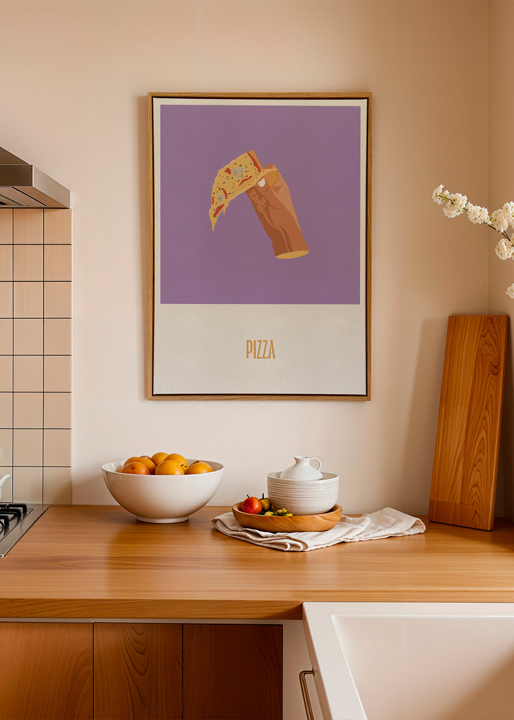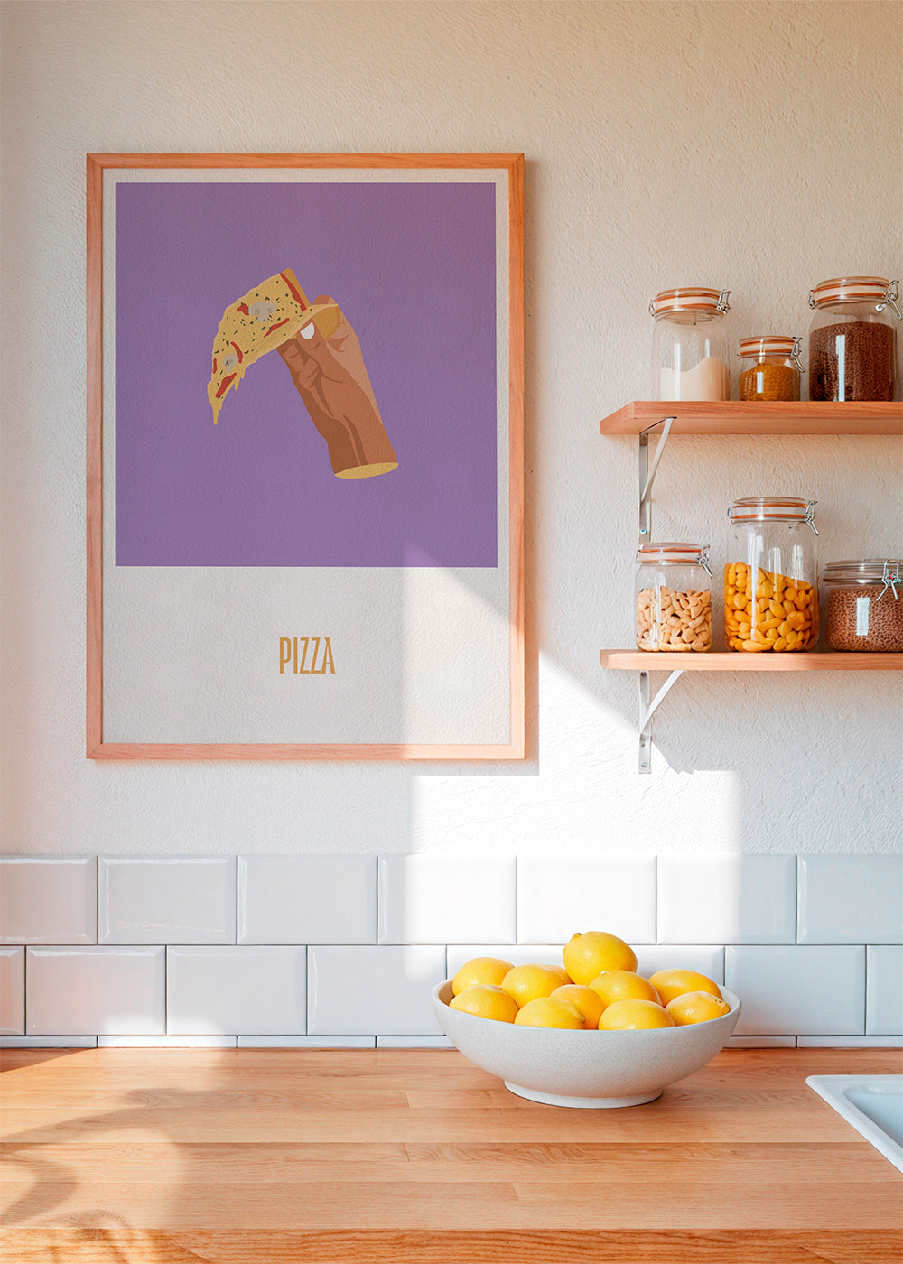 Bonito cuadro de la serie de cuadros de pizza, de la colección de Nerea Ramírez, en tonos violetas, y en formato vertical. Se trata de una obra ideal para decorar la cocina de tu hogar. Crea el ambiente perfecto.