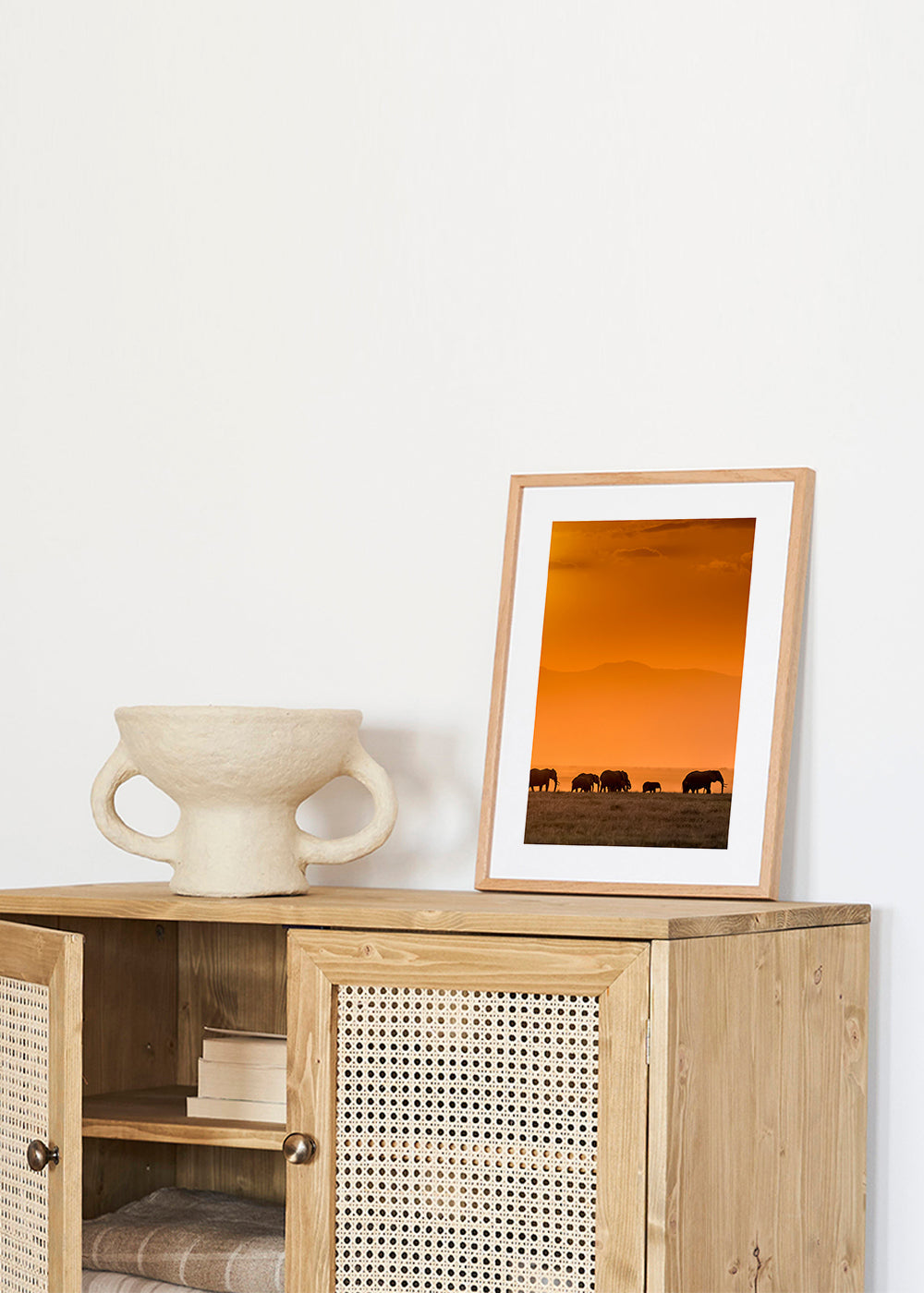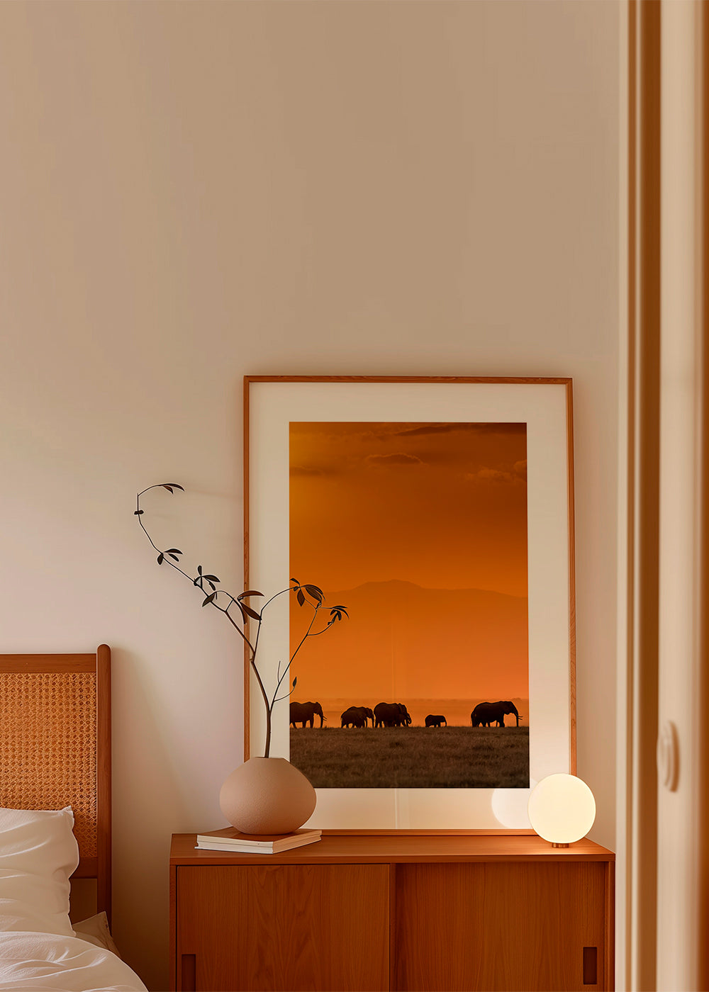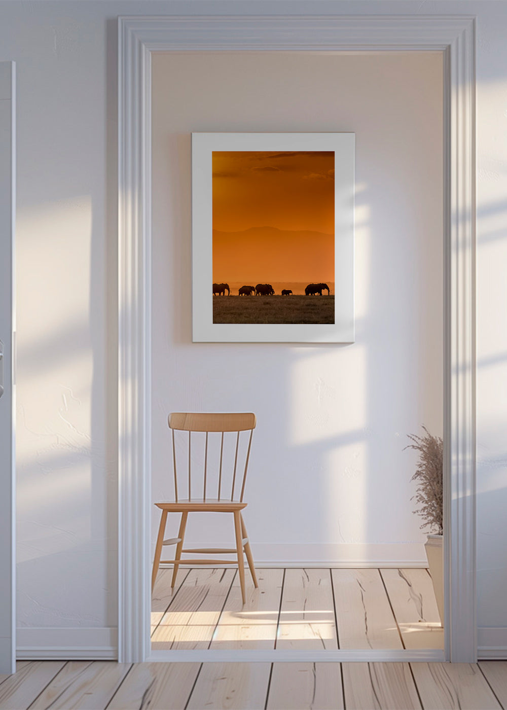 Un póster de nuestra colección de cuadros de elefantes, con matices de colores amarillos, y de formato vertical. Se trata de una obra ideal para los amantes de los animales. Combínala con otros cuadros de animales para crear una composición maravillosa. Un diseño precioso a la altura de tu decoración. El diseño incluye un margen blanco que añade contraste a la obra.