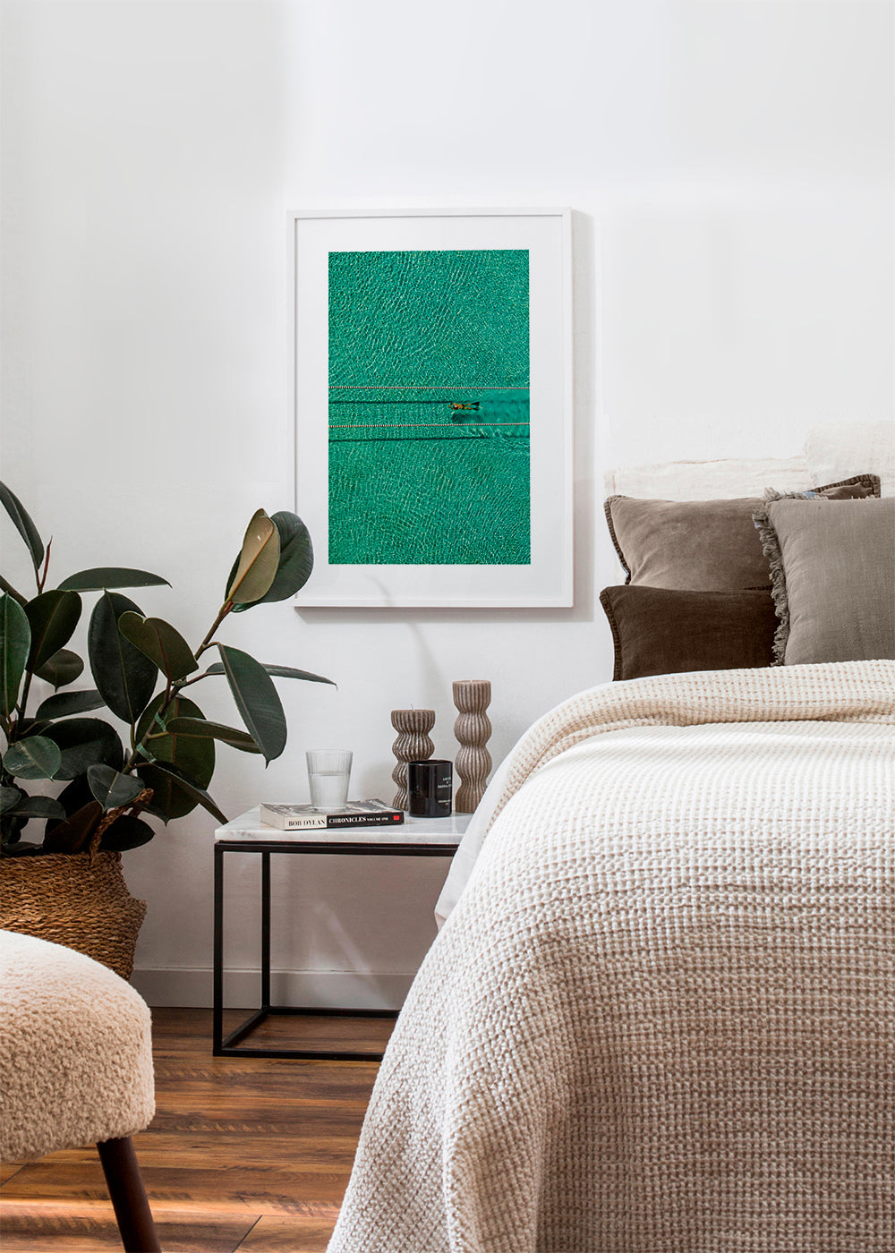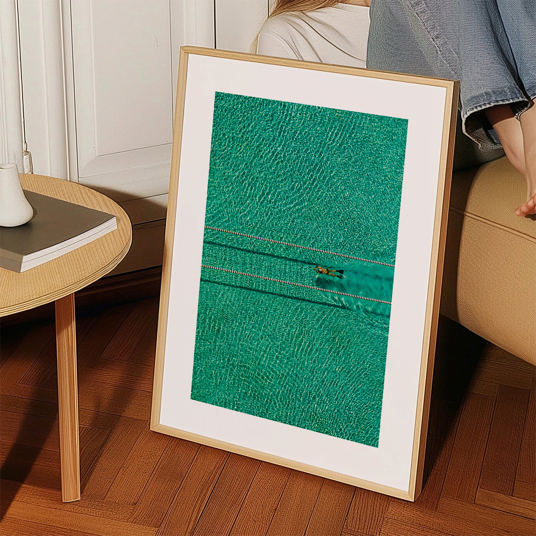 Un póster del estilo de nuestros cuadros de natación, de matices azules, y de disposición vertical. Esta fotografía aporta diseño al interiorismo del hogar. Puedes combinarla con otras fotografías ideales para enmarcar y crear una composición de fotos artísticas. Añade un poco de arte a la decoración de tu hogar. El diseño incluye un margen blanco que añade contraste a la obra.